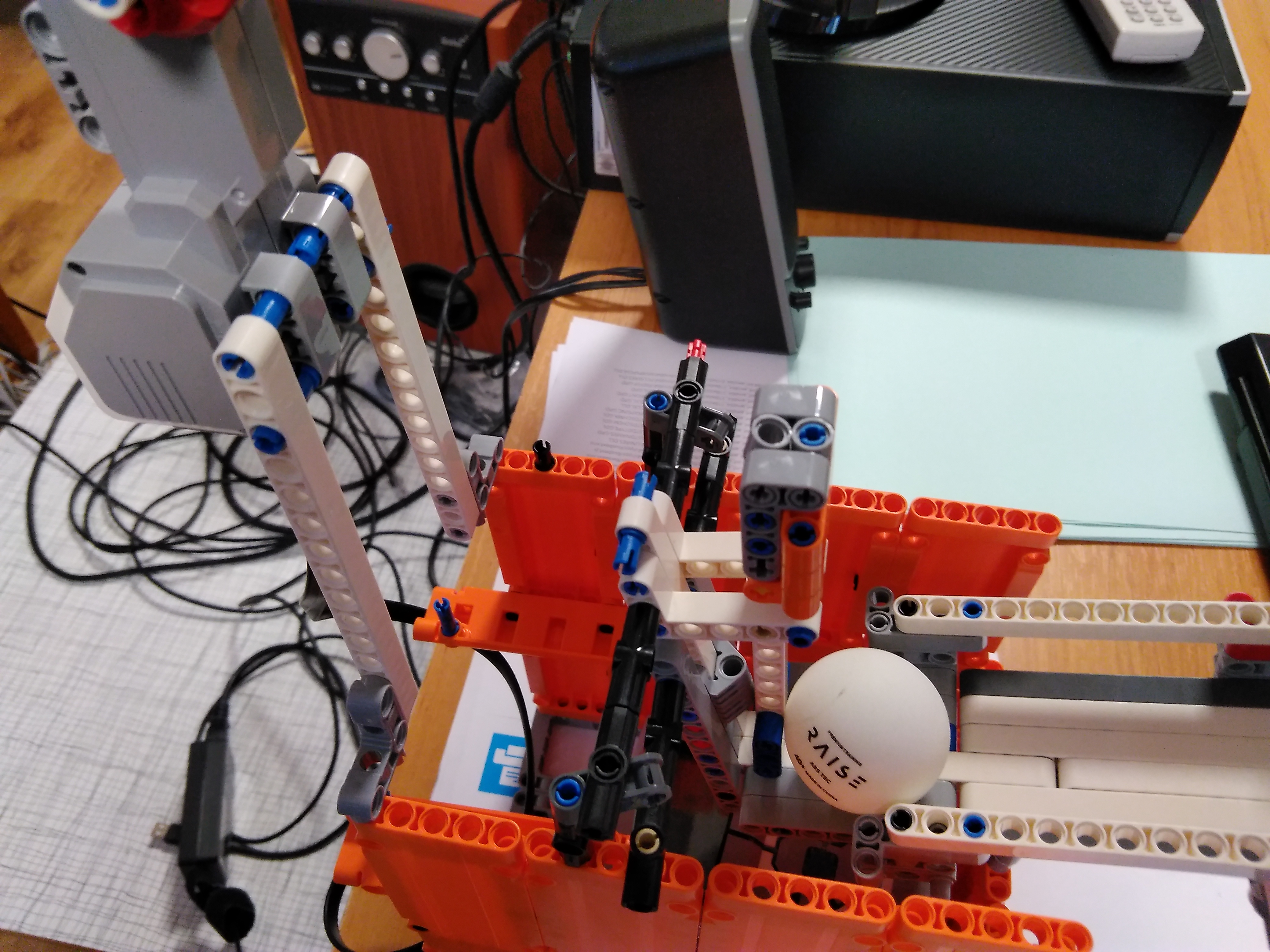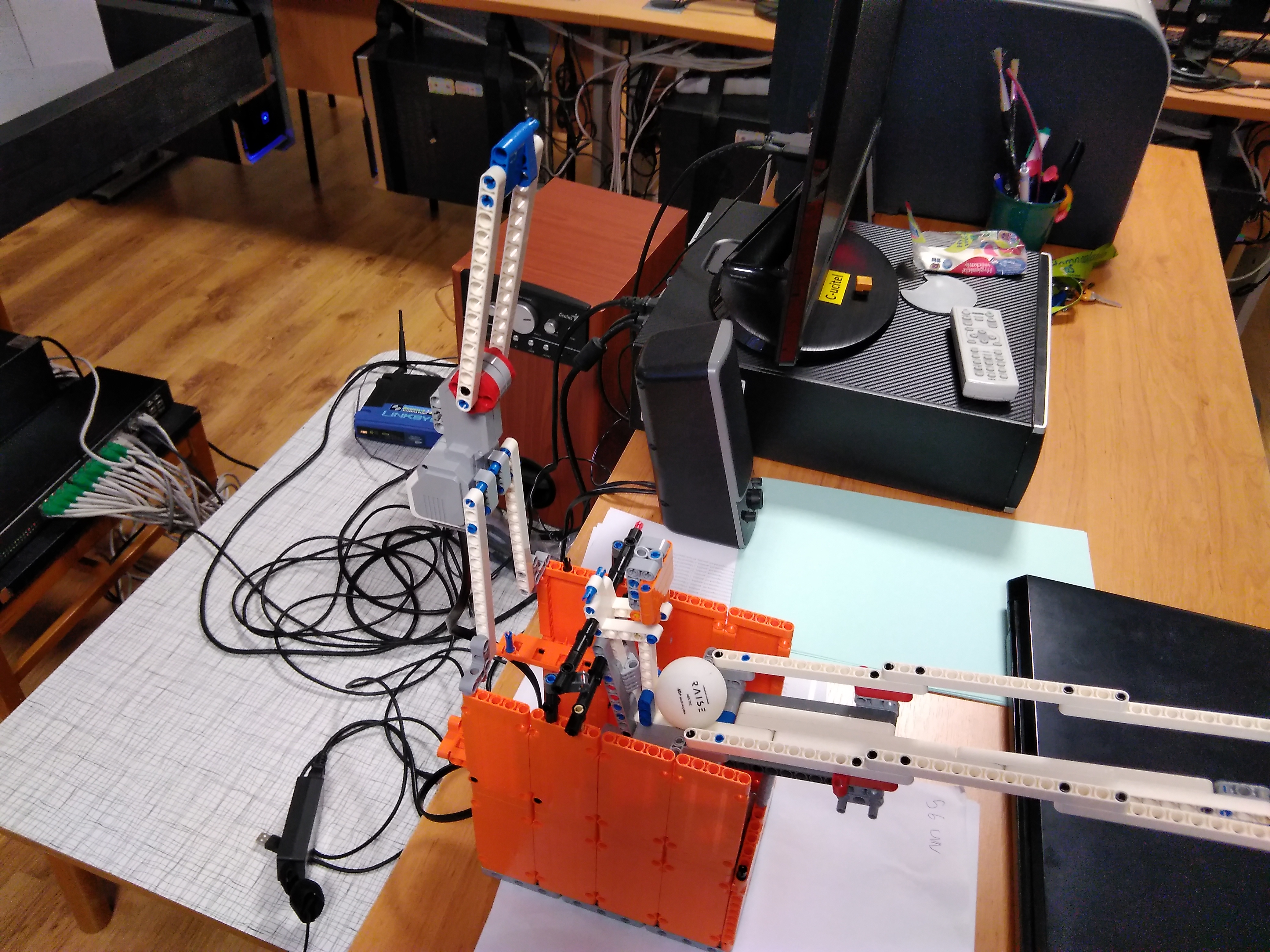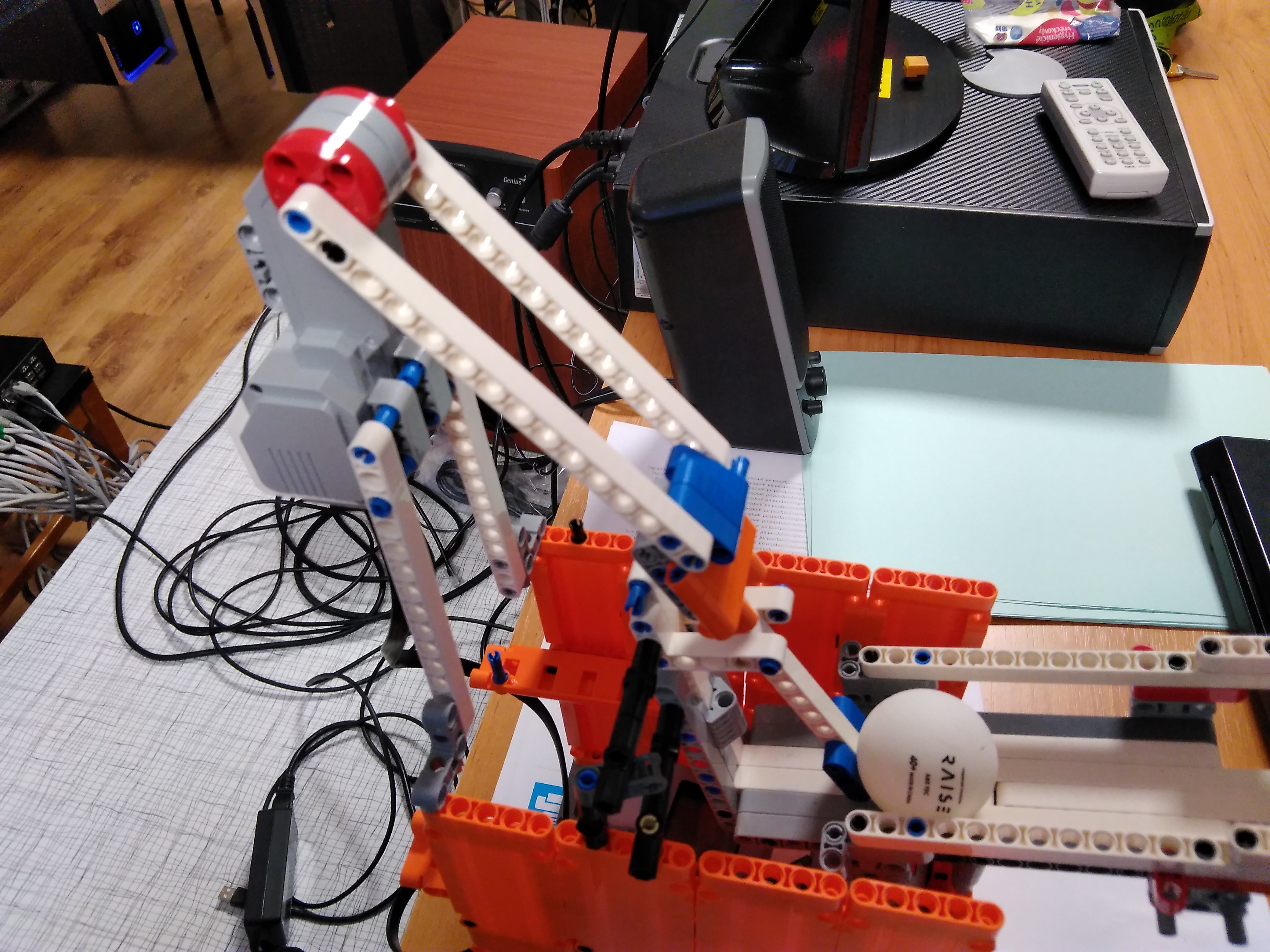 Ďakujeme, máme veľkú radosť. V tomto prípade už naozaj nikto nemôže tvrdiť, že by roboty brali ľuďom prácu. Tu naozaj jedného robota obsluhujú traja pracovníci :-) Jaj, škoda, že ste nenašli ping-pongovú raketu. My sme za mladých čias hrávali ping-pong aj s učebnicou zemepisu (tak sa vtedy volala geografia), aj keď dnes si už uvedomujeme, že ku knihám sa treba správať slušne :-). Tešíme sa na ďalšie riešenia! 1. Za úlohu Stolný tenis získavate 2.8b. Zostrojený robot bez problémov prestrelí loptočky za sieť stola stolného tenisu. Pridávanie loptičky do zásobníka ako aj otáčanie robota je manuálne. Odporúčam popis k riešeniu písať podrobnejšie. 2. Robot vystreľuje loptičky do dostatočnej vzdialenosti. V rôznych smeroch ich vystreľuje len pri pootočení robota. 3. Výborná konštrukcia aj prevedenie, škoda len, že sa robot nenatáča samostatne do rozličných strán. To by už bol skvelý tréner. Pri popise konštrukcie múžete napísať aj viac ako jednu vetu. 4. Veľmi pekný pokus. Ak by sme ale chceli "profi" trenažér na vystreľovanie loptičiek pre hráčov, potrebovali by sme trošku silnejší dostrel, zásobník na loptičky dostatočnej kapacity, ako aj schopnosť autonómne sa otáčať do náhodných smerov. Netreba zabúdať na kvalitný opis riešenia. Veľa zdaru pri riešení ďalších úloh!