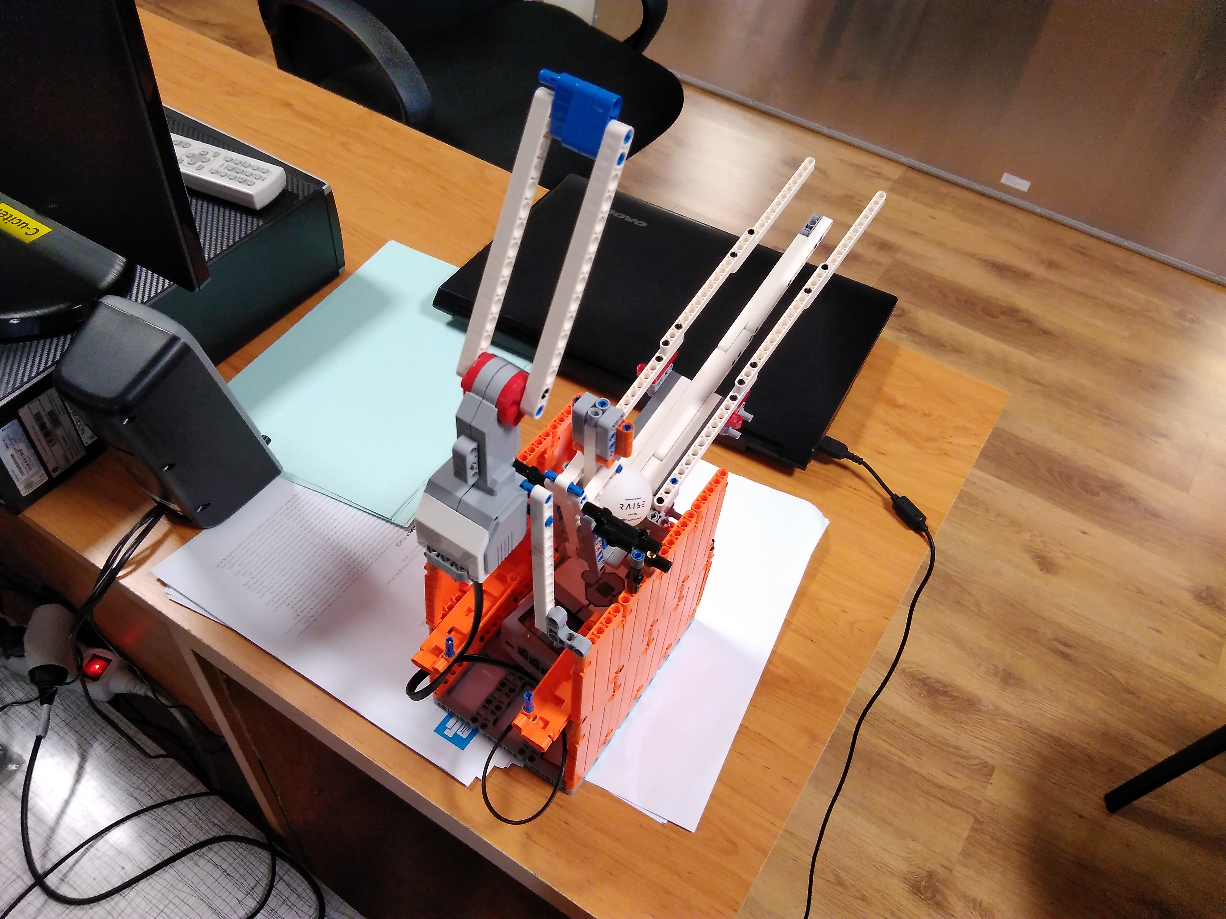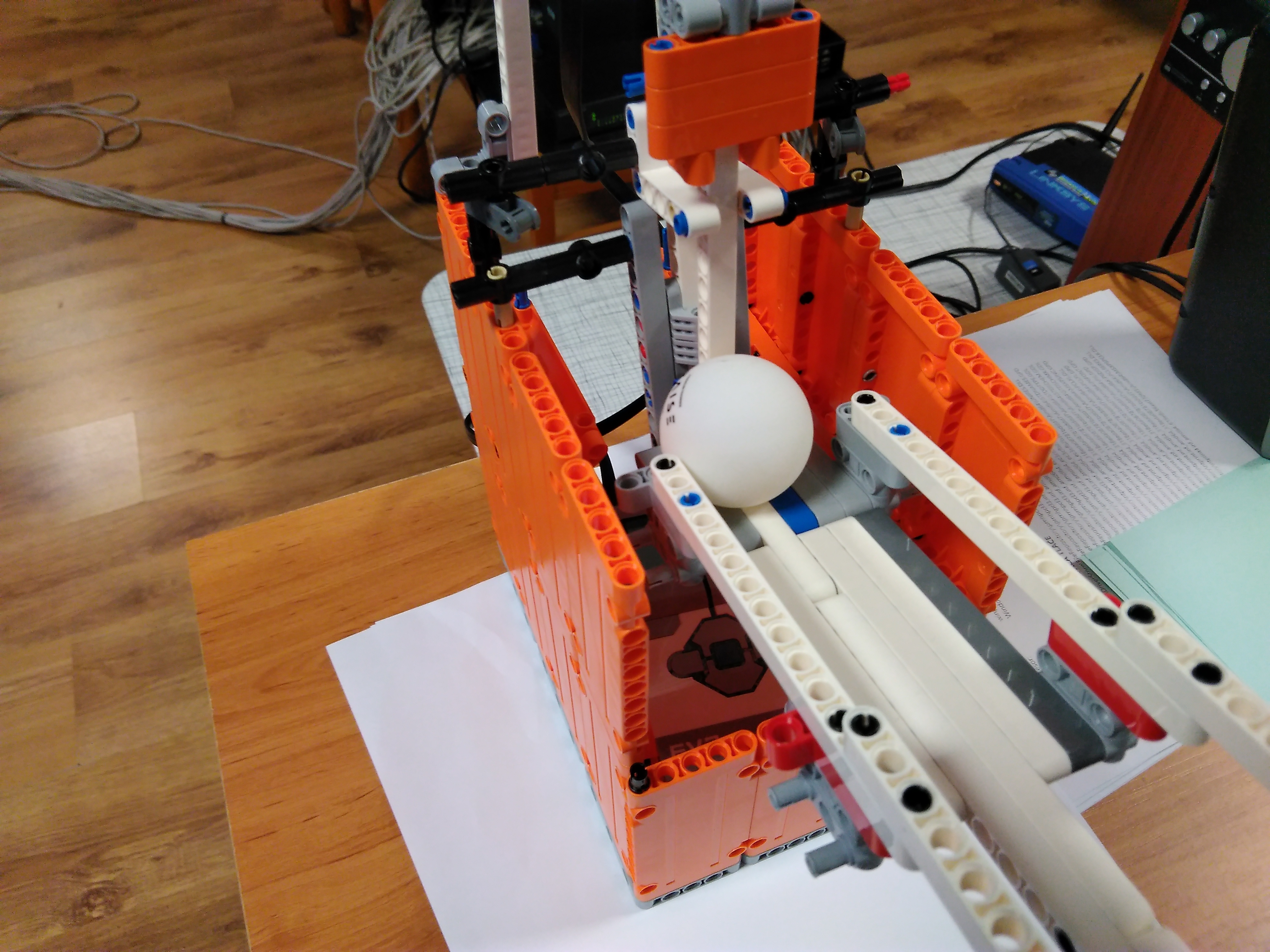 Naše riešenie vystreľuje 1 ping-pongovú loptičku, prístroj sa manuálne otáča. Pri konštrukcii sme vychádzali z misie M11 FLL 2018/19.