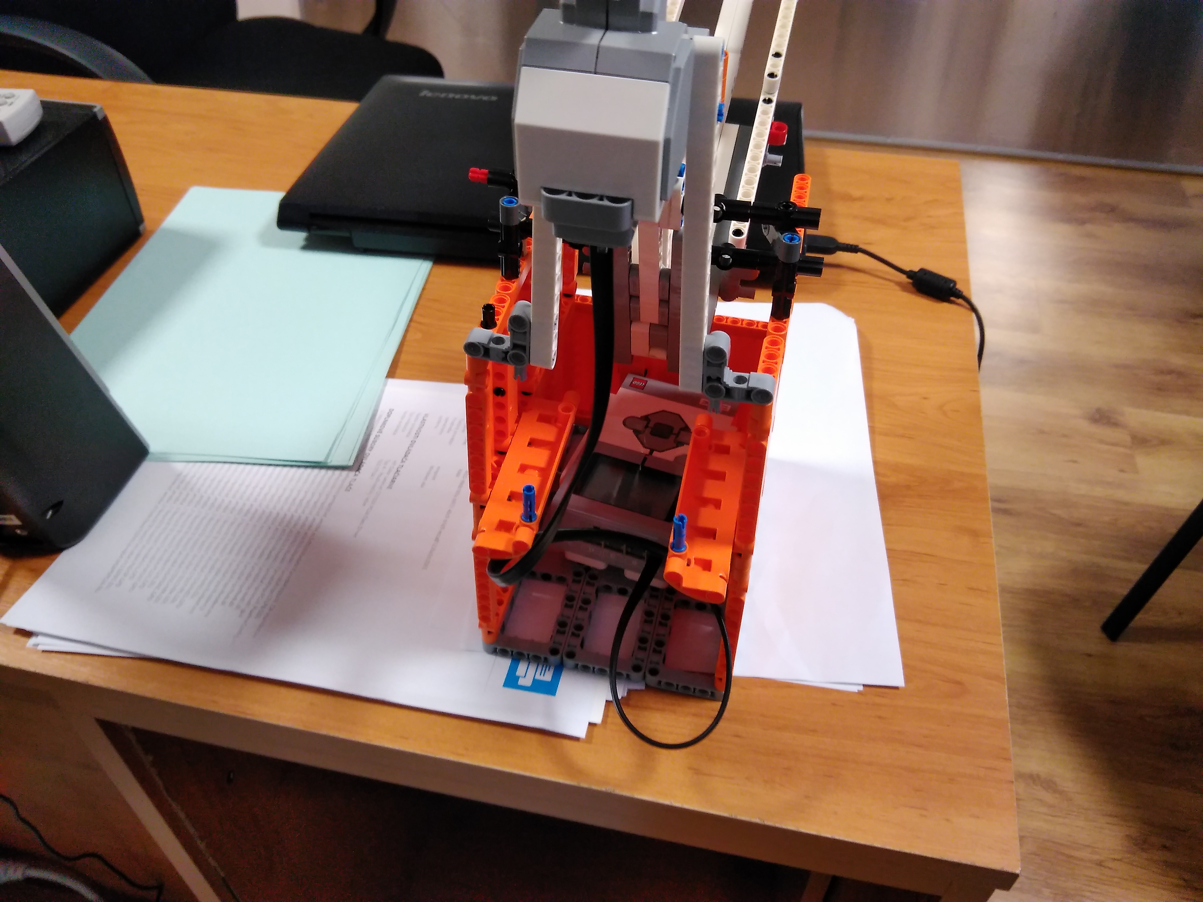 Hihi, pekné gesto na konci. Teoretický koncept nebol zlý, ale predsa len točiť celým motorom je náročnejšie. Pozrite si, ako si niektoré iné tímy vyrobili svoj vlastný otáčkový senzor! Riešenie ohodnotili rozhodcovia takto: 1. Za úlohu polohovacie zariadenie získavate 2.5b. Zostrojený robot využíva x-ovú a y-ovú os, na zákade ktorej sa zobrazuje bodka na displeji. Chýba Vám tímová fotka. Odporúčam podrobnejšie popísať riešenie úlohy. Je mi ľúto, že Vaša loptička nebola vhodná na riešenie úlohy. 2. Hodil by sa podrobnejší popis riešenia úlohy. Škoda, že otáčanie guličkou na videu nefungovalo, ale prstami ano. 3. Pri popise konštrukcie múžete napísať aj viac ako jednu vetu. Nápad ste mali dobrý, škoda len, že ste lepšie nepremysleli ten prenos sily z guličky. Skúsili ste aj väčšiu a ťažšiu guličku (nemusela byť z Lega!). Pomohlo by aj keby boli kolieska aj oproti tým dvom čo už máte. 4. Pekná práca.Využitie trackball-u by však mohlo byť zaujímavejšie.