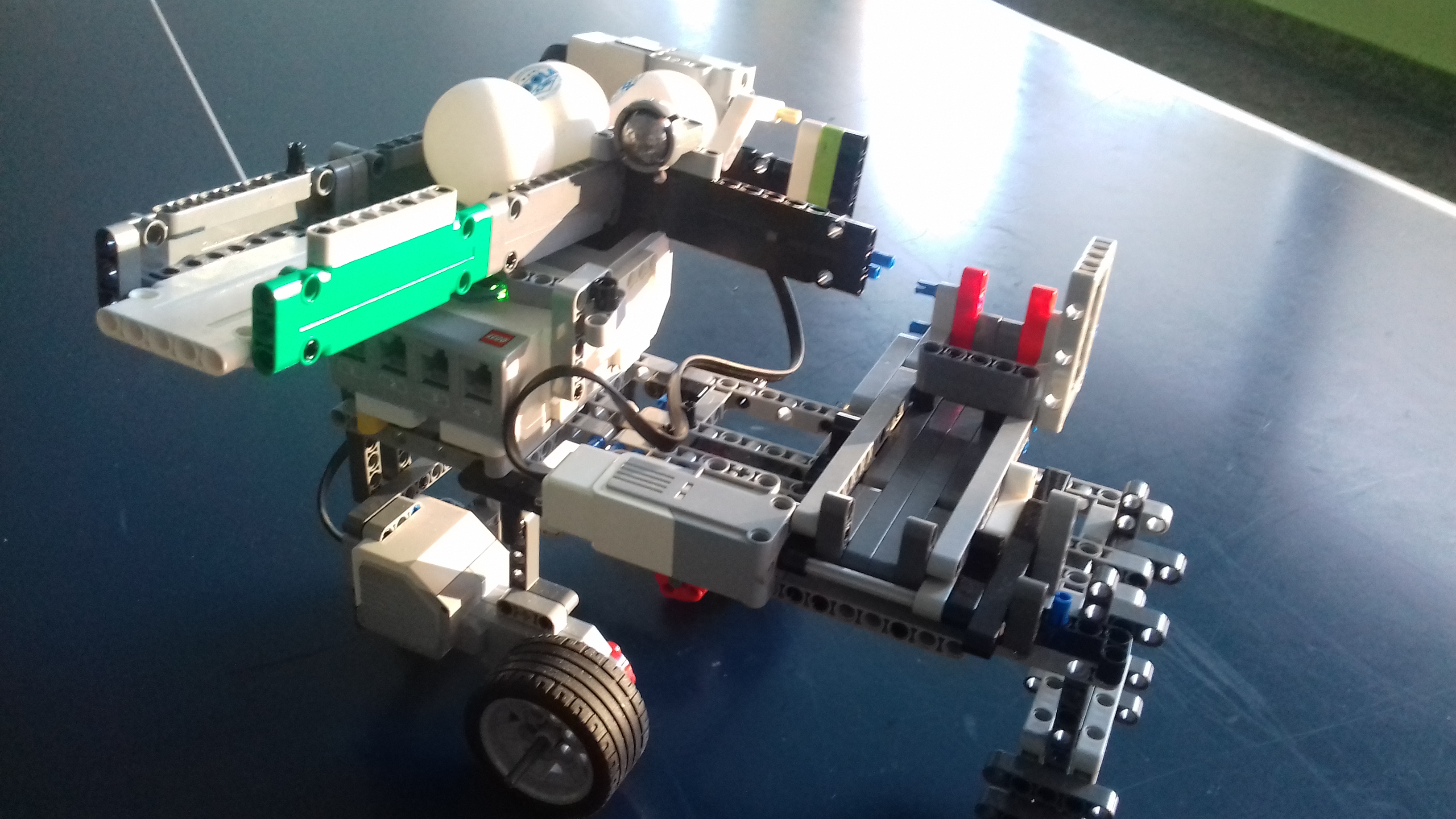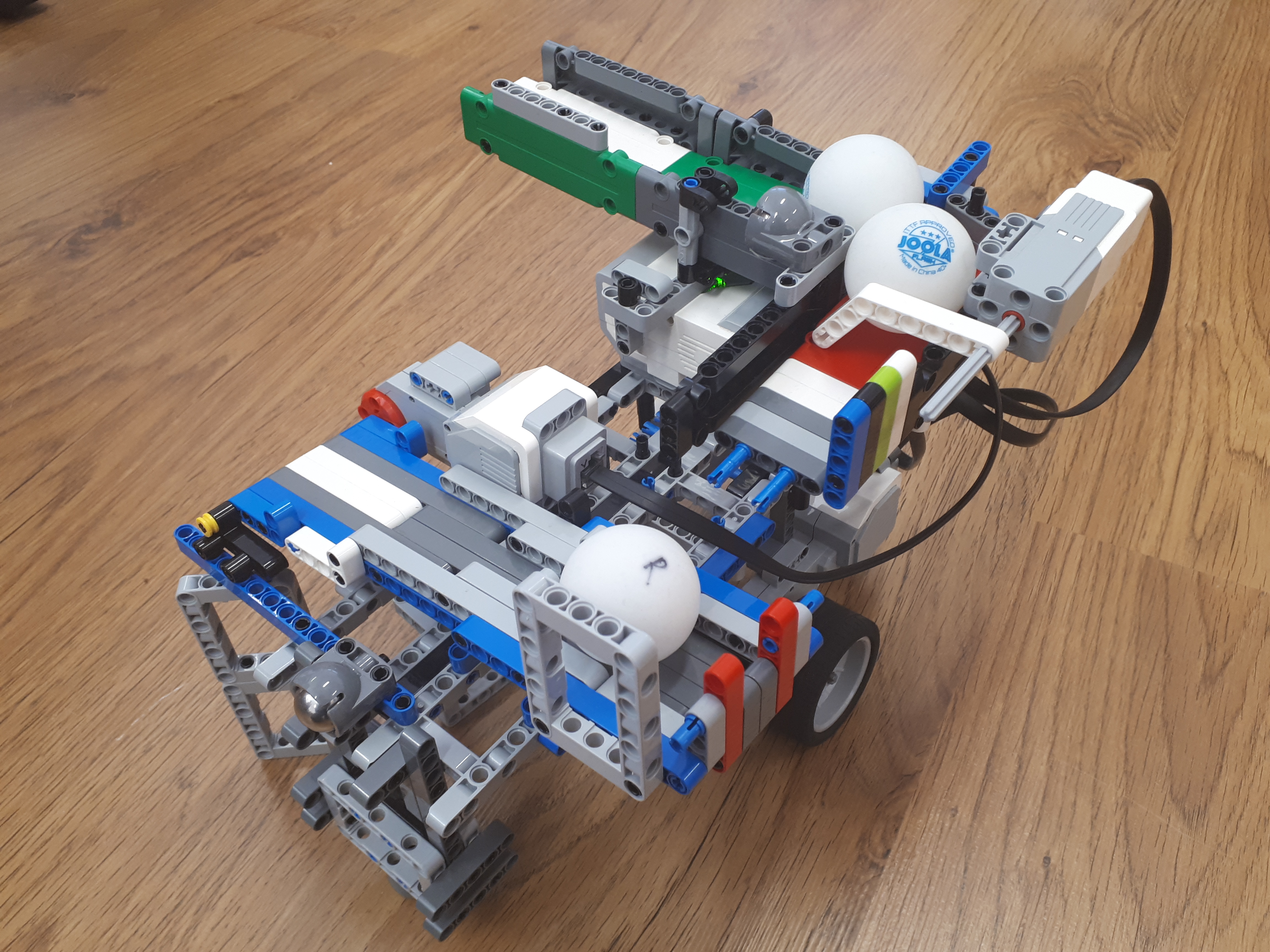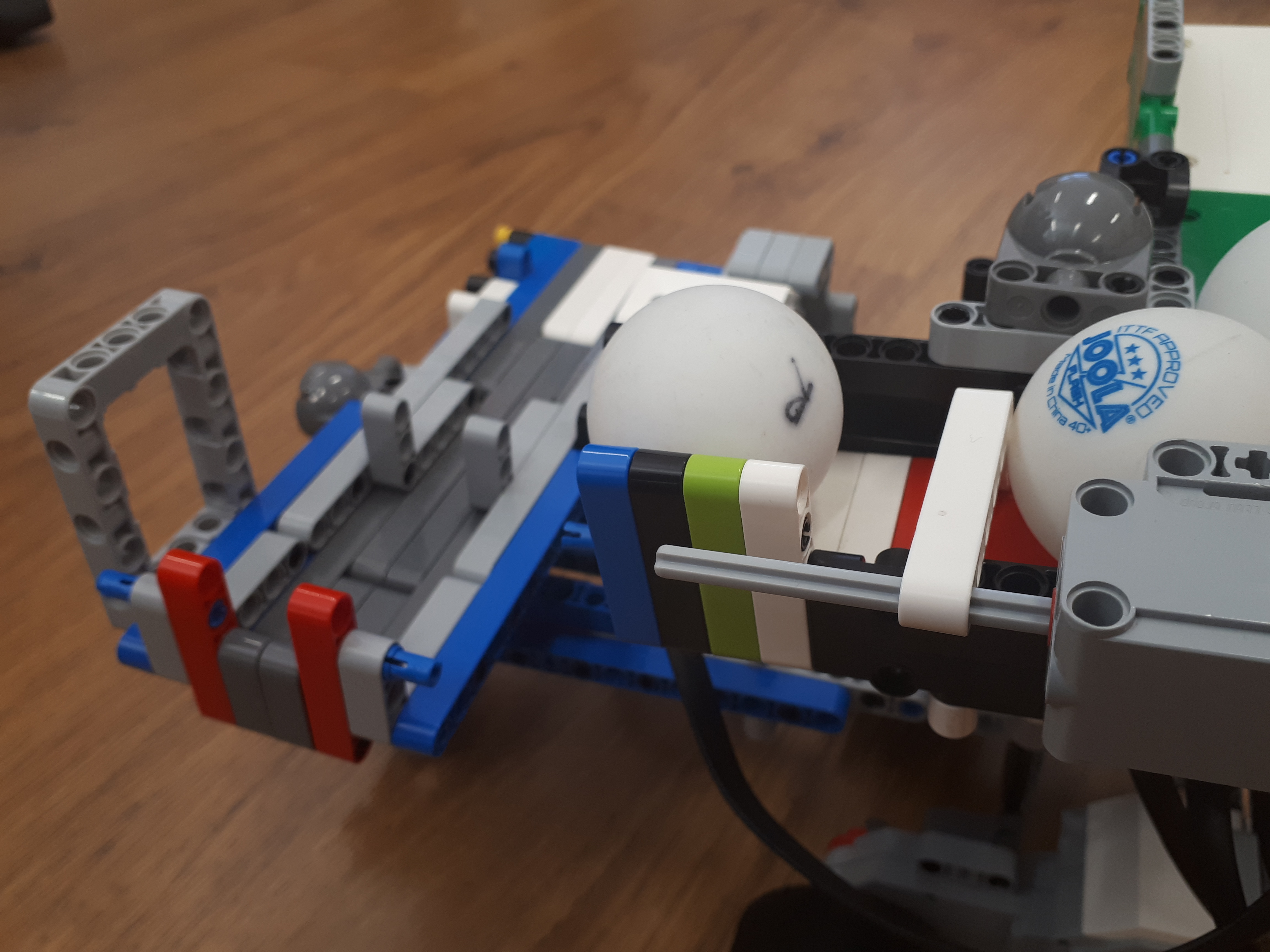 Nášho robota sme zostrojili ako vystreľovacie vozidlo. Na vyvýšenom podvozku s dvoma kolesami a dvoma guličkami sú umiestnené dve funkčné časti. Jedna časť je podávací zásobník, ktorý je zložený z dvoch šikmých plôch do tvaru "L". Ich šírka je presne na šírku pingpongovej loptičky. Podávanie loptičky zabepečuje jedna klapka s malým motorom. Druhá časť je vystreľovacie - vyklápacie rameno. Je umiestnené tak, aby loptička z hornej časti spadla presne do vystreľovacieho priestoru na konci ramena. Pohyb celého vyklápacieho ramena má dve verzie: prvá je s malým motorom a krátkym ramenom a druhá: s veľkým motorom a dlhším ramenom. Tieto úpravy sme urobili po zistení slabého vystreľovania a krátkeho doletu loptičky. Rôzne umiestnenie vystrelenia loptičky sme vyriešili pohybom celého robota priamo na stole.