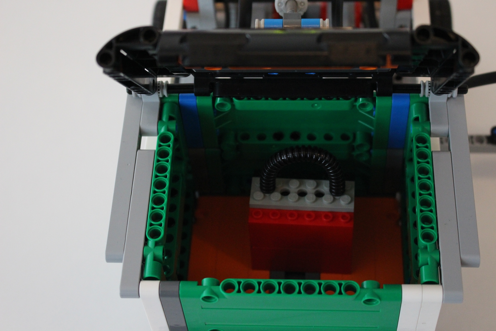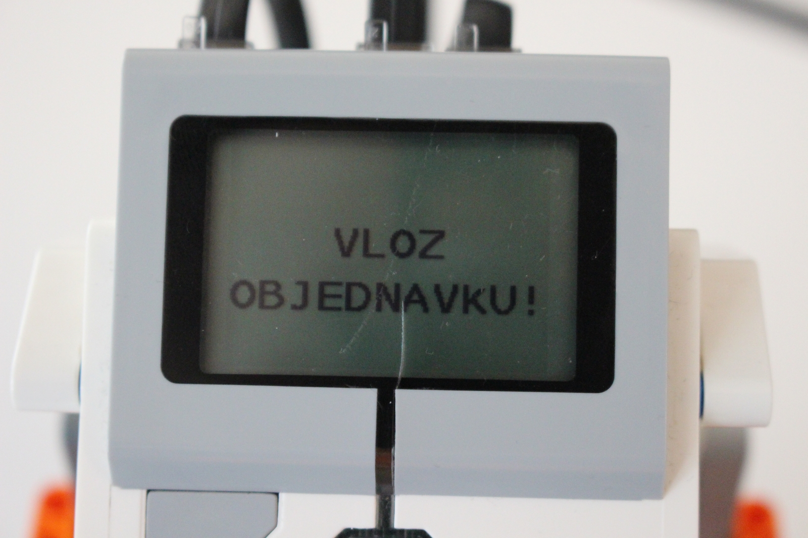 2. Po úplnom otovrení sa na displeji zobrazí "Vlož objednávku!". Robot čaká, kým kuchár nevloží objednané jedlo. Schránka na jedlo má pohyblivú podlahu, ktorá sa dotýka dotykového snímača. Po vložení jedla sa podlaha zaťaží a robot vie, že jedlo bolo vložené - dotykový snímač bol stlačený. Na displeji zobrazí "OK". Počká 0,5 s - aby kuchár dal preč ruku a začína zatvárať schránku.