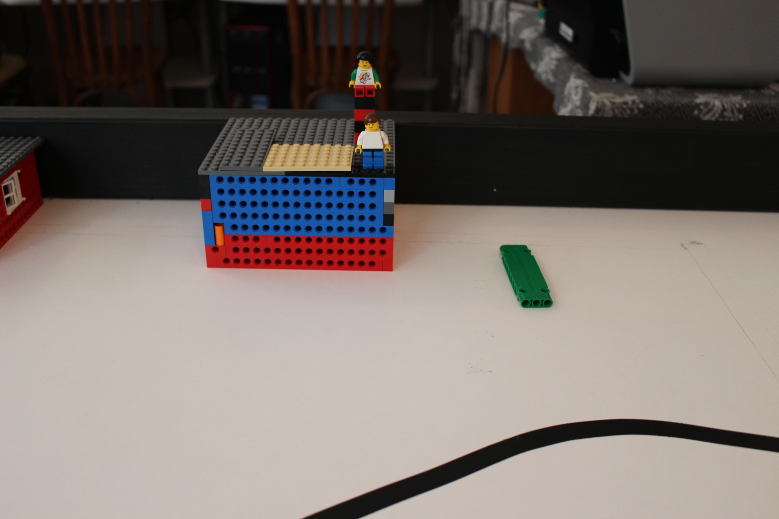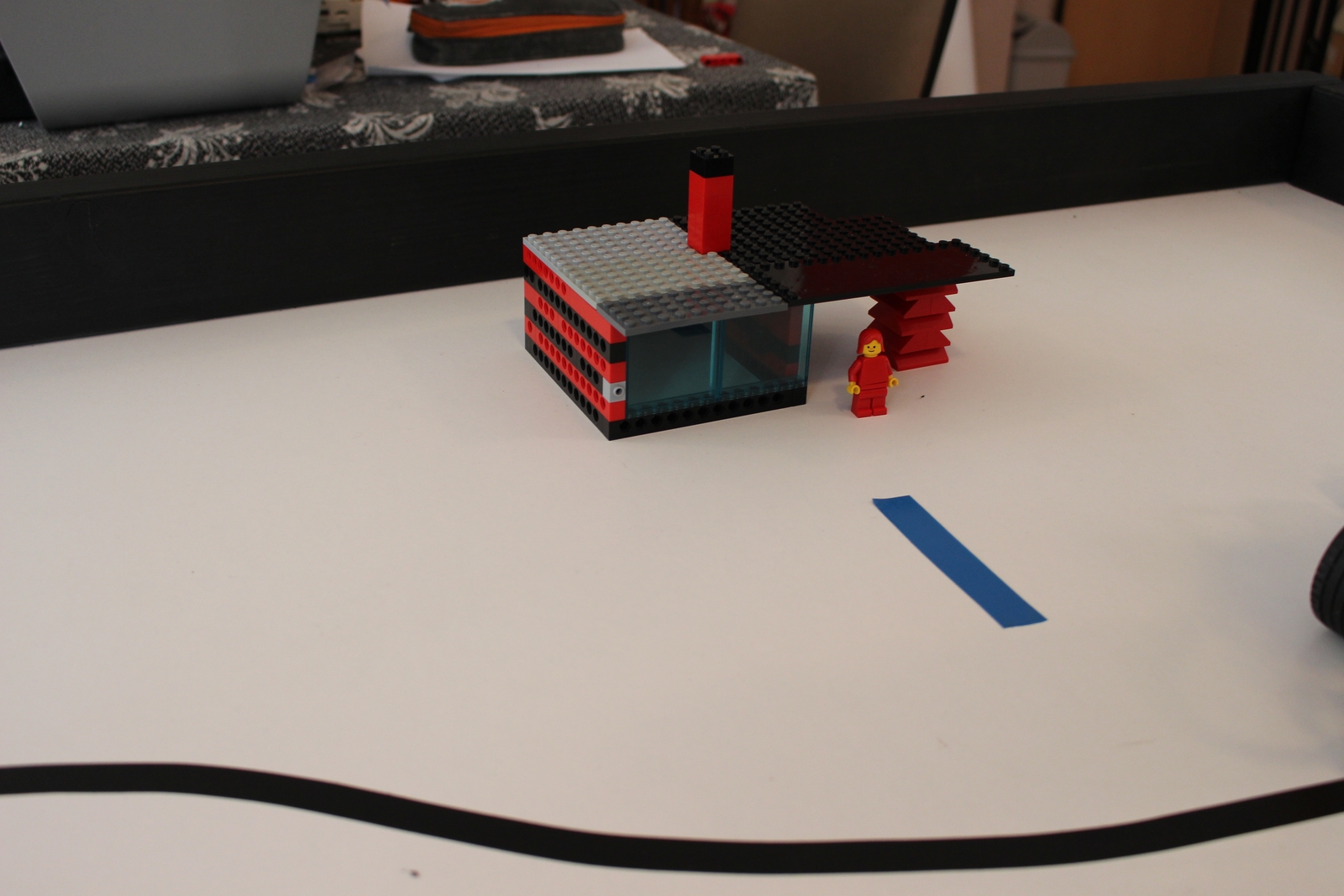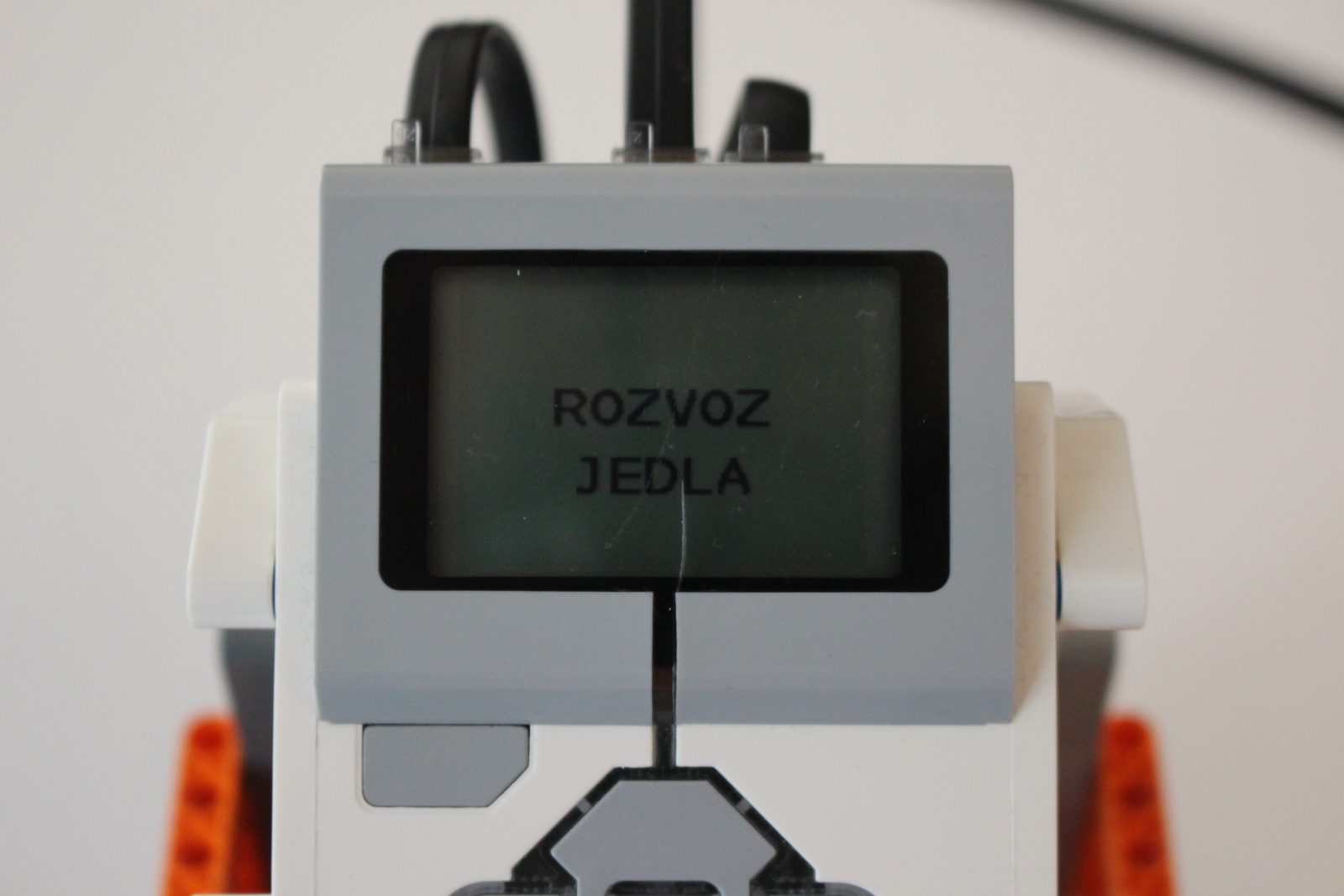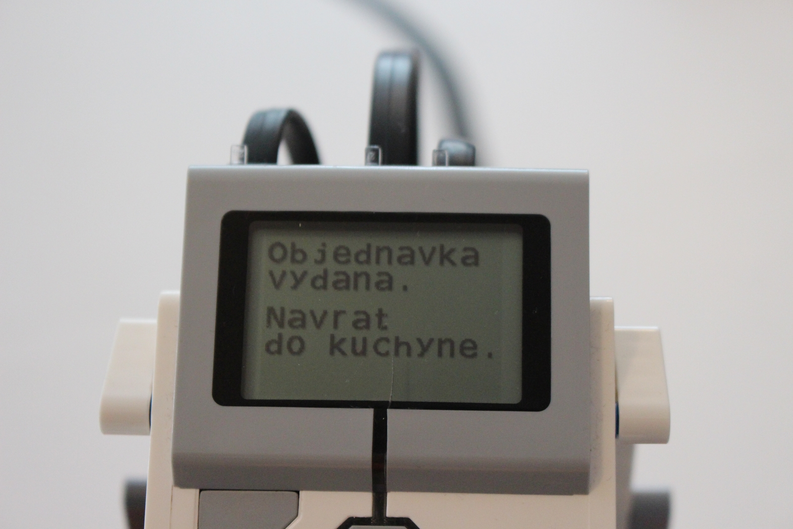 9. Ak je zadaný kód správny, tak na displeji zobrazíme obrázok Accept, schránka sa otvorí a robot čaká na vybratie jedla. Keď objednávajúci vyberie jedlo, tak sa snímač pod podlahou odľahčí a robot vie, že jedlo bolo vybraté. Na displeji sa zobrazí "Objednávka vydaná, návrat do kuchyne". Zatvorí sa schránka, robot sa na ceste otočí o 180 stupňov a vráti sa do kuchyne. Kuchyňa je vyznačená zelenou kockou po pravej strane cesty - keď ju robot nájde, tak vie, že je doma, znova sa otočí o 180 stupňov a je pripravený na ďalší rozvoz.