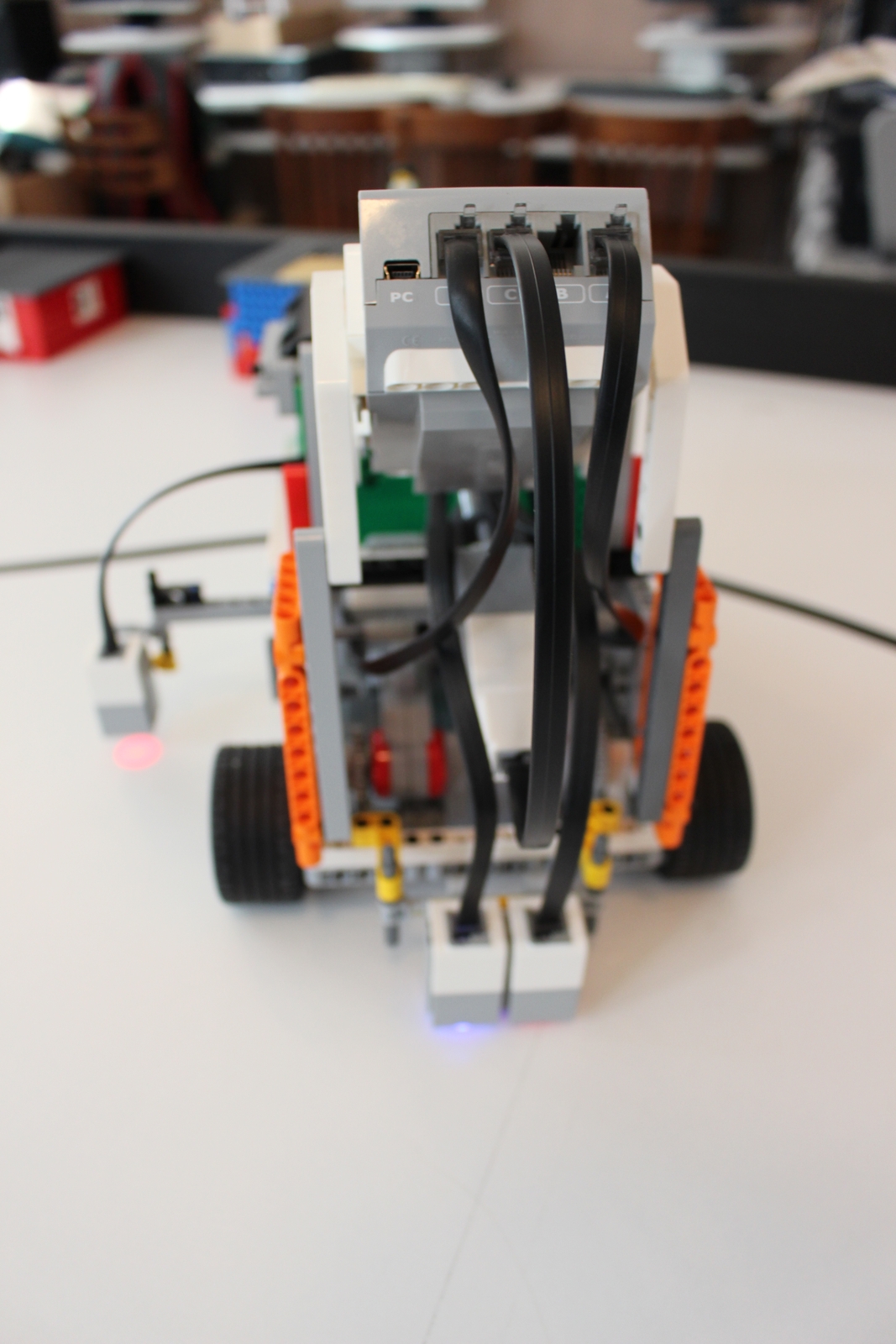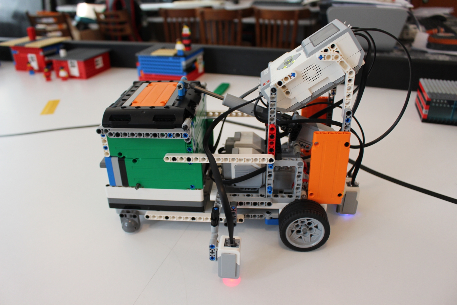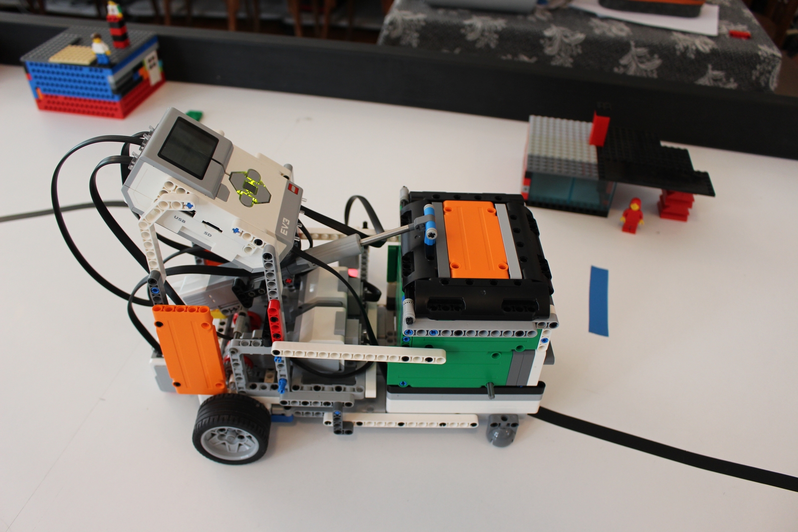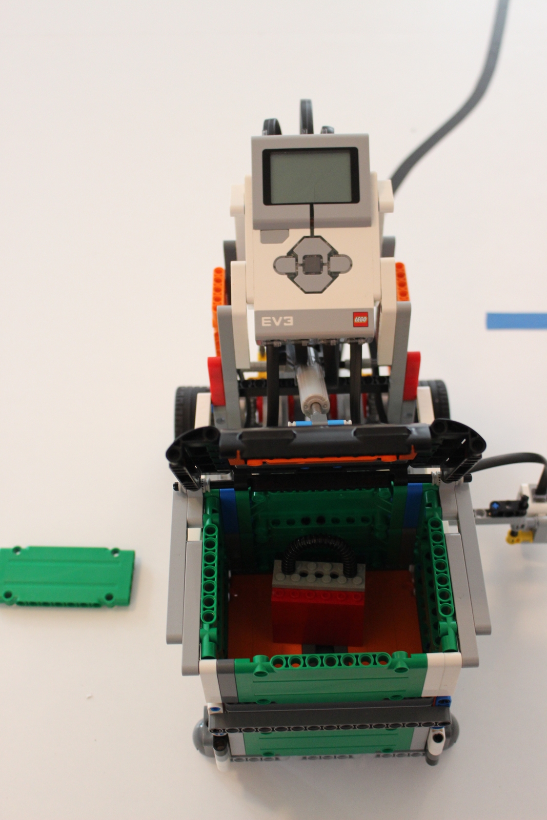 Náš robot obsahuje 2 veľké motory na pohon, 1 stredný motor, ktorý otvára a zatvára schránku na jedlo. Ďalej sme použili 4 senzory - 3 optické senzory a 1 dotykový senzor. 2 optické senzory využívame pri pohybe po čiernej páske - to je naša cesta. 1 optický snímač hľadá dom podľa zadanej adresy.