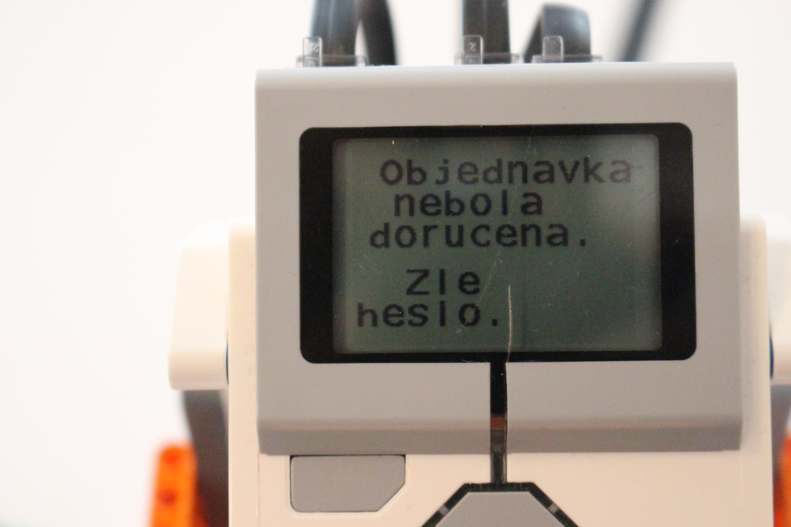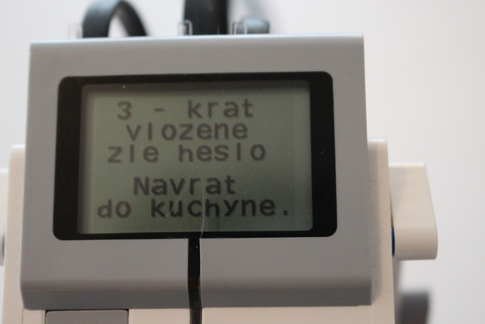 10. Ak je zadaný kód nesprávny - na dispeji sa zobrazí obrázok Decline a po 2 sekundách môže objednávateľ zadať kód ešte raz. Aby nemohol triafať heslo do nekonečna, tak sme vyrobili premennú počet pokusov - je to vlastne počítadlo pokusov. Po každom zlom pokuse sa premenná zvýši o jedna - obsah premennej sa kontroluje vo switchi - ak sú už 3 zlé pokusy, tak robot to stopne, zobrazí na displeji "3 - krát vložené zlé heslo. Návrat do kuchyne". Otočí sa o 180 stupňov a po ceste sa vráti do kuchyne s nedoručeným jedlom. Po príchode do kuchyne sa znova otočí o 180 stupňov a na dispeji zobrazí "Objednávka nedoručená, zlé heslo". Otvorí sa schránka - aby kuchár mohol vybrať nedoručené jedlo. Po vybratí jedla sa schránka zatvorí a robot je pripravený na nový rozvoz.