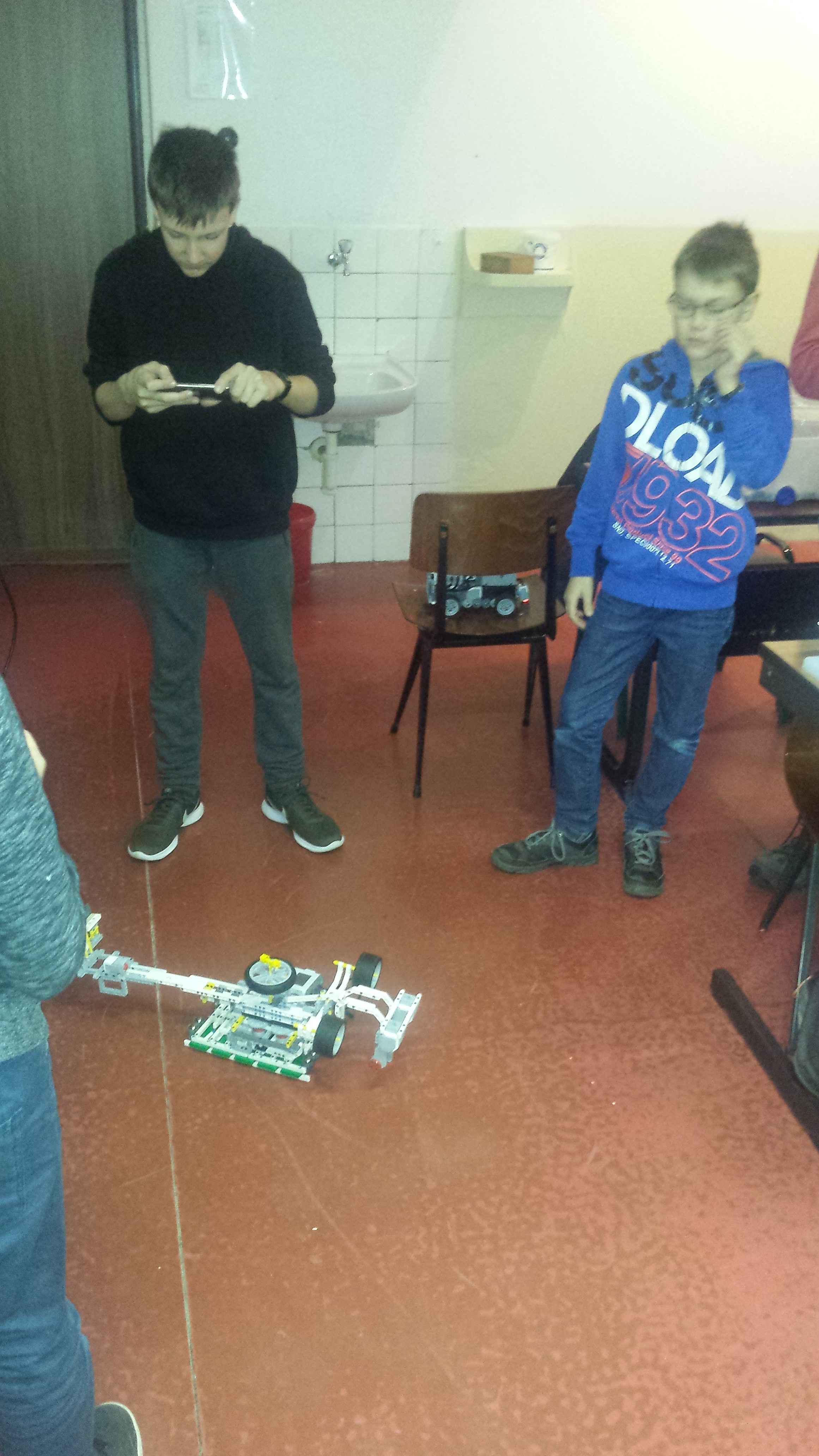Máme dva podobné programy na riadenie. dá sa aj vybrať rýchlosť keď sú pripojené dva touch senzory. Program spúšťame tlačidlom na kocke. Museli sme použiť kocku NXT, lebo EV3 si zobrali chalani na kamiony.