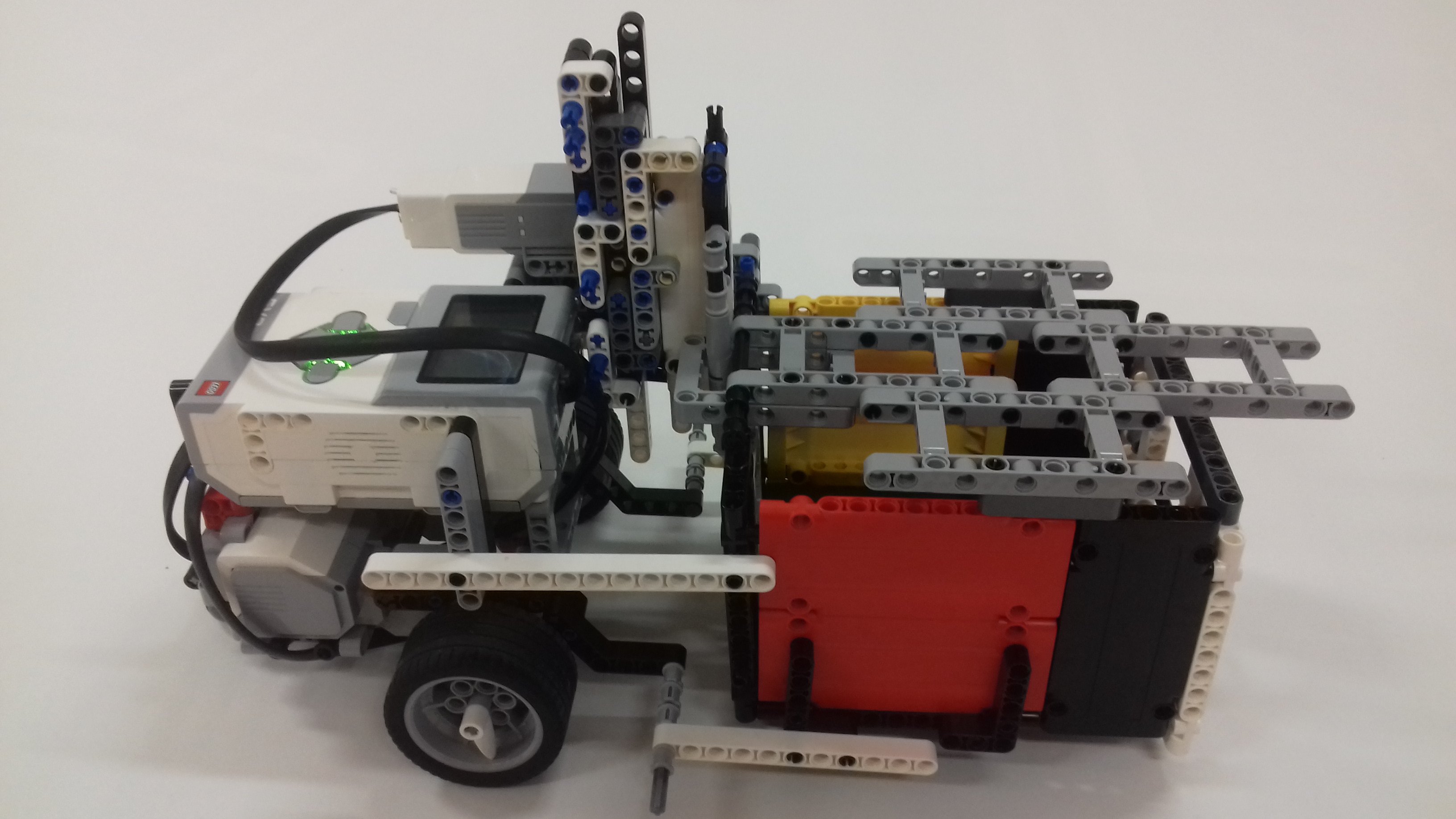 na nášho robota sme použili základného robota, ku ktorému sme prirobili uzamykateľnú schránku na jedlo, takže pohyb je klasický s dvomi large motormi a guličkou. Uzamykateľná schránka je štvorcová nádoba. V hornej časti má priklápaciu rampu - dvierka.