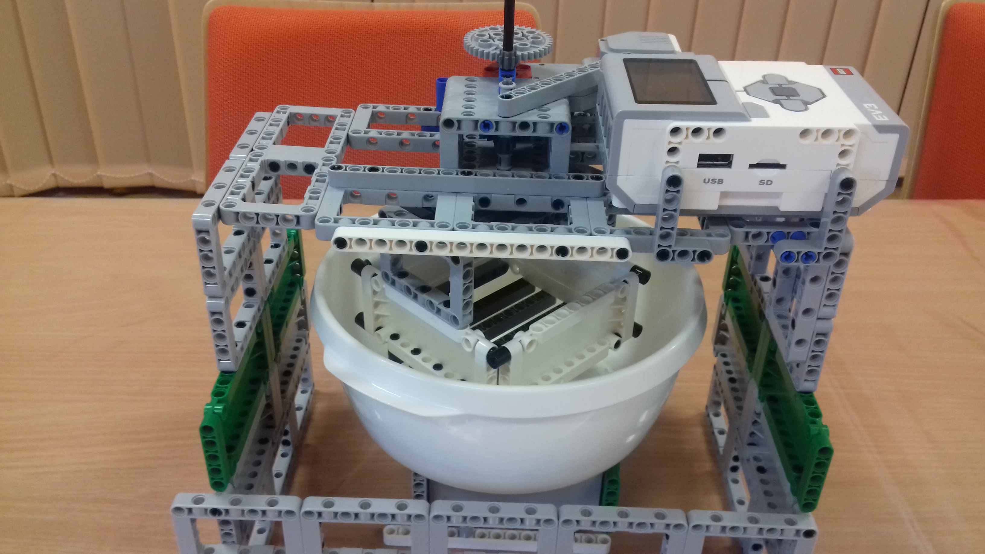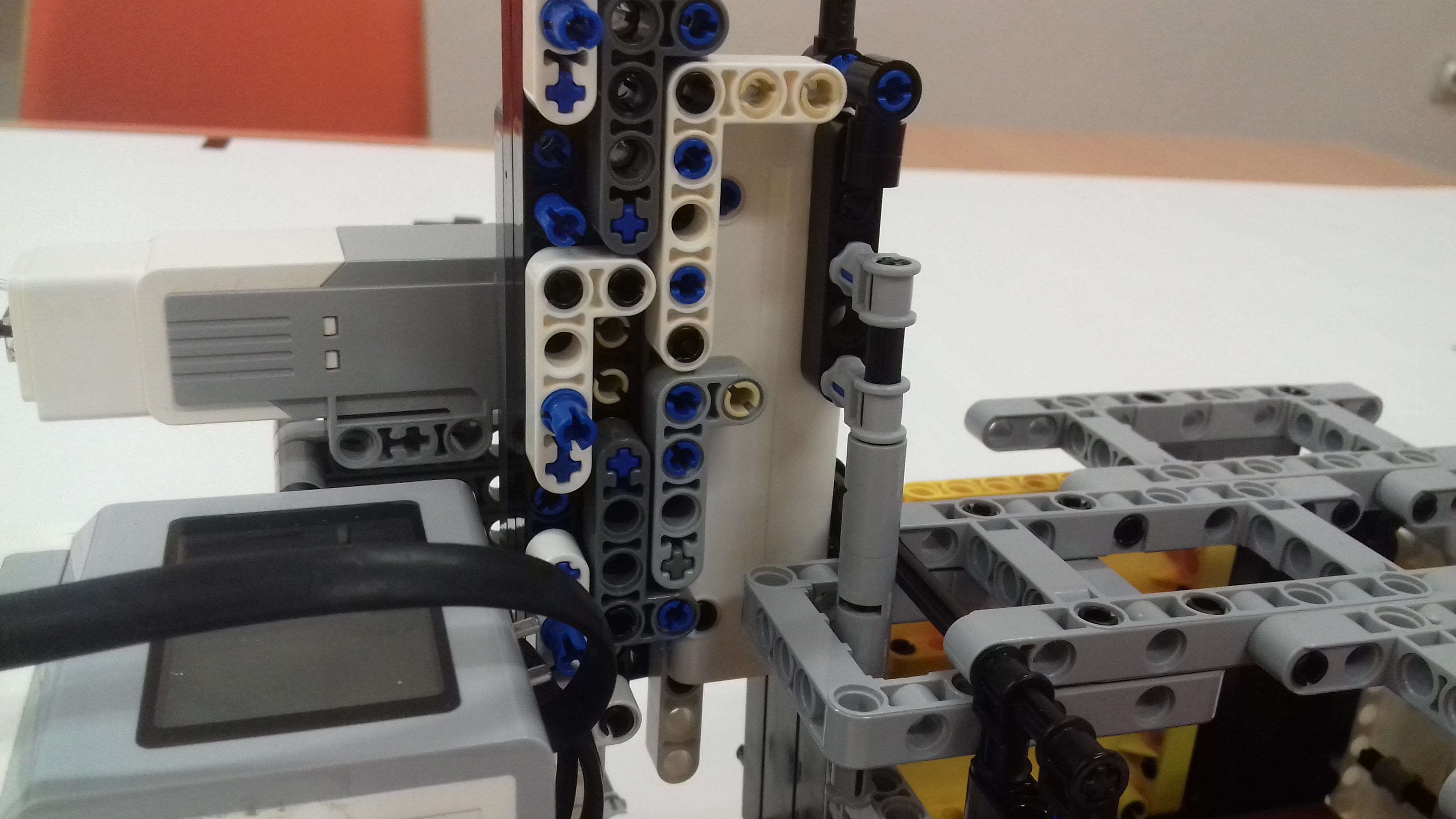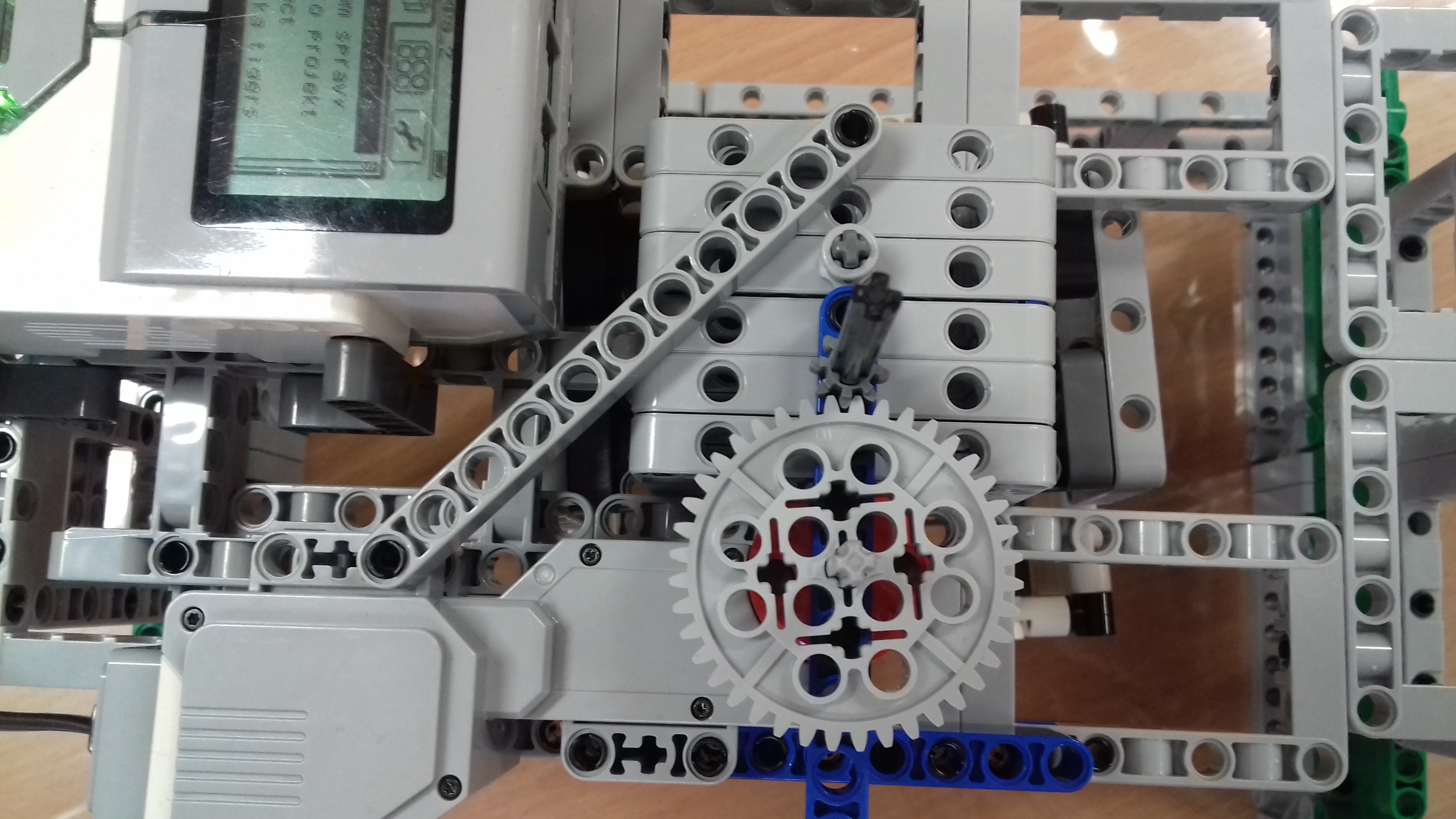 Stojan na odstredivku: je skonštruovaný z plochých súčiastok v dolnej časti a obdĺžnikov v hornej časti, kocka EV3 je umiestnená na hornej plošinke stojana aj s large motorom. Tento motor slúži na pohon odstredivky. Jeho silu sme zvýšili sprevodovaním najväčšieho ozubeného kolesa s najmenším.