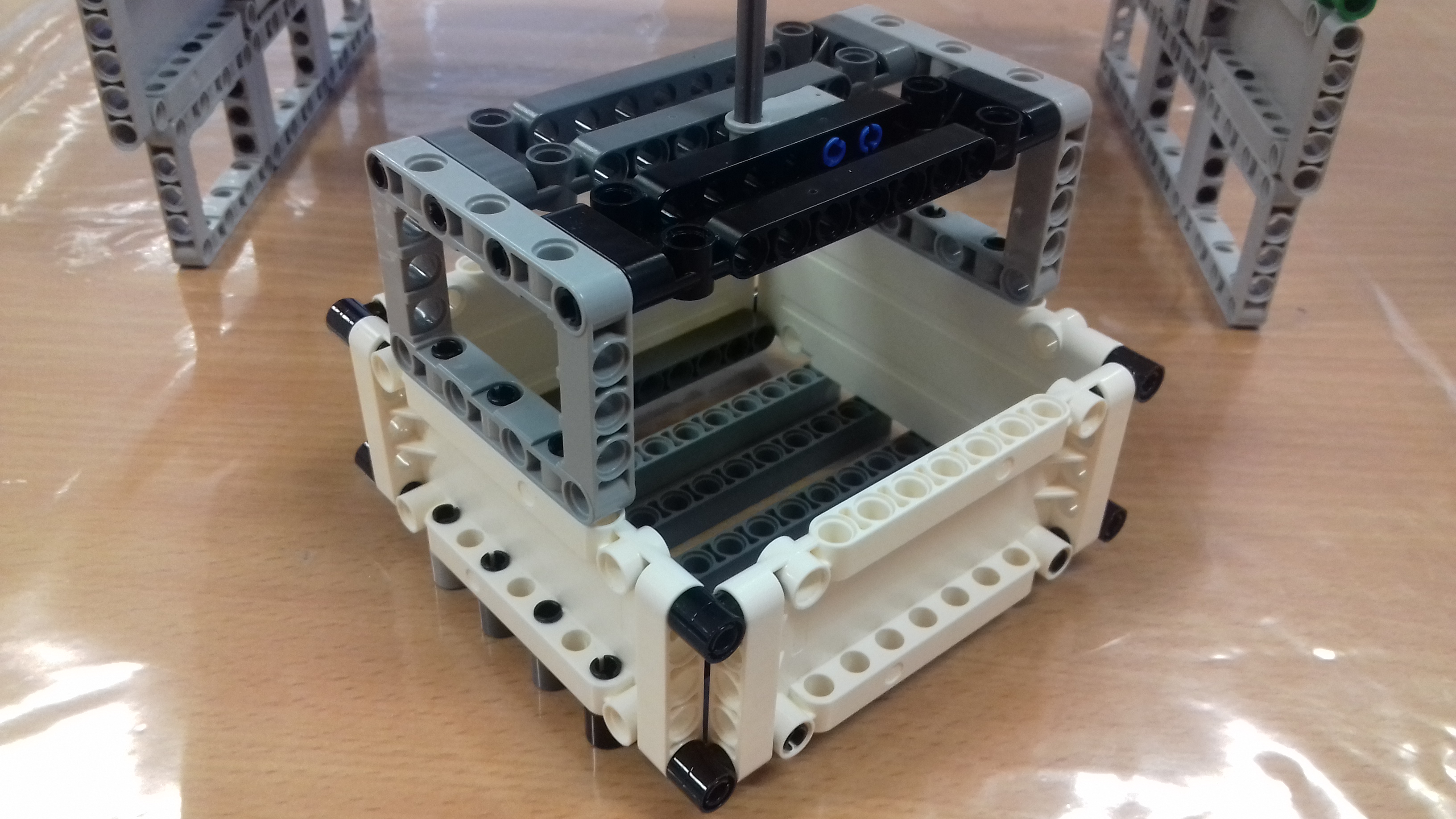 Košík odstredivky: sme zostrojili v štvorcovom tvare, spodná časť – dno je z rovných súčiastok a sú medzi nimi medzery, aby mala kadiaľ pretekať vyžmýkaná voda. Boky sú z plochých súčiastok, hladkým povrchom dovnútra, aby po nich stekala voda dole do zbernej nádoby. Celý košík je napojený na pohon motora iba jednou zvislou paličkou v strede.