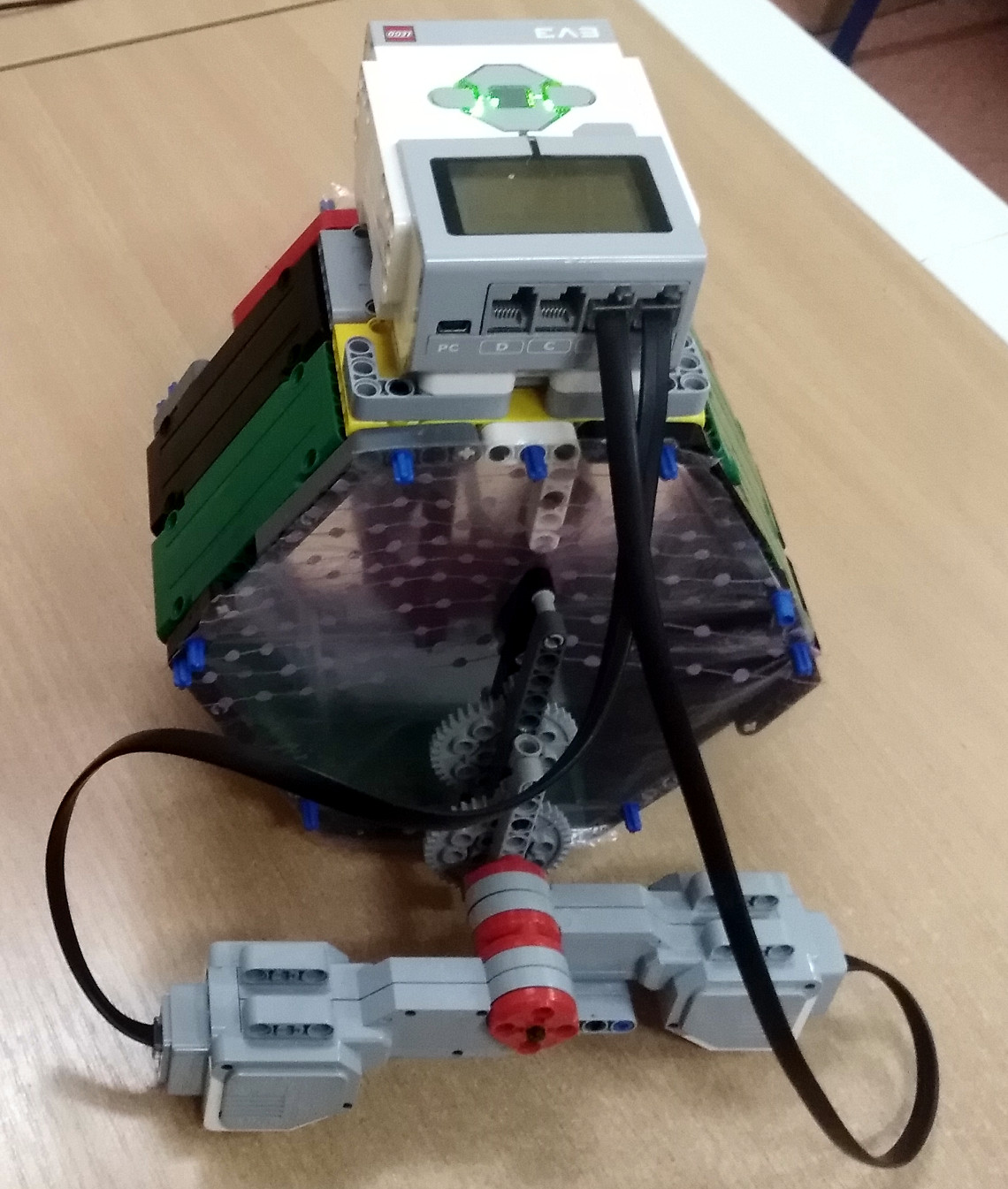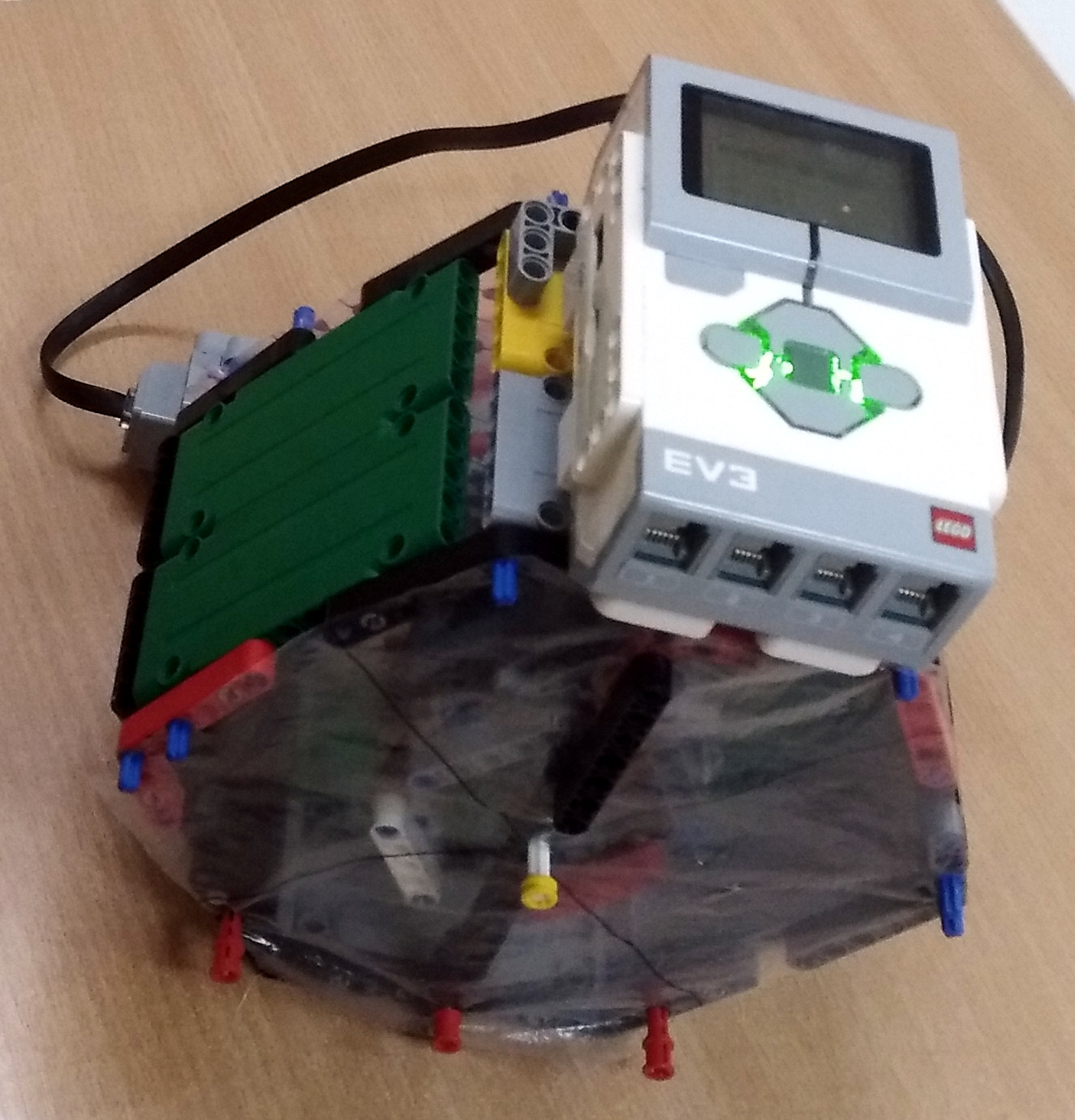 Dva motory roztáčajú malú nádobu na vreckovky v strede zrýchlovacím prevodom na vysokú rýchlosť. Vodu zachytáva 5-uholníková konštrukcia. Kocku sme pre istotu zabalili do sáčku. Video je spomalené, ale na konci vidno plnú rýchlosť. Podarilo sa nám získať jednu celú mláčku vody. :)