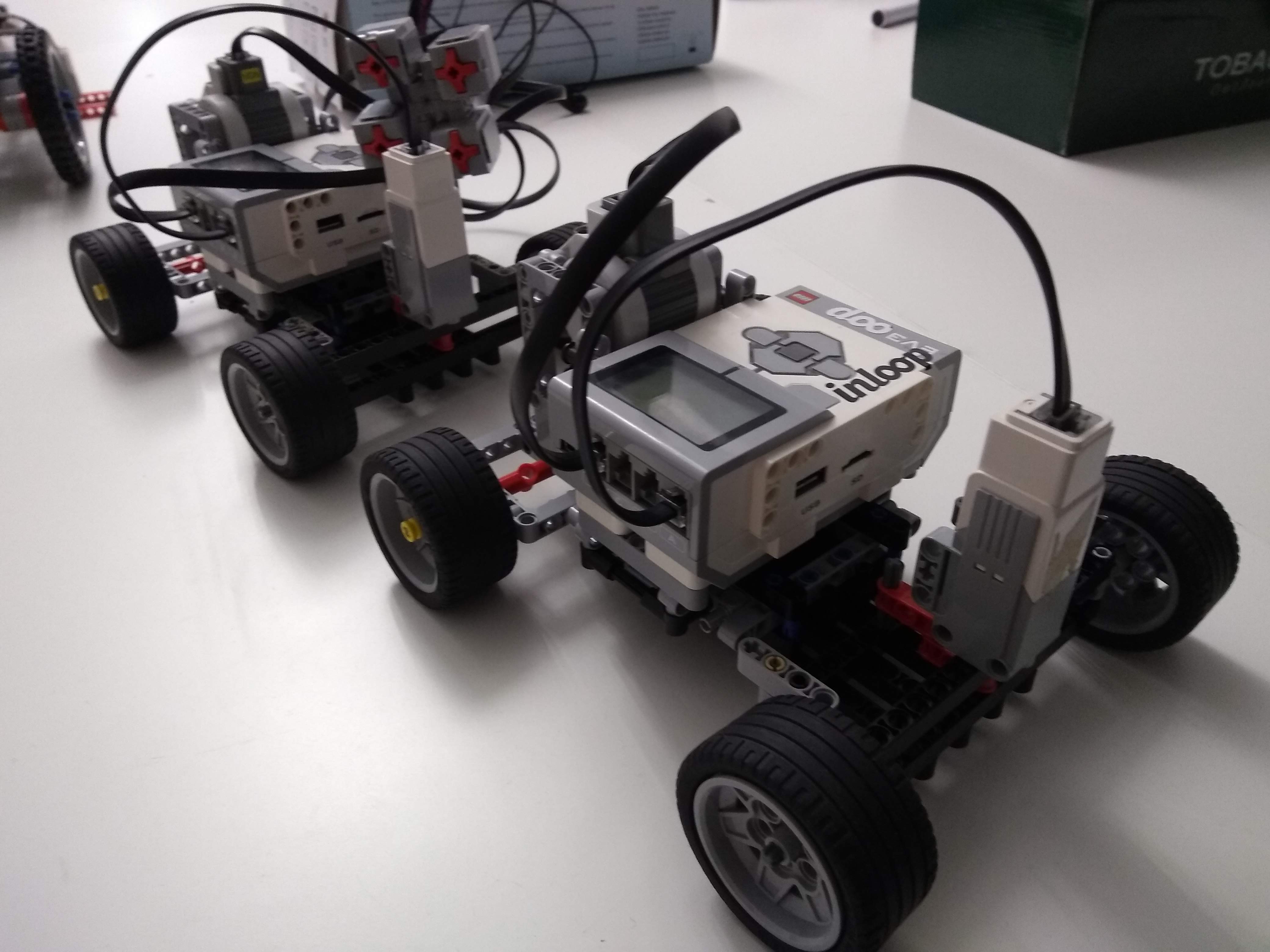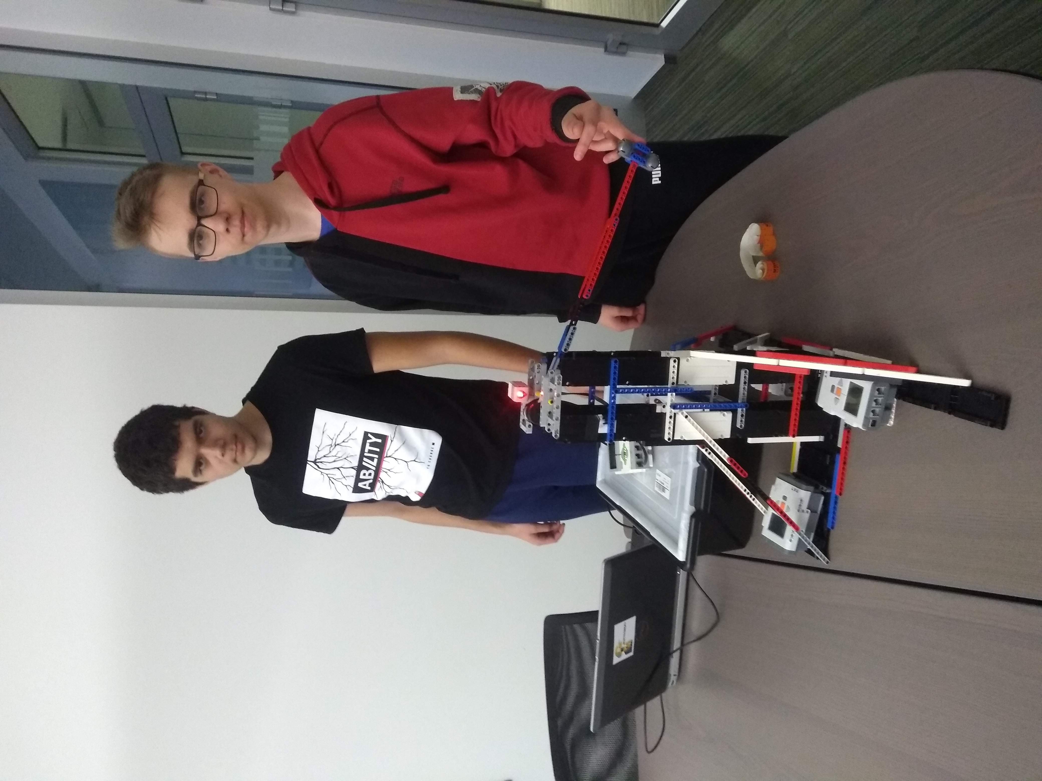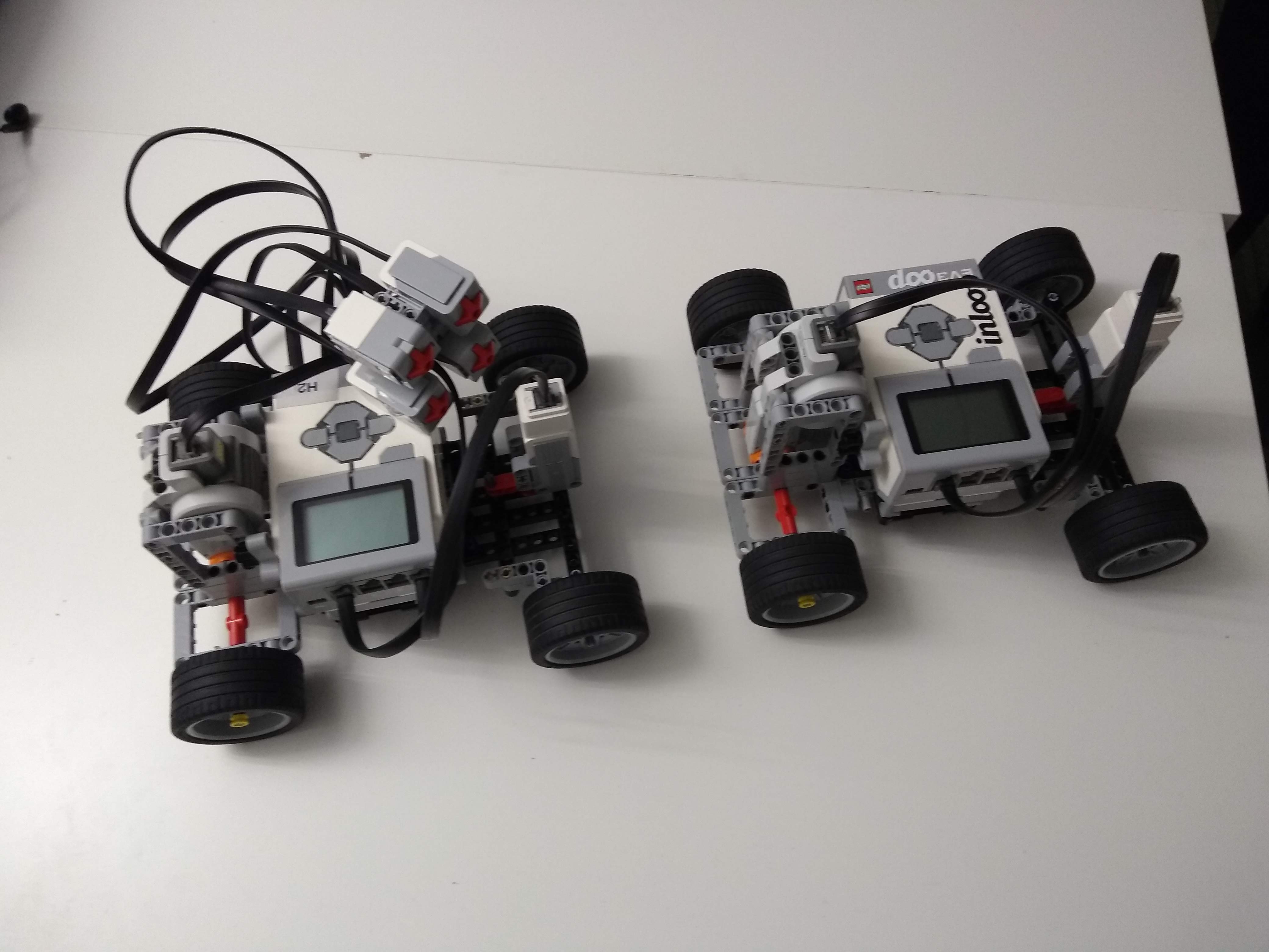 Konštrukcia Takmer identická u oboch kamiónov okrem toho, že predný kamión má ovládač vo forme štyroch tlakových senzorov. Predná náprava - jednoduchá predná náprava s predným zatáčaním s EV3 M motorom s Akermanovou geometriou Zadná náprava - zaručuje pohon jedným NXT motorom ktorý je priamo pripojený na kolesá Program 1. kamiónu - prijímanie pokynov z ovládaču, spracovanie, zapisovanie a odosielanie hodnôt do senzorov a motorov Program 2. kamiónu - prijímanie hodnôt cez bluetooth, rozdelenie na informácie o rýchlosti, ktoré sa posielajú do motorv a na informácie o zatáčaní a ich následné ukladanie do číselného poľa premenných, z ktorého sa následne po čase (ktorý je počítaný rýchlosťou kamiónu) posiela do zatáčania.Úlohu sa nám zatiaľ nepodarilo dokončiť, program ešte nepracuje správne.TímMichal (konštrukcia, program, popis)Sebastián (konštrukcia)Max (konštrukcia)