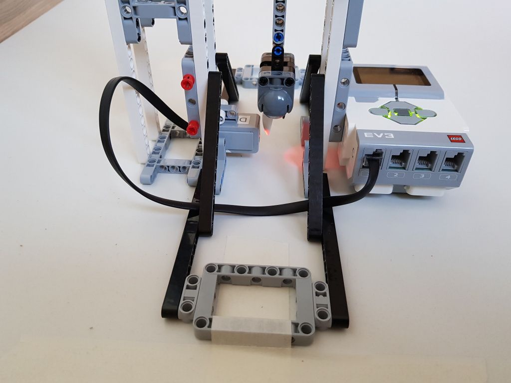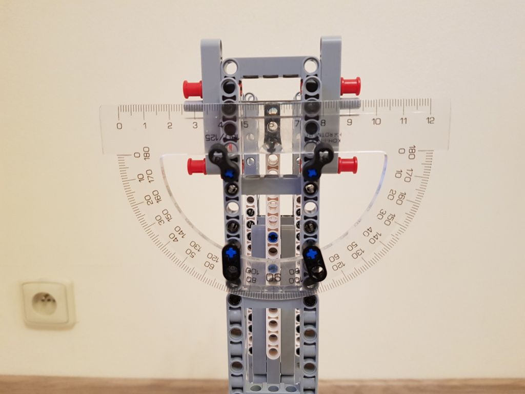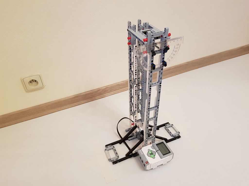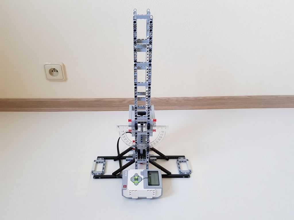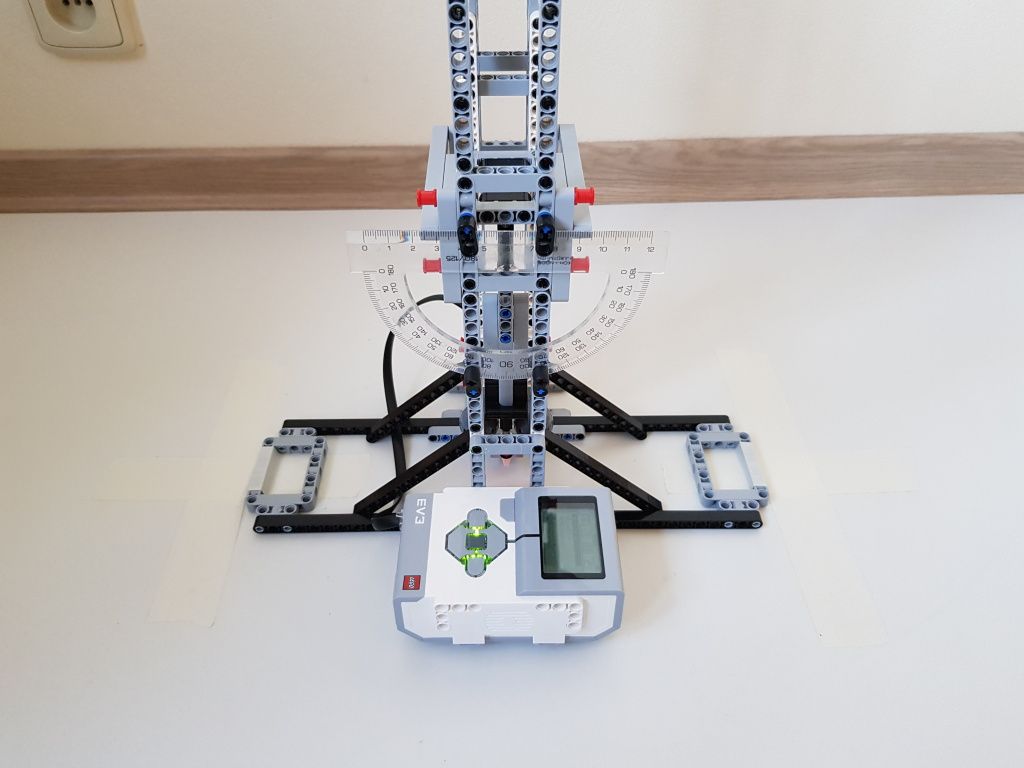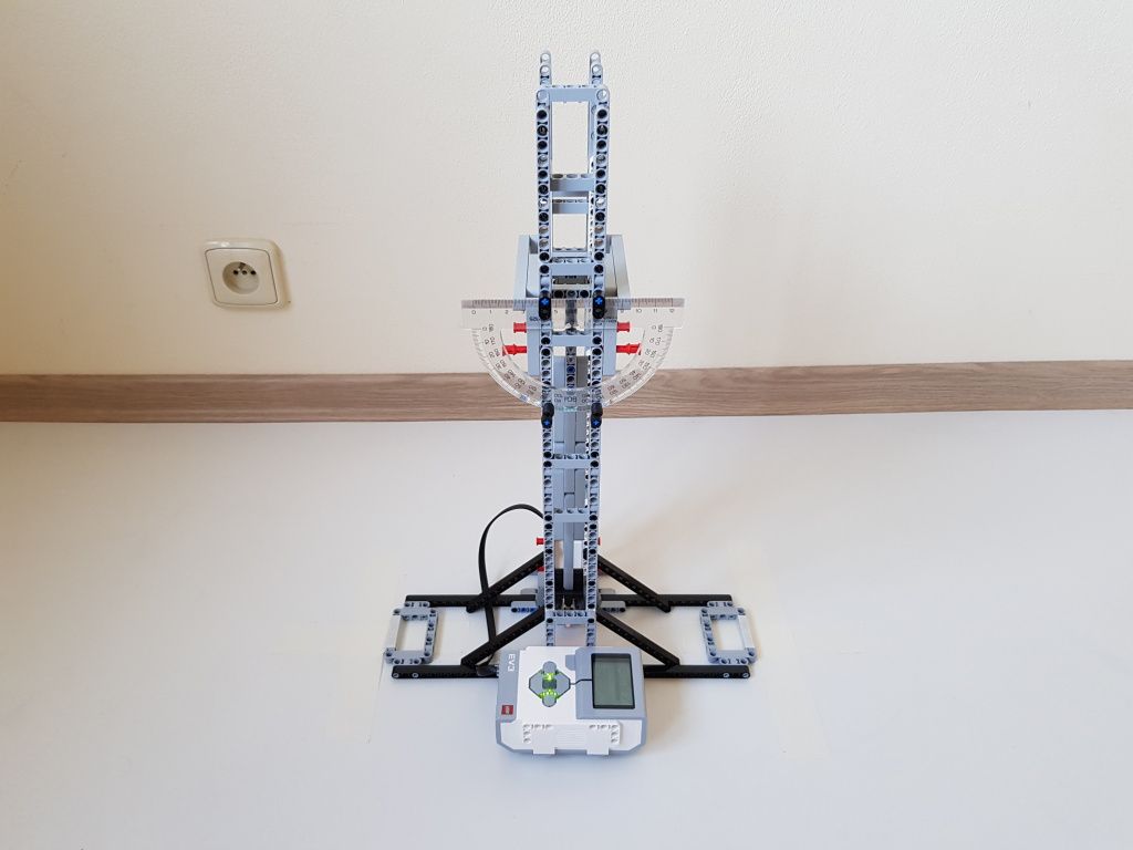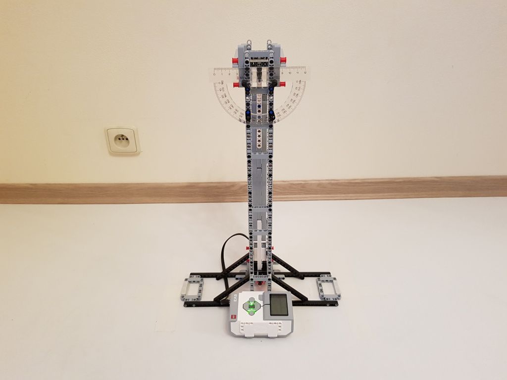 Robot tvorí jedna riadiaca jednotka EV3 a jeden senzor farieb pre snímanie polohy kyvadla v stredovej polohe. Použili sme tri kyvadlá s rôznou dĺžkou. Malé kyvadlo malo dĺžku 14,5 cm, stredné kyvadlo malo dĺžku 29 cm a veľké kyvadlo malo dĺžku 40 cm. Na meranie počiatočnej výchylky kyvadla sme použili uhlomer pripevnený k závesu kyvadla.