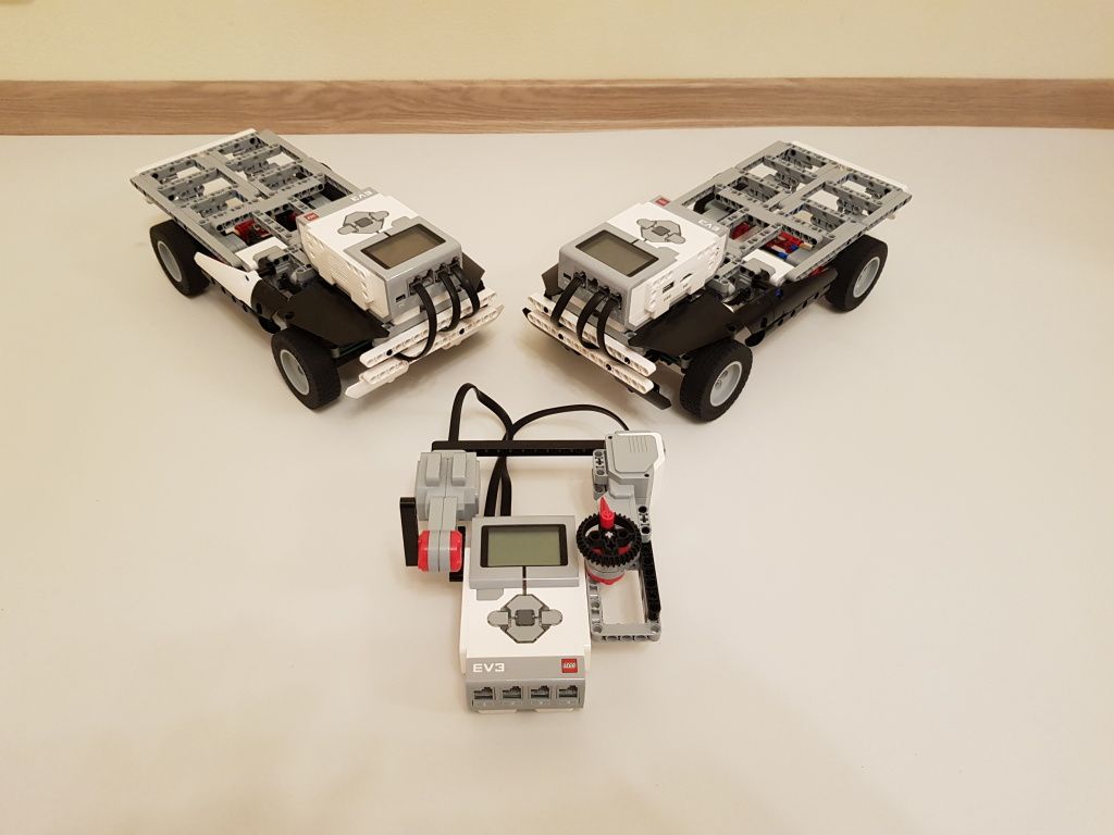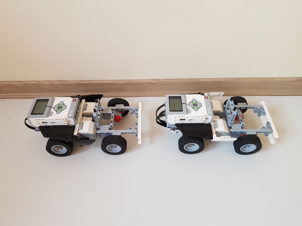Pôvodne sme chceli prvé vozidlo ovládať diaľkovým ovládaním pripojeným cez USB kábel v Daisy-Chain móde a povely do druhého vozidla odosielať cez BlueTooth, ale zistili sme problémy s riadením motorov spôsobené oneskorením pri prenose cez USB kábel a preto sme sa rozhodli použiť BlueTooth ovládanie pre obe vozidlá. Pri skúškach programu pre riadenie vozidiel sme zistili, že vozidlá rovnaký program vykonávali rôzne a preto sme museli postaviť nové vozidlá.