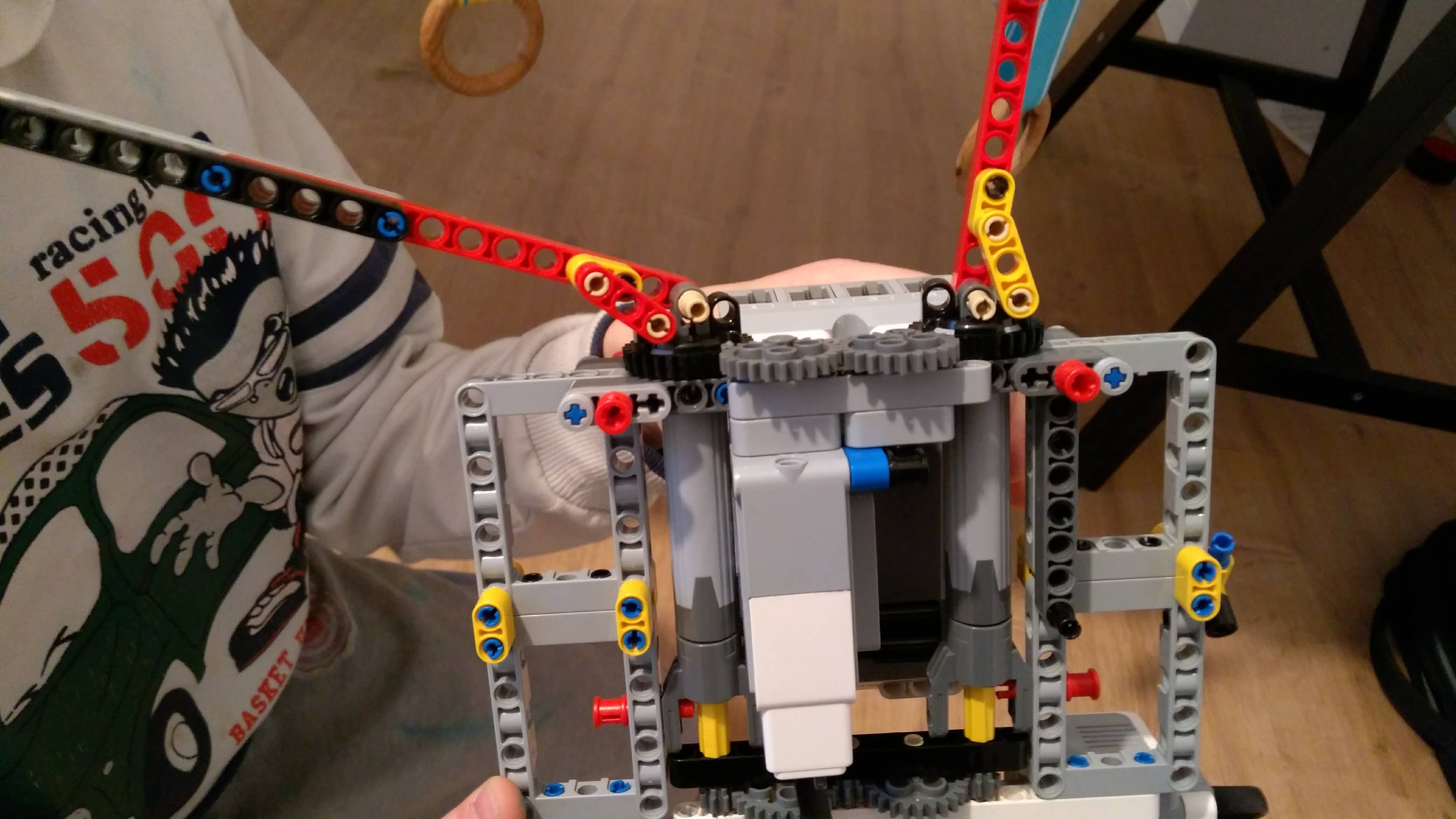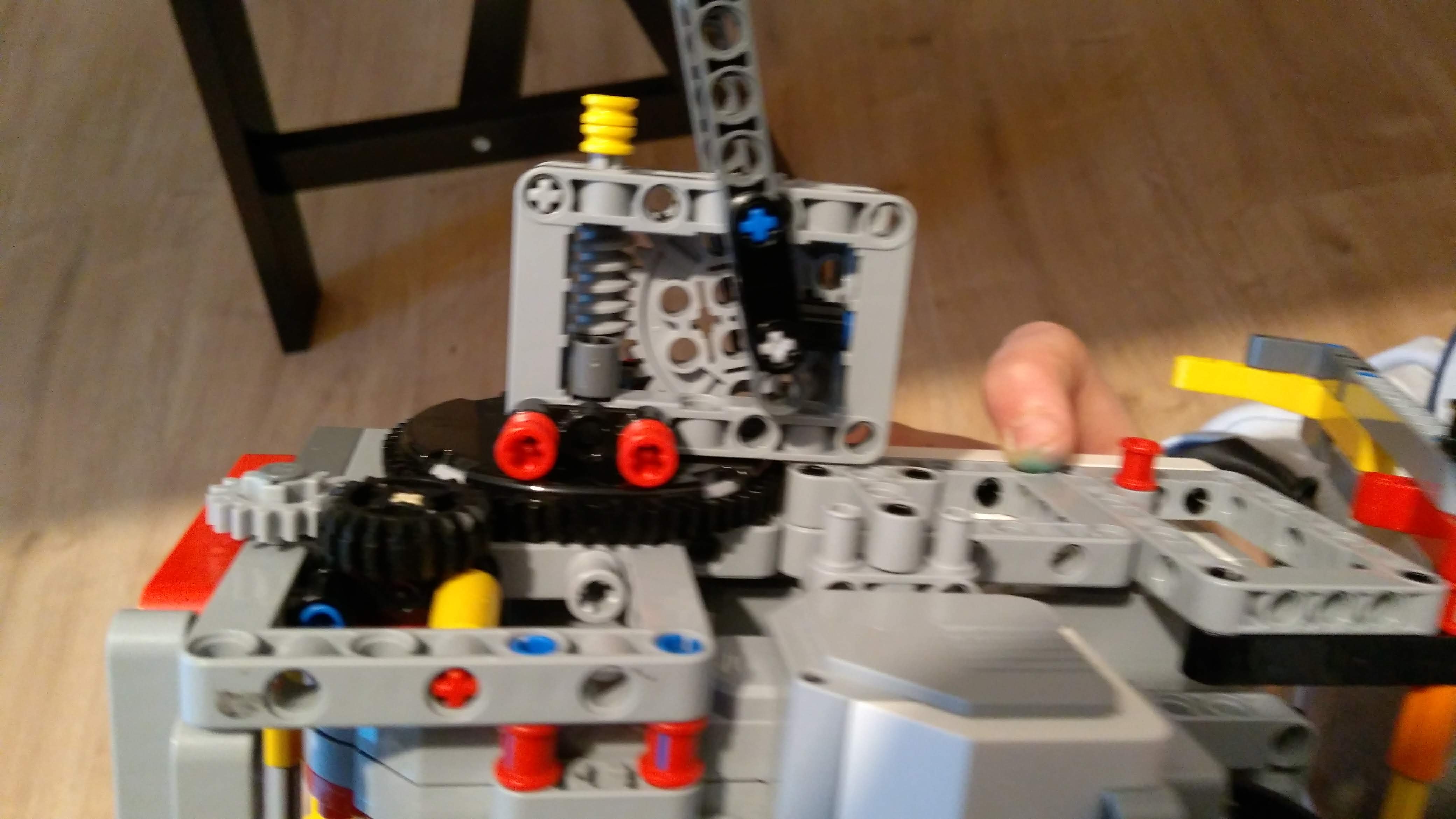 Na pohyb rúk sme použili veľké ozubene súkolie poháňane veľkým motorom cez prevod.