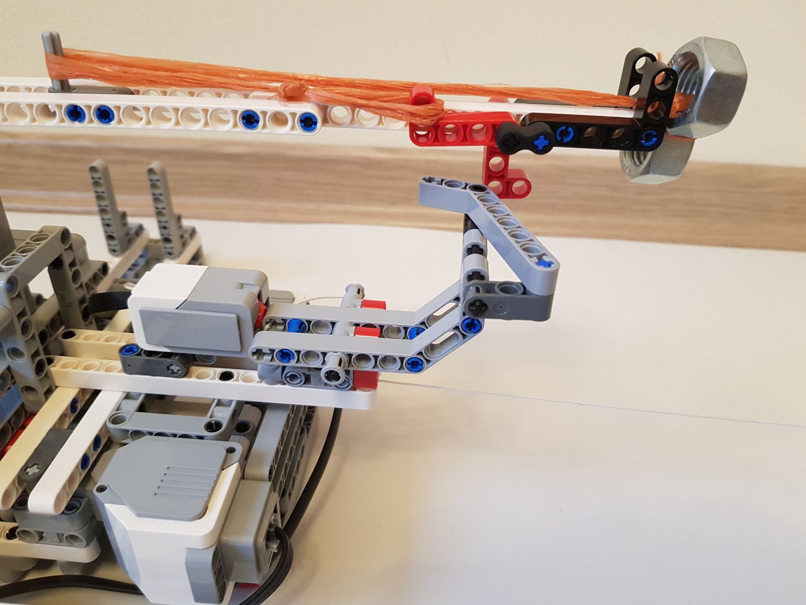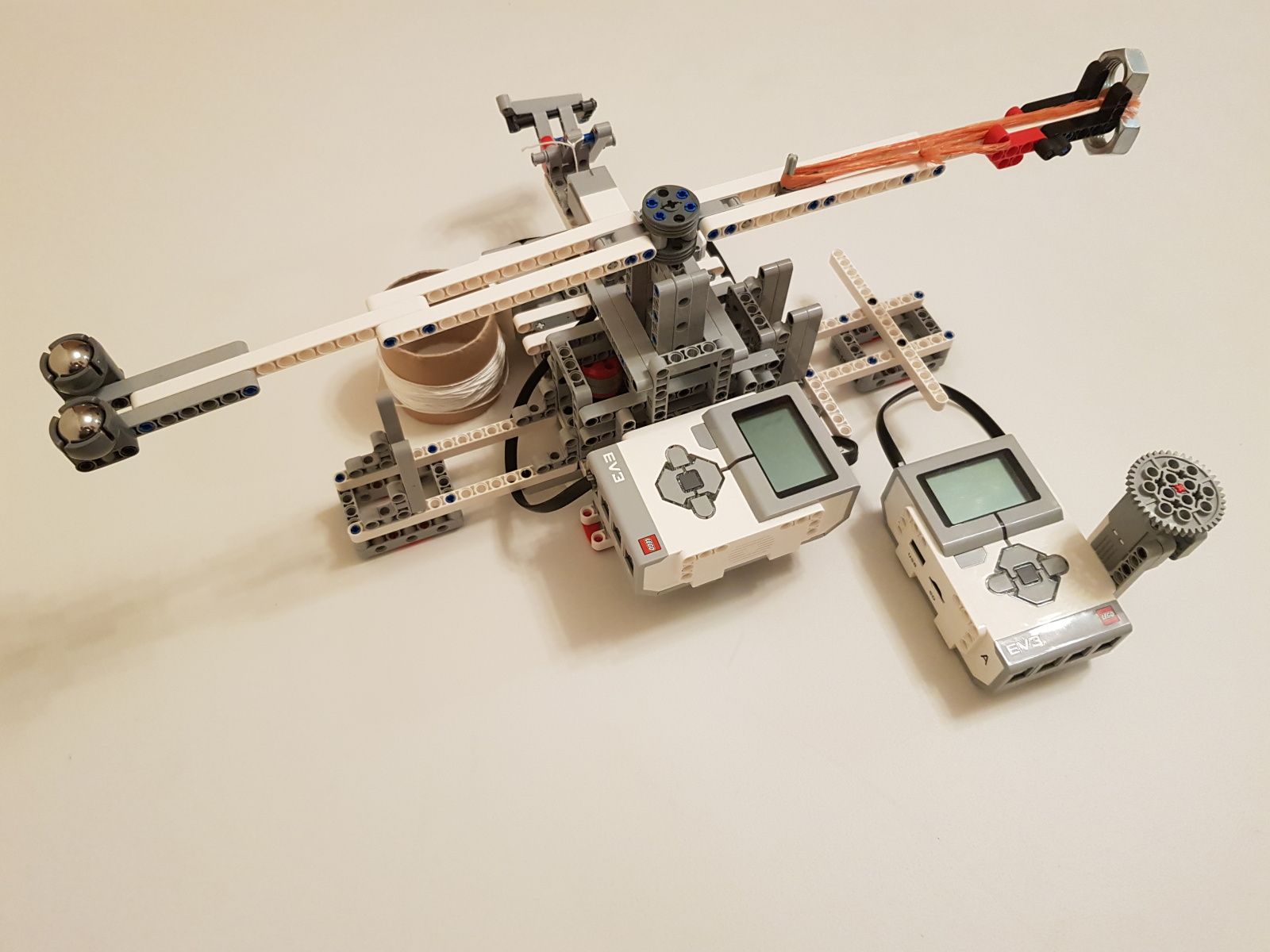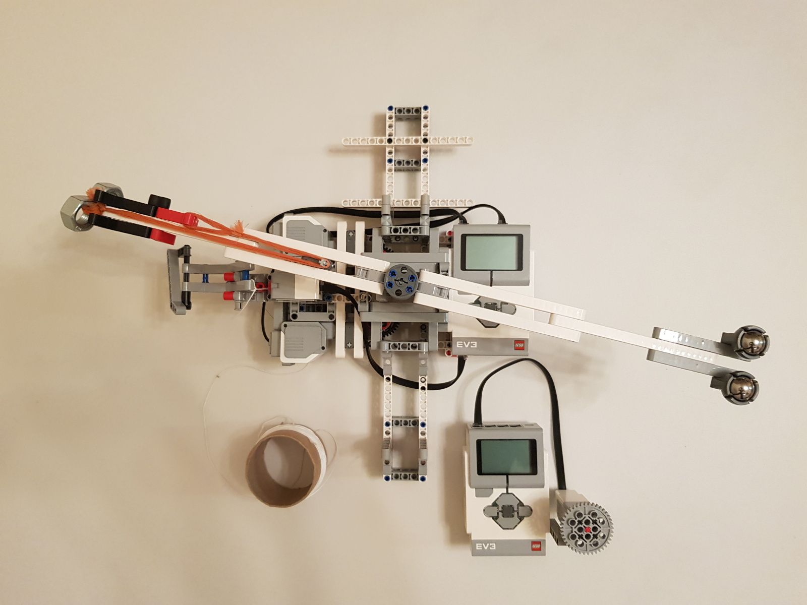 Robot na odhadzovanie kladiva tvorí jedna riadiaca jednotka EV3, dva veľké motory EV3 pre pohon ramena na hod kladivom a jeden dotykový senzor pre snímanie odhodenia kladiva a následné zastavenie pohonu ramena. Pre obmedzenie vznikajúcich vibrácií sme použili dve závažia, ktoré nie sú pevne spojené s konštrukciou robota.