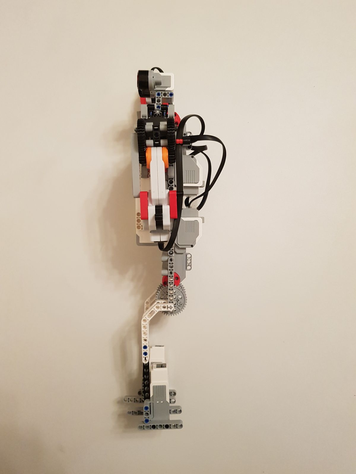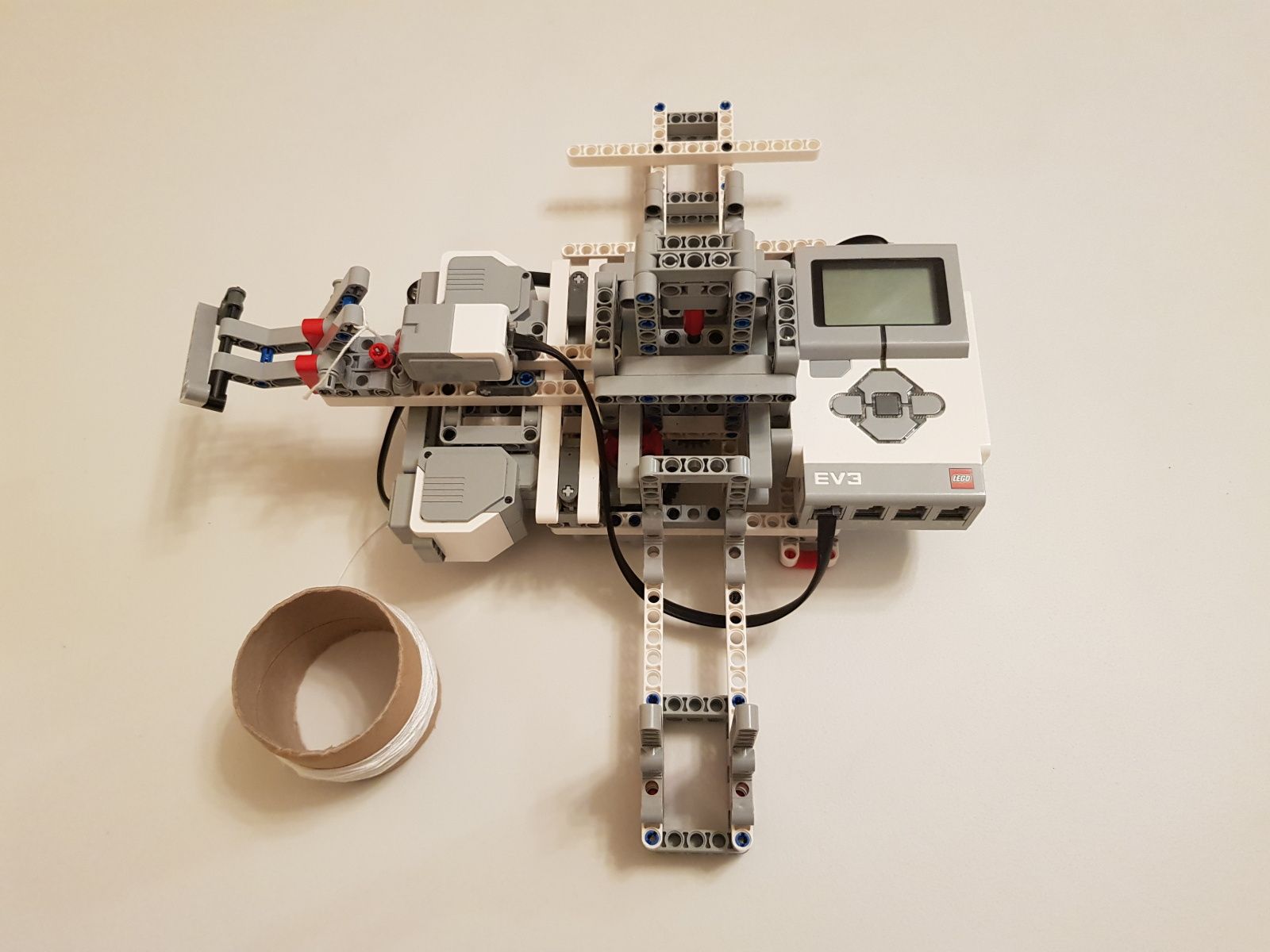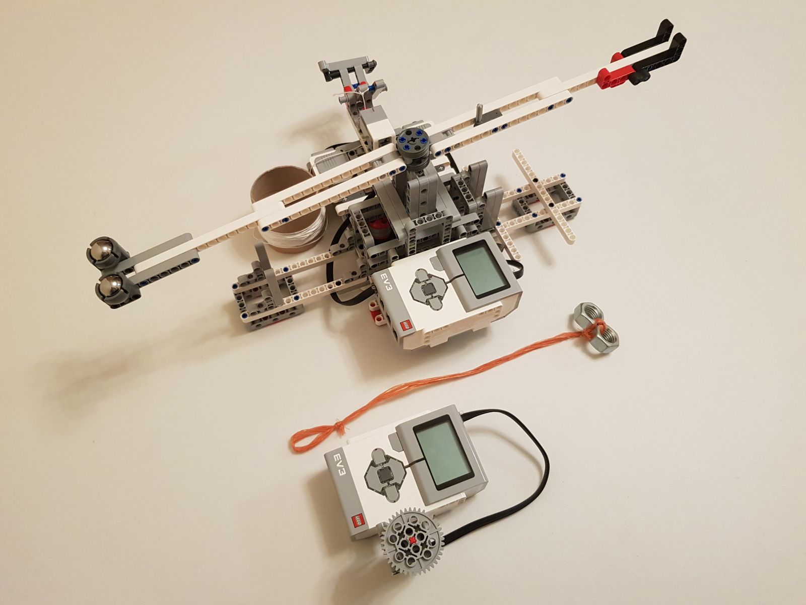 Robot na odhadzovanie kladiva tvorí jedna riadiaca jednotka EV3, dva veľké motory EV3 pre pohon ramena na hod kladivom a jeden dotykový senzor pre snímanie odhodenia kladiva a následné zastavenie pohonu ramena. Pre obmedzenie vznikajúcich vibrácií sme použili dve závažia, ktoré nie sú pevne spojené s konštrukciou robota.