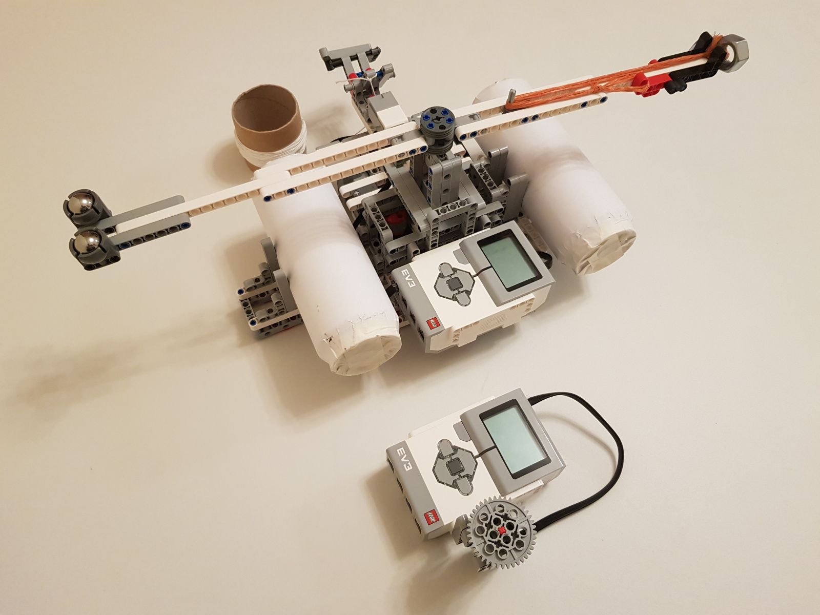 Postavili sme robota na odhadzovanie kladiva, ktoré má hmotnosť 54 g. Kladivo sme vytvorili zviazaním dvoch matíc motúzom. Kladivo pred odhodením založíme na otočné rameno so závažím na protiľahlej strane, aby počas roztáčania ramena nedochádzalo k veľkým vibráciám. Pretože bolo povolené použiť len dva motory, odhadzovanie kladiva je ovládané ručne pomocou šnúrky pripevnenej k páke, ktorá uvoľní kladivo, keď rameno prejde ponad páku. Takto sme dosiahli uvoľnenie kladiva v rovnakom mieste a dopad kladiva vo vymedzenom priestore. Aby sme predĺžili vzdialenosť dopadu kladiva umiestnili sme robota na naklonenú plochu so sklonom 45 °. Robot nie je pevne spojený s plochou, ale je zaťažený dvoma závažiami pre obmedzenie vibrácií. Bez použitia závaží sme nemohli dosiahnuť vyššie otáčky ramena, ktoré boli potrebné pre veľkú vzdialenosť odhodenia kladiva. S pomocou týchto opatrení sme dosiahli odhodenie kladiva do vzdialenosti 689 cm.