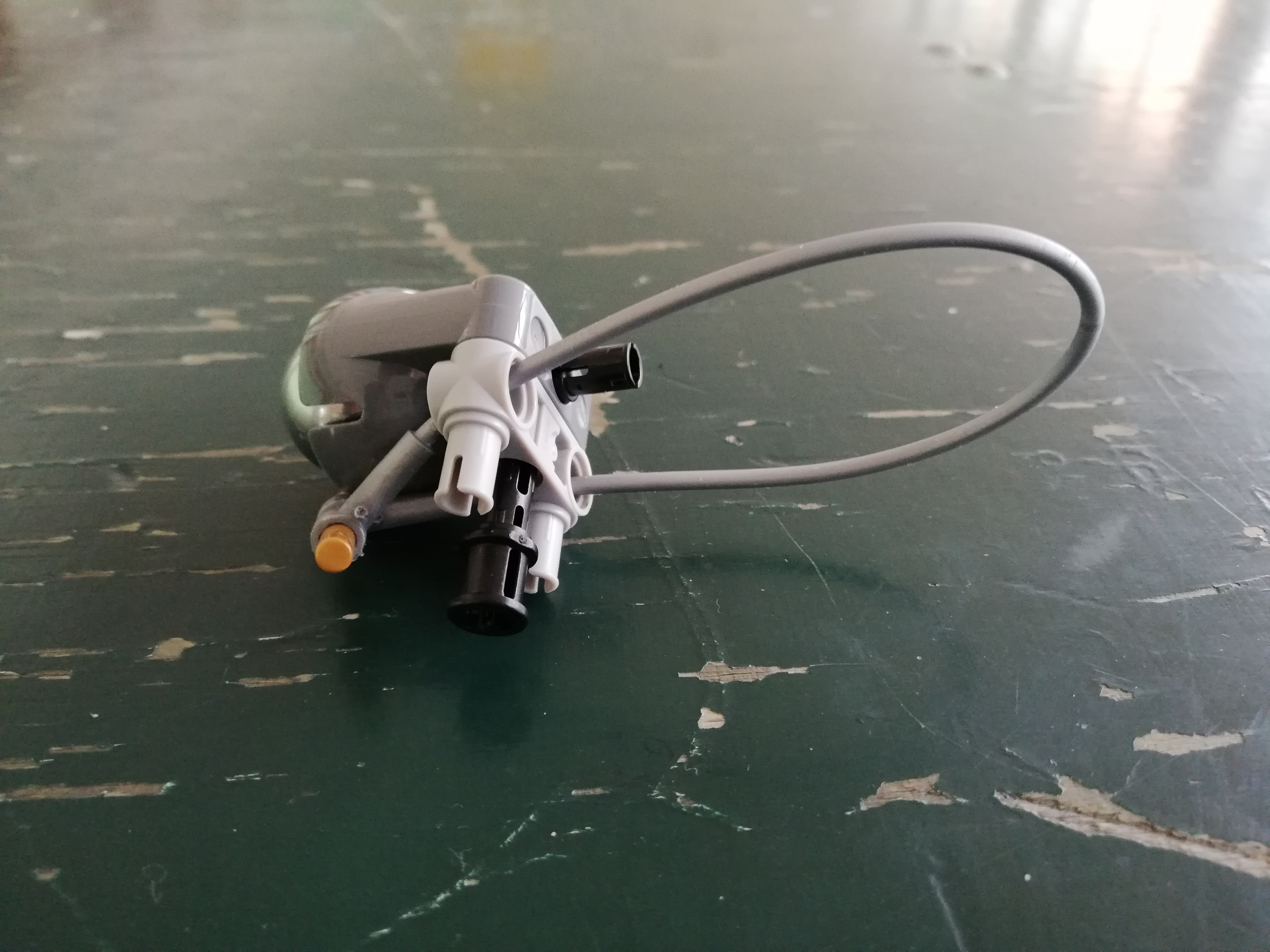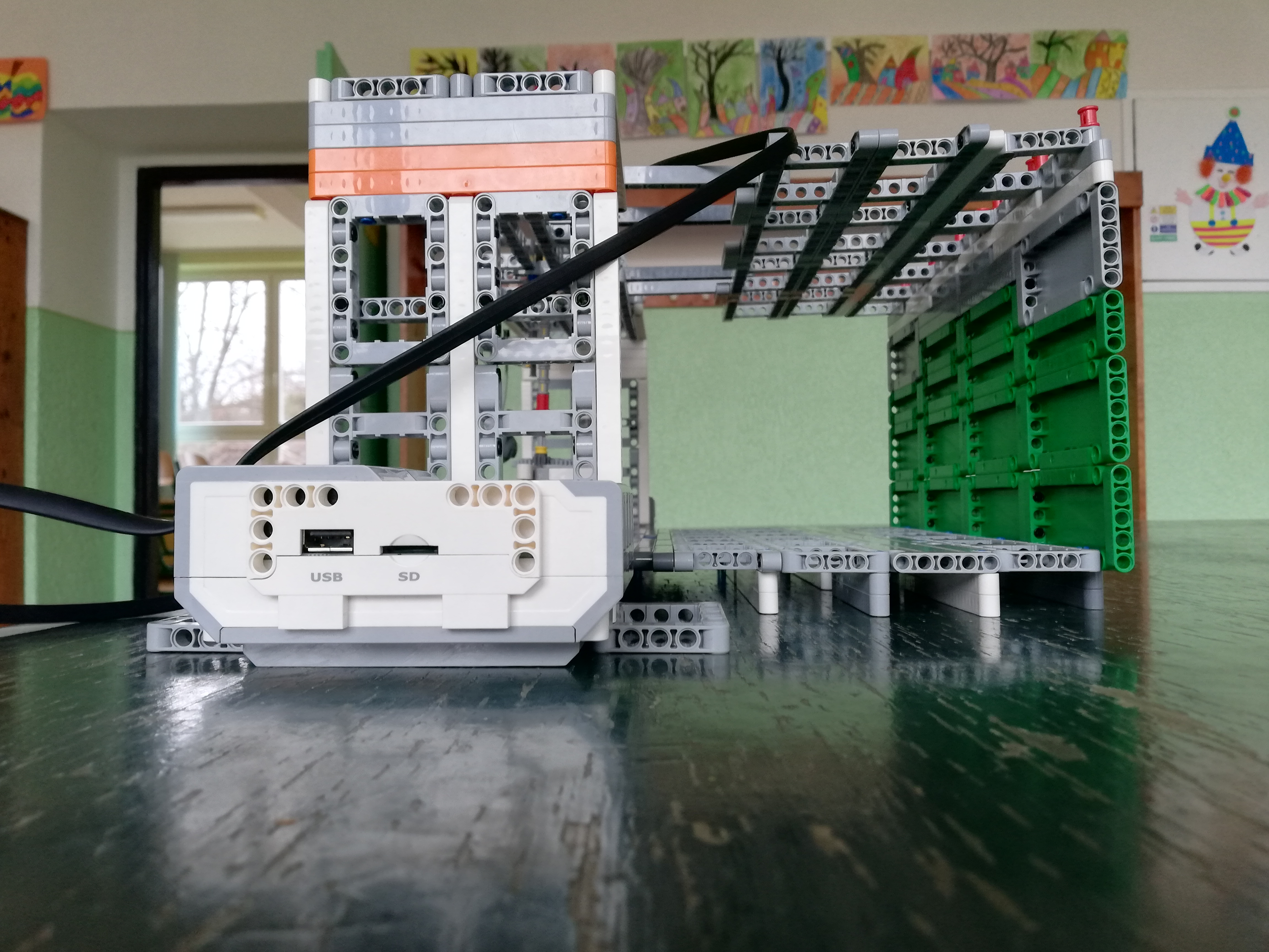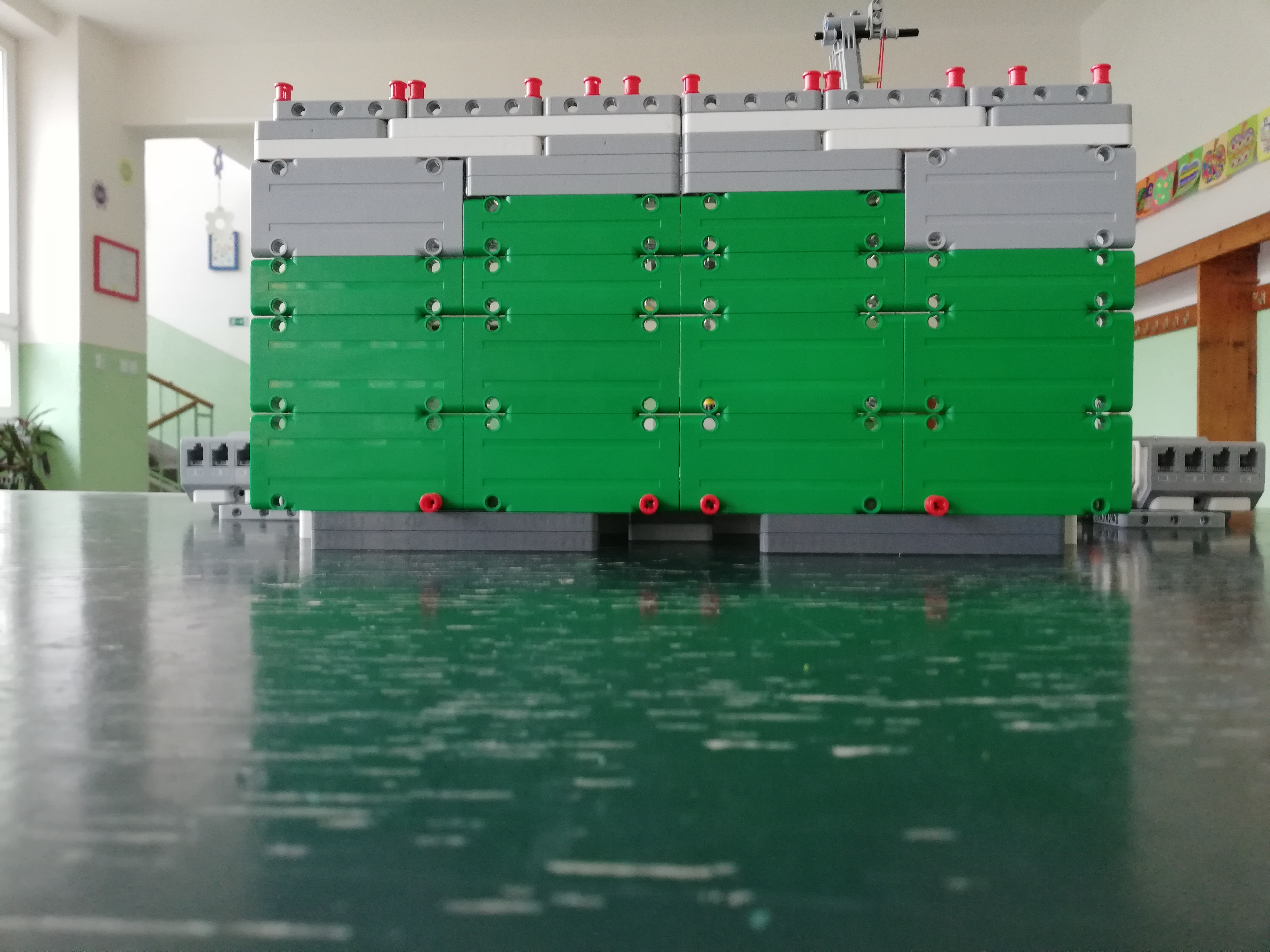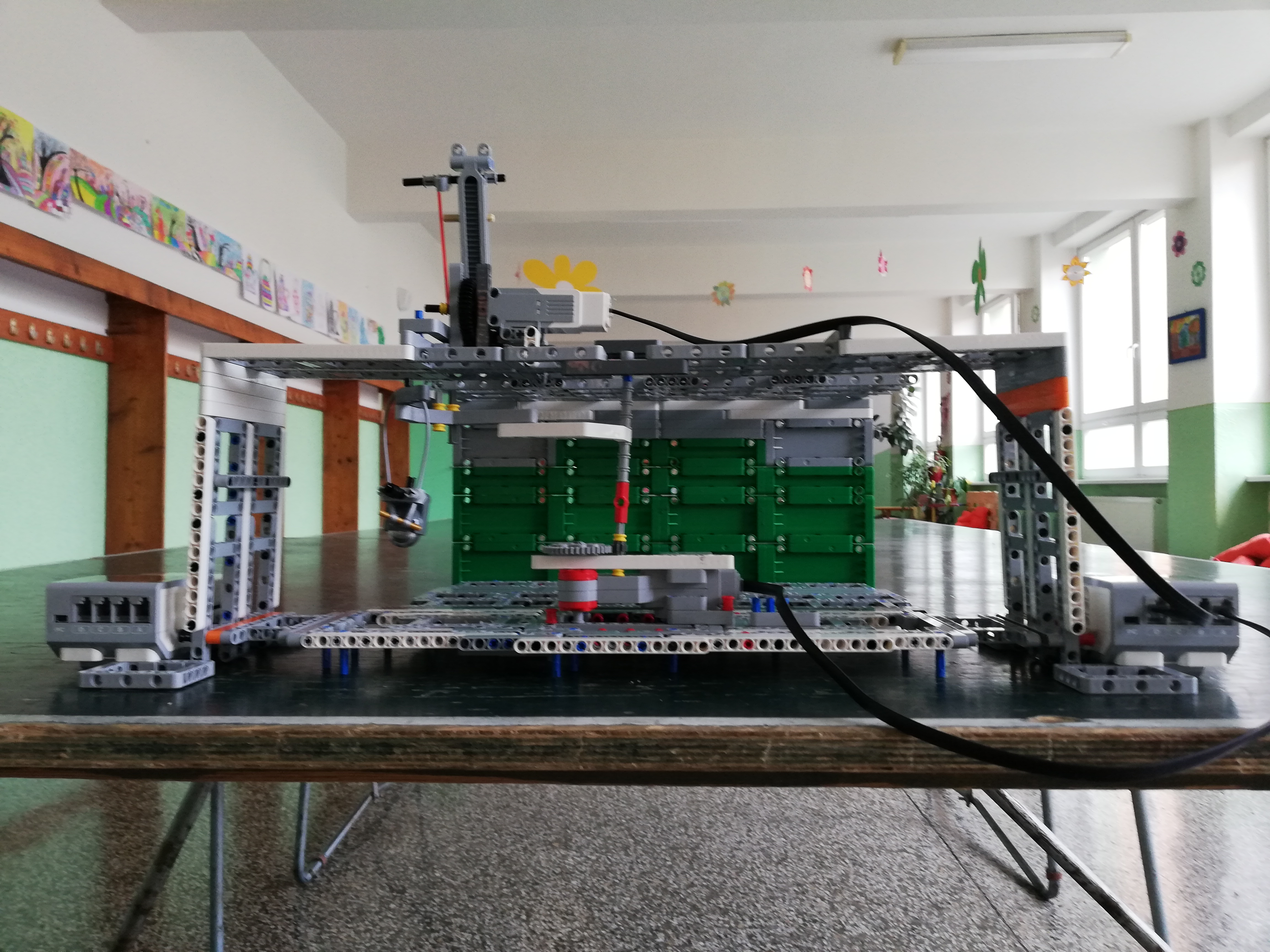 Skonštrulovali sme spodnú časť robota, ktorá je pevná a má na sebe motor. Na motor sme pripevnili väčšie ozubené koliesko, ktoré sa po zapnutí motora roztočí a dostane menšie ozubené koliesko do pohybu. Použili sme väčšie a menšie ozubené kolieska z toho dôvodu, aby sme dostali čo najväčšiu rýchlosť točenia. Dookola plochy sme postavili tri steny (zadnú a dve bočné). Steny slúžia na podporu vrhača a ako ochranná sieť. Po spustení robota sa začnú hýbať ozubené kolieska, ktoré sú pripevnené na veľkom motore a tie následne dostanú do pohybu tyč, na ktorej je závažie (kladivo - v našom prípade gulička slúžiaca pri stavbe podvozkov). Princíp vyhodenia kladiva spočíva v tom, že do roztočenej tyčky narazí súčiastka, ktorá je pripevnená na ďalší motor. Po náraze sa kladivo vyšmykne z tyče a letí do diaľky. Druhá kocka bola použitá len na väčšiu stabilitu robota.