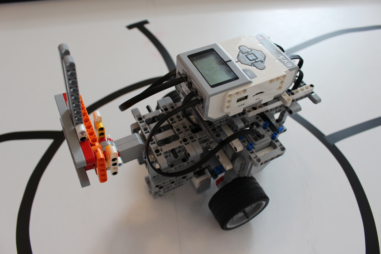 2. Potom nasleduje myblock chod_na_okraj. Keďže pri štarte je robot vnútri kružnice - myblock chod_na_okraj urobí to, že robot dôjde na kružnicu a tam sa zrovná. Teda môže štartovať z ľubovoľného miesta v kružnici - po dojazde na kružnicu sa vyrovná tak, že obidvoma optickými snímačami zastane na čiernej.