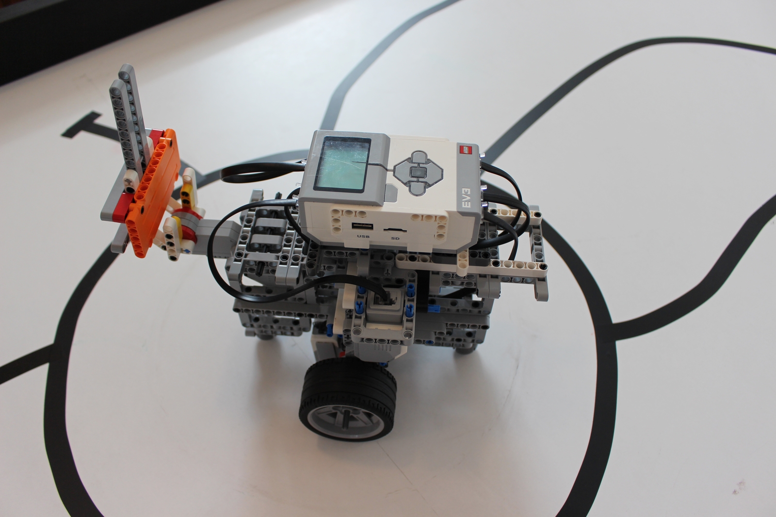 Náš robot pre túto úlohu obsahuje 3 veľké motory a 3 optické snímače. 2 motory slúžia na pohyb robota, tretím motorom kladieme poklad na koniec cesty. 2 optické snímače využívame pri pohybe po čiernej páske, tretí snímač slúži na zisťovanie odbočky. Program je veľmi dlhý, obsahuje 7 vytvorených myblockov. Prvýkrát sme pri programovaní použili polia.