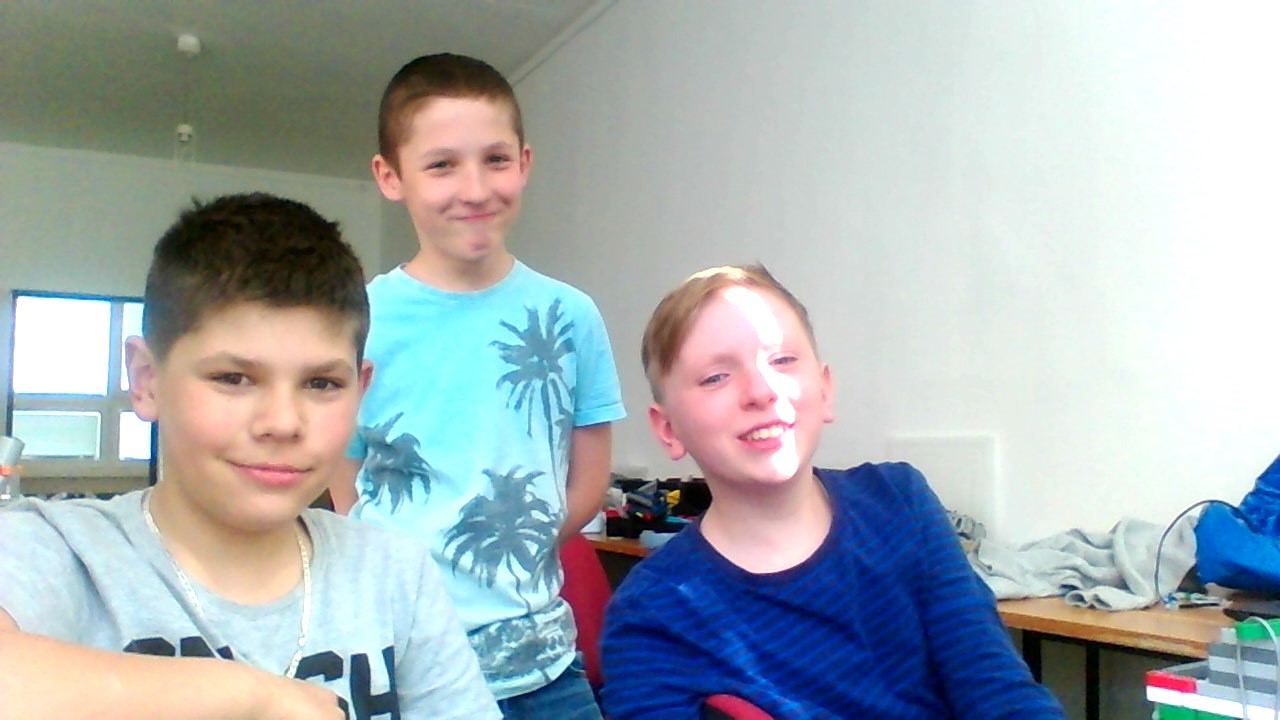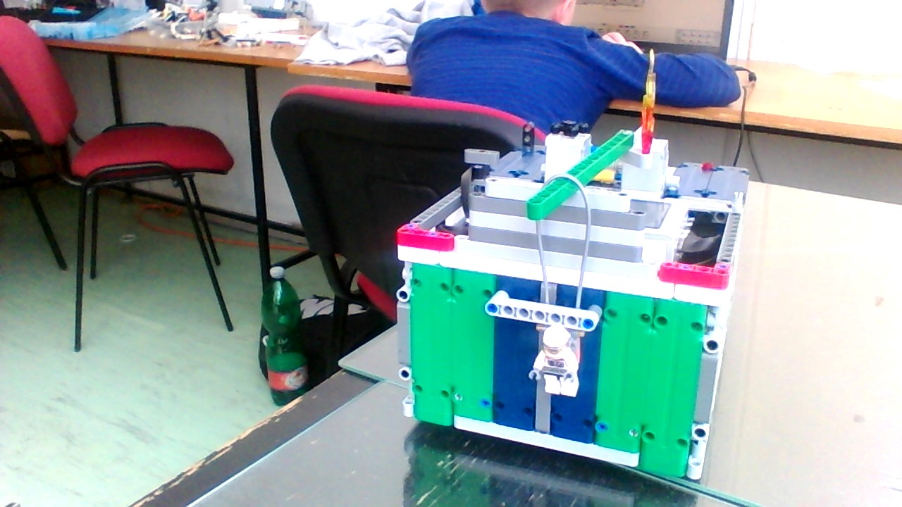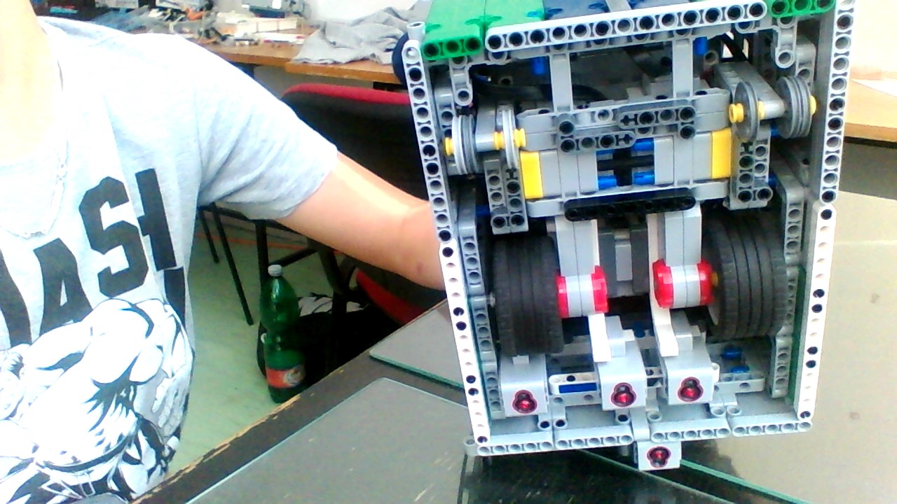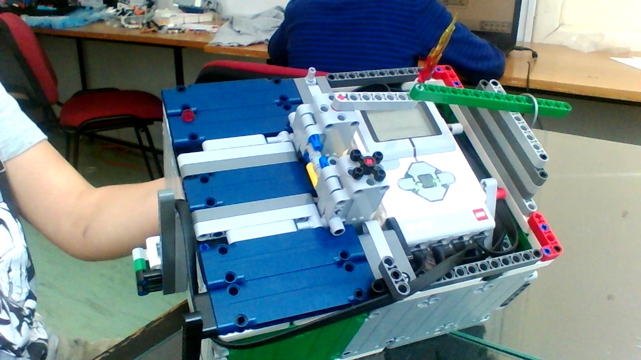 Robota sme postavili celého,4 svetelné senzory sú tam preto aby zaznámenávali farby na ceste toho robota.Nemáme to všetko dokončené lebo sme nestíhali.2 senzory zaznámenávajú že či je robot na čiare.Ten senzor v predu zaznamenava koniec čiary a keď víde z čiernej tak zastavý a spustí panáka (poklad).4 senzor zaznamenáva odbočky ked zaznamena čiernu tak bude robot bočiť do ľava do kým ľavý senzor nezaznamená čiernu potom pôjde rovno. Malo tam byť ešte to aby robot zaznamenával čiaru.