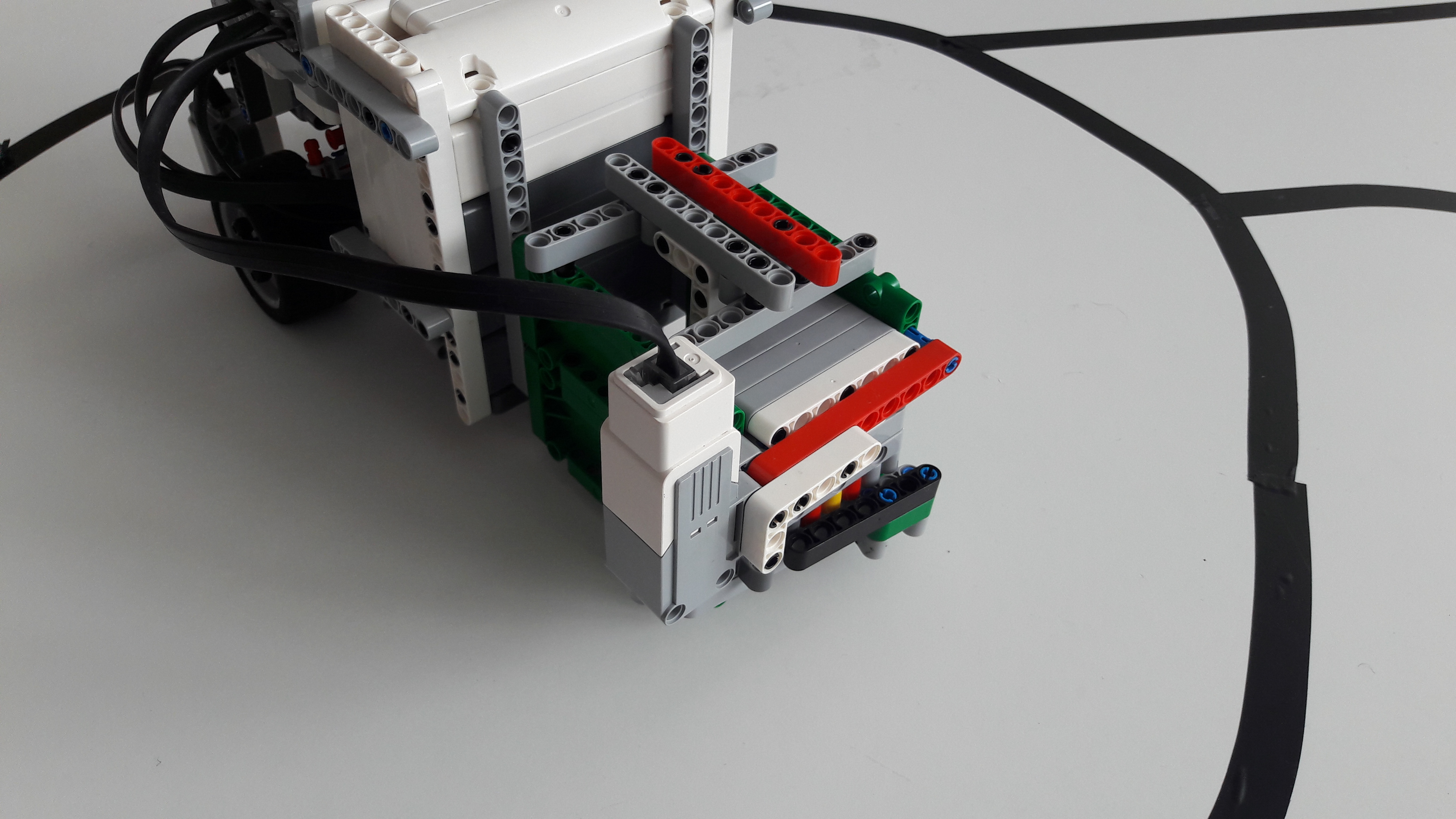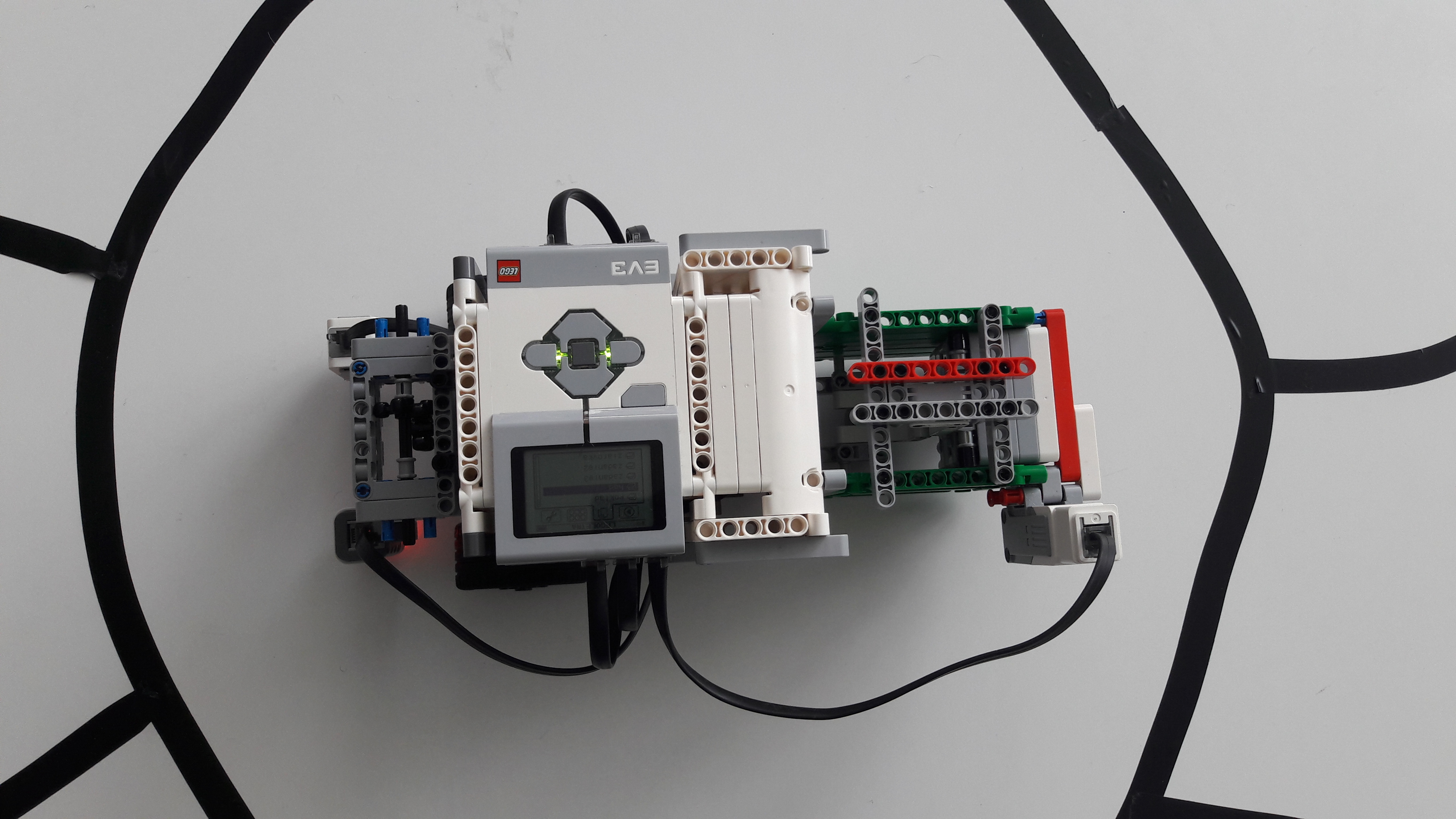 Robot potom prenasleduje čiaru so senzorom 3 dokým senzor 1 nezaznamená čiernu čiaru (kruh). Ak sa to stane, posunie sa dopredu, aby color senzor 1 bol na bielej a začne sa robot otáčať dokým senzor 1 nenájde čiernu čiaru.