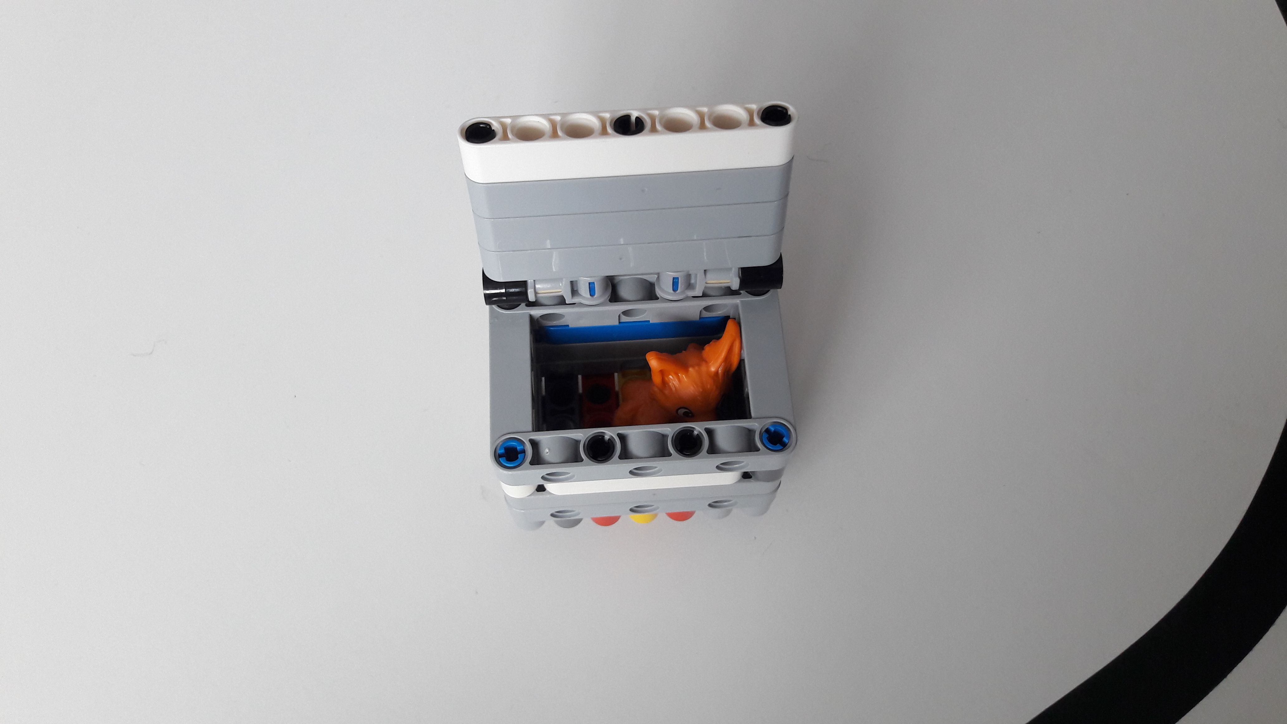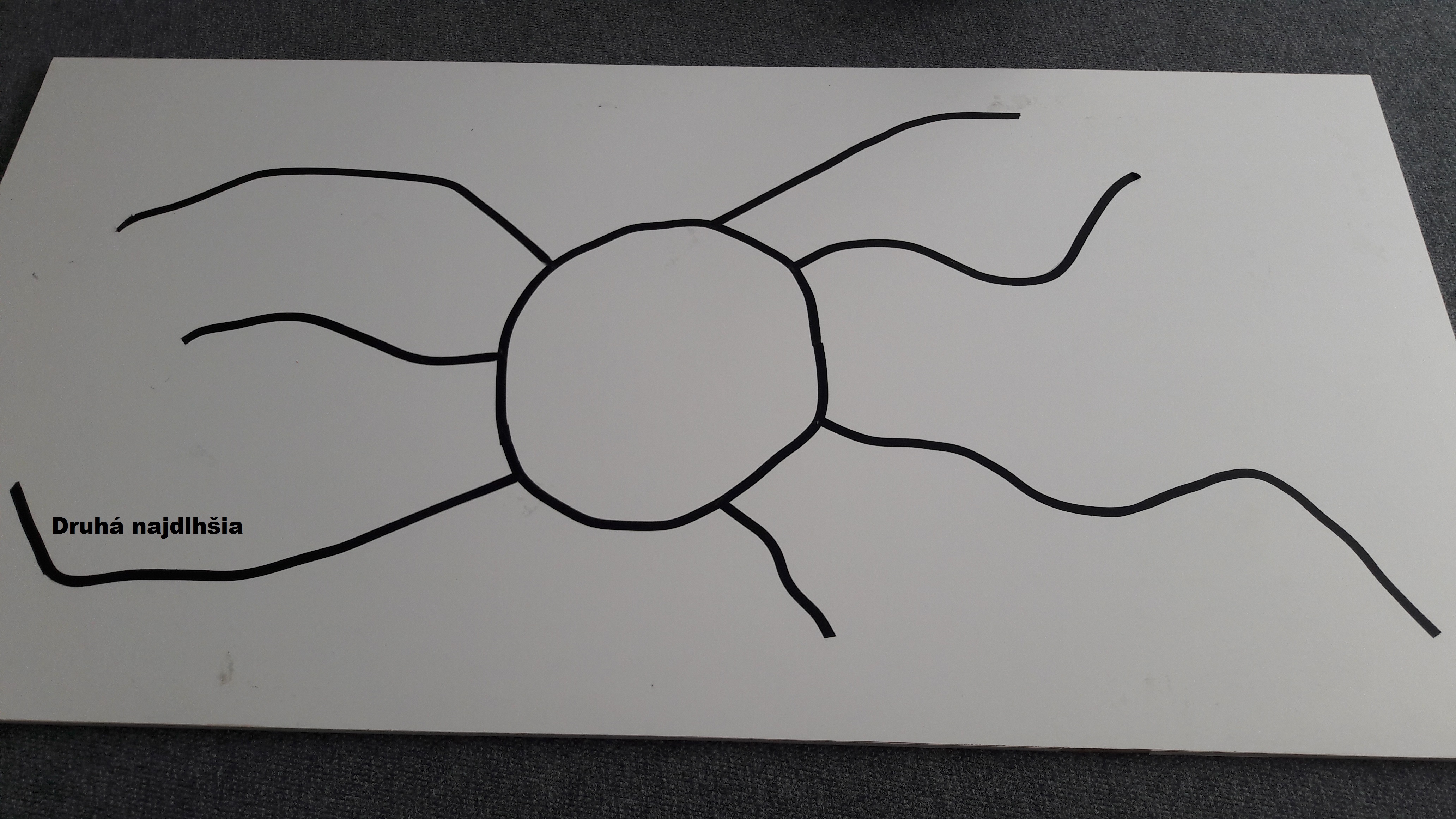 Senzor 1 začne prenasledovať čiaru (kruh) a robot pomocou senzora 3 počíta okolo koľkých čiar robot prešiel. Pokiaľ sa ten počet rovná "číslu" druhej najdlhšiej čiary, začne ju senzor 1 prenasledovať na koniec a tam po otočení robot vypustí poklad.