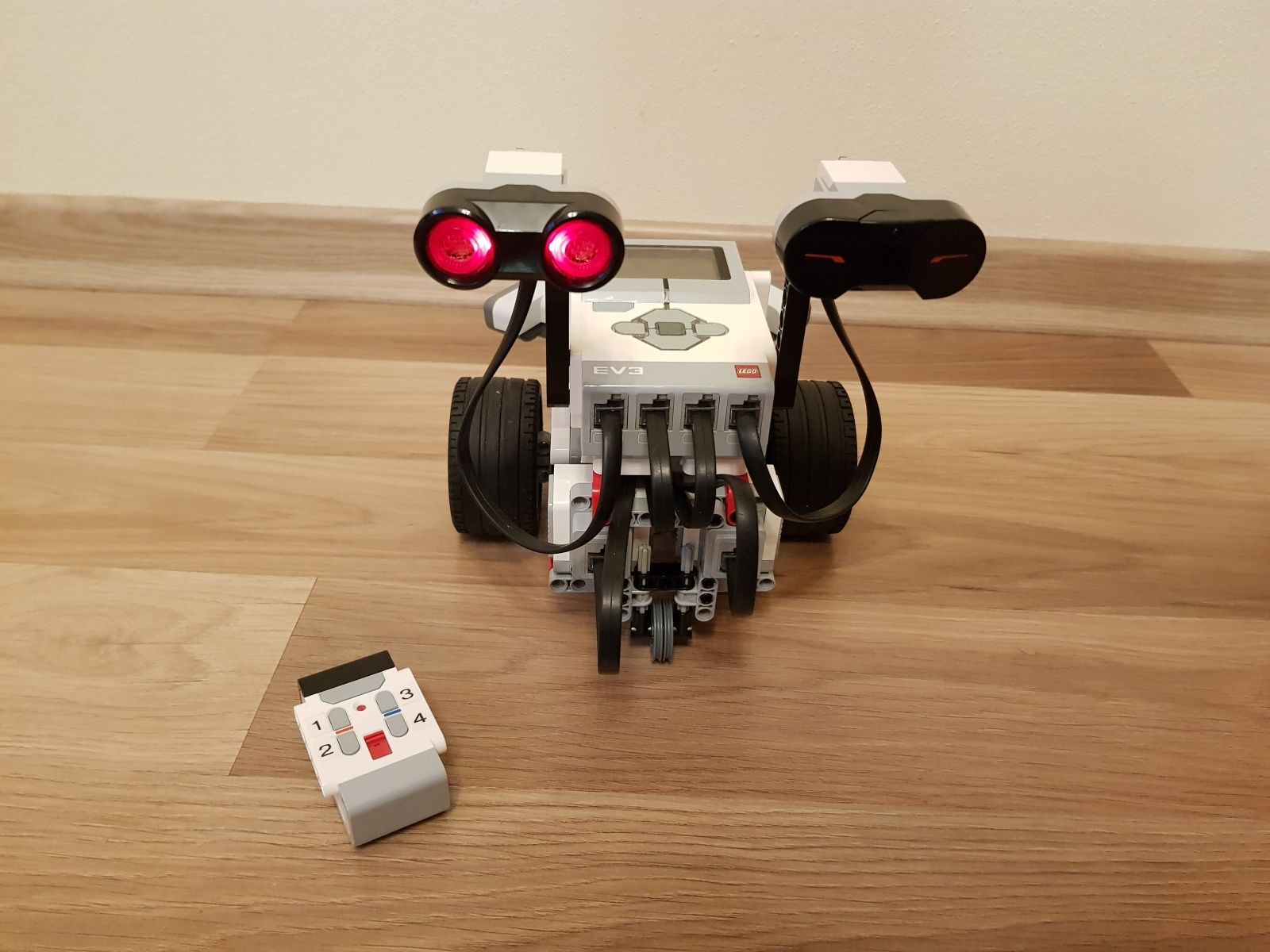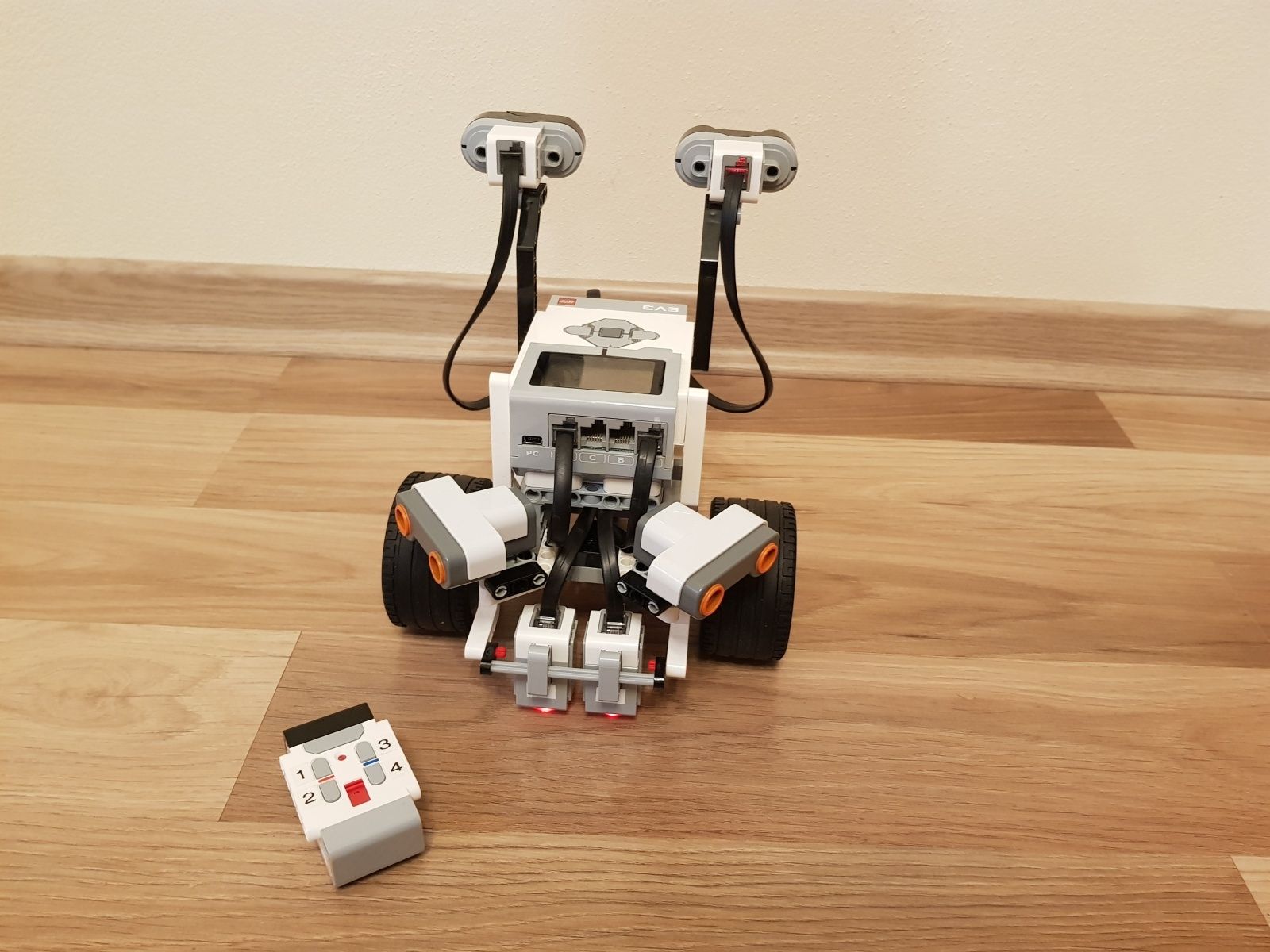 Robot tvorí jedna riadiaca jednotka EV3, dva veľké motory EV3 pre pohyb, dva optické senzory pre sledovanie odrazeného svetla od čiary, jeden ultrazvukový senzor pre sledovanie vzdialenosti od návštevníka, jeden infračervený pre príjem príkazov od diaľkového ovládača. Ďalšie dva ultrazvukové NXT senzory nie sú pripojené.