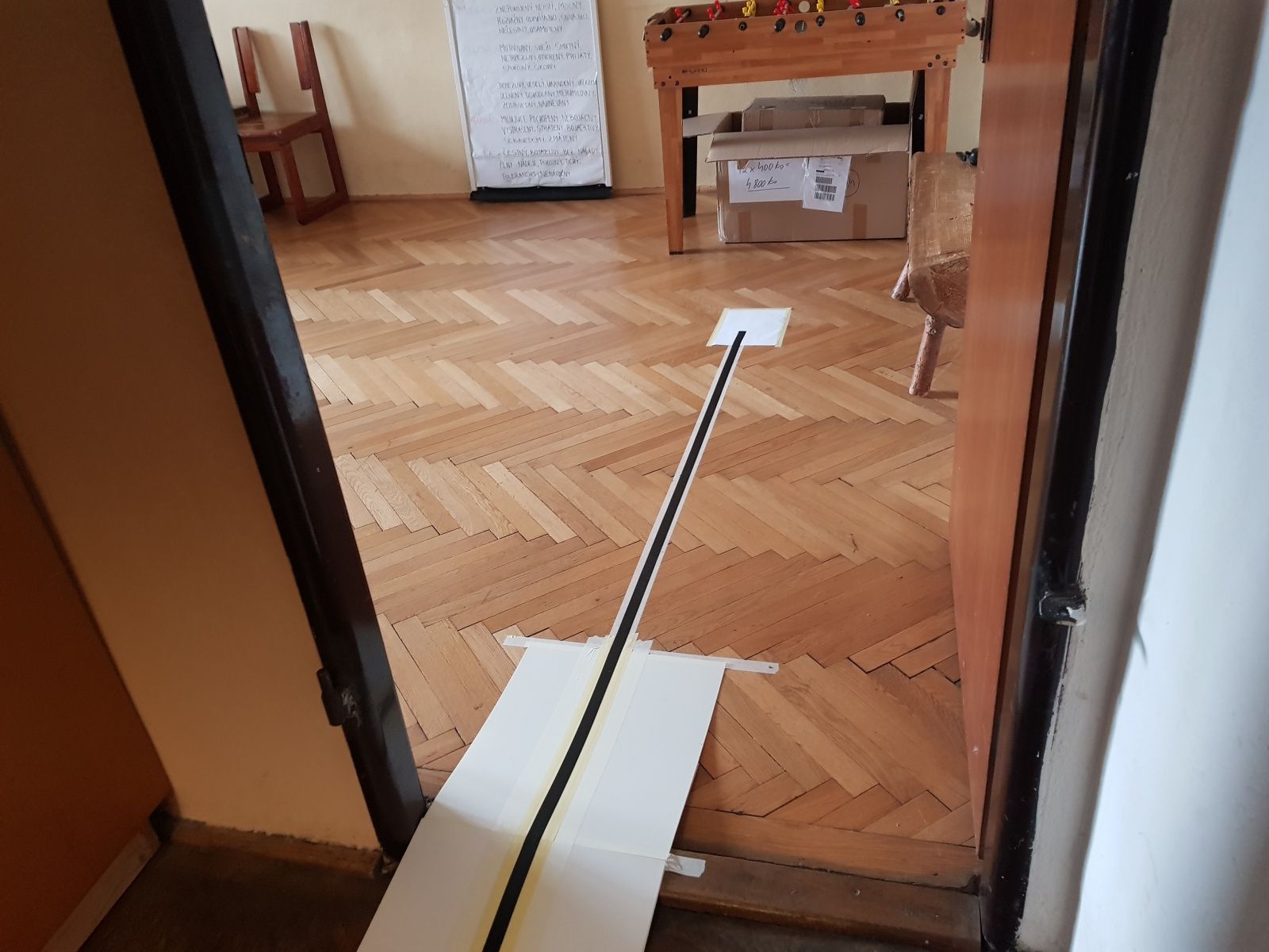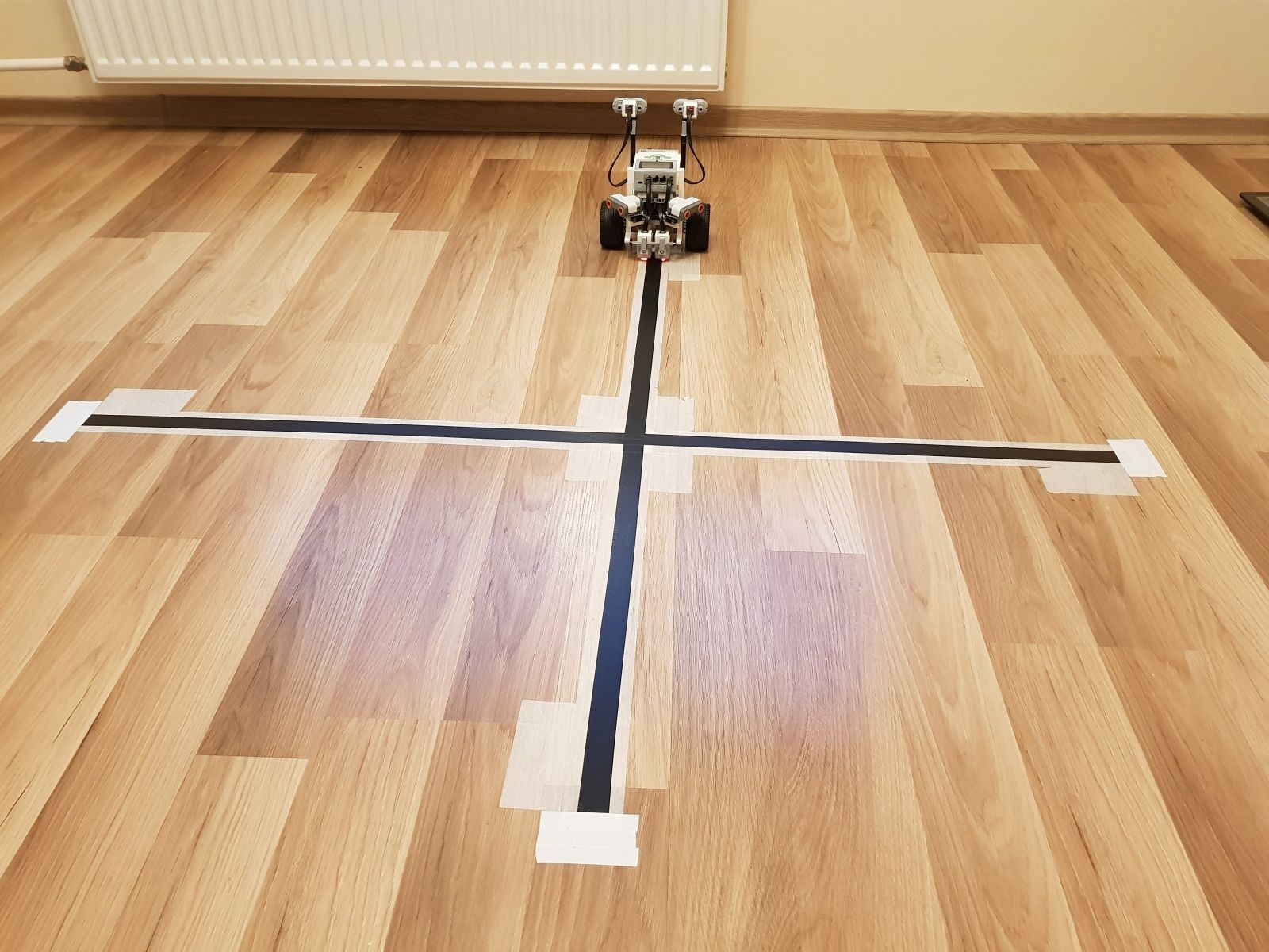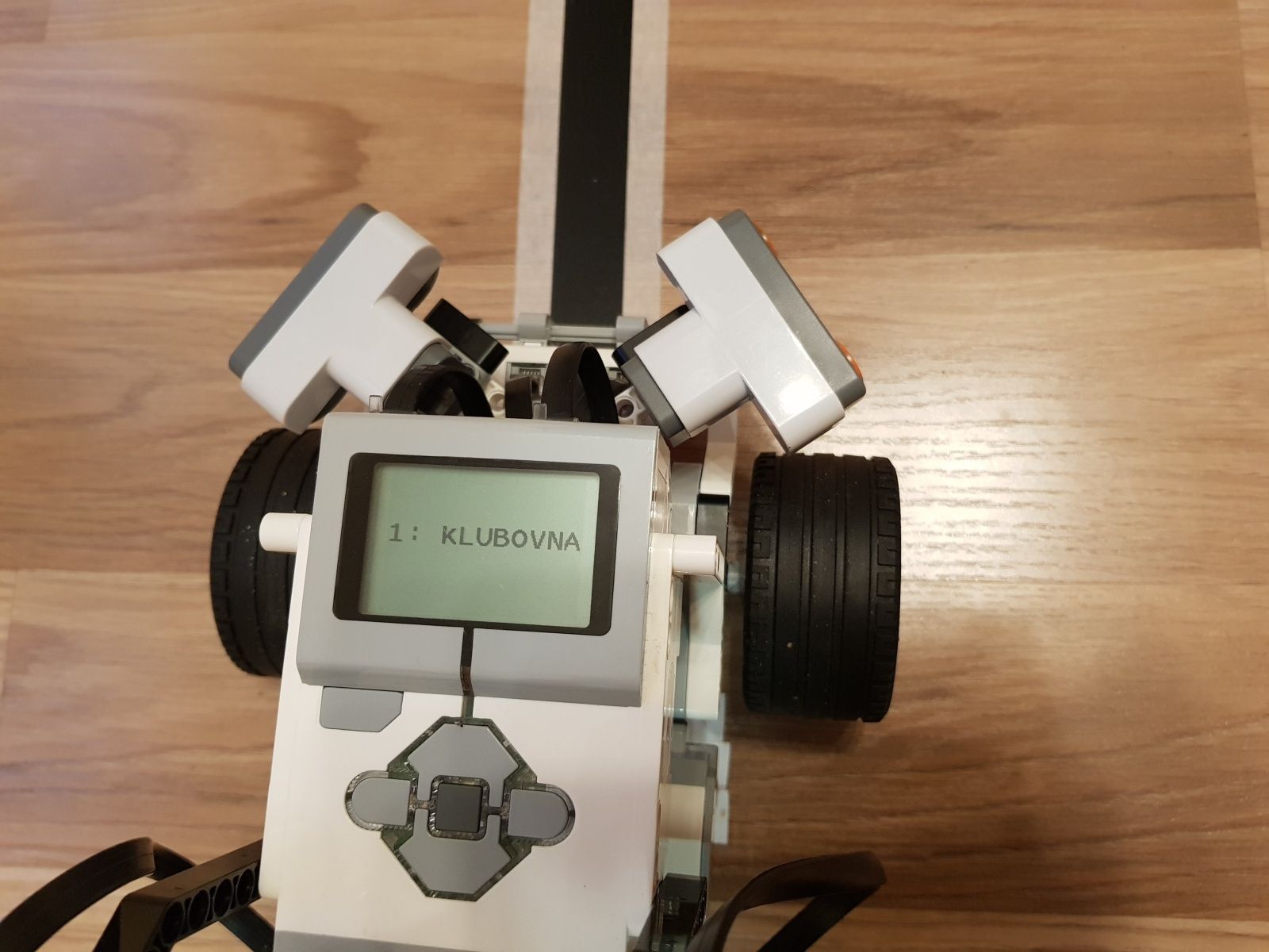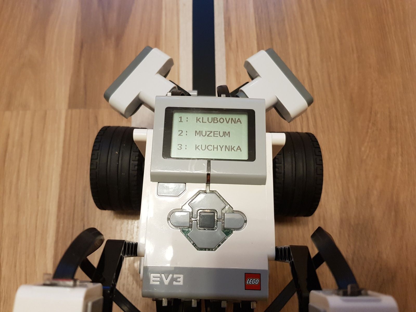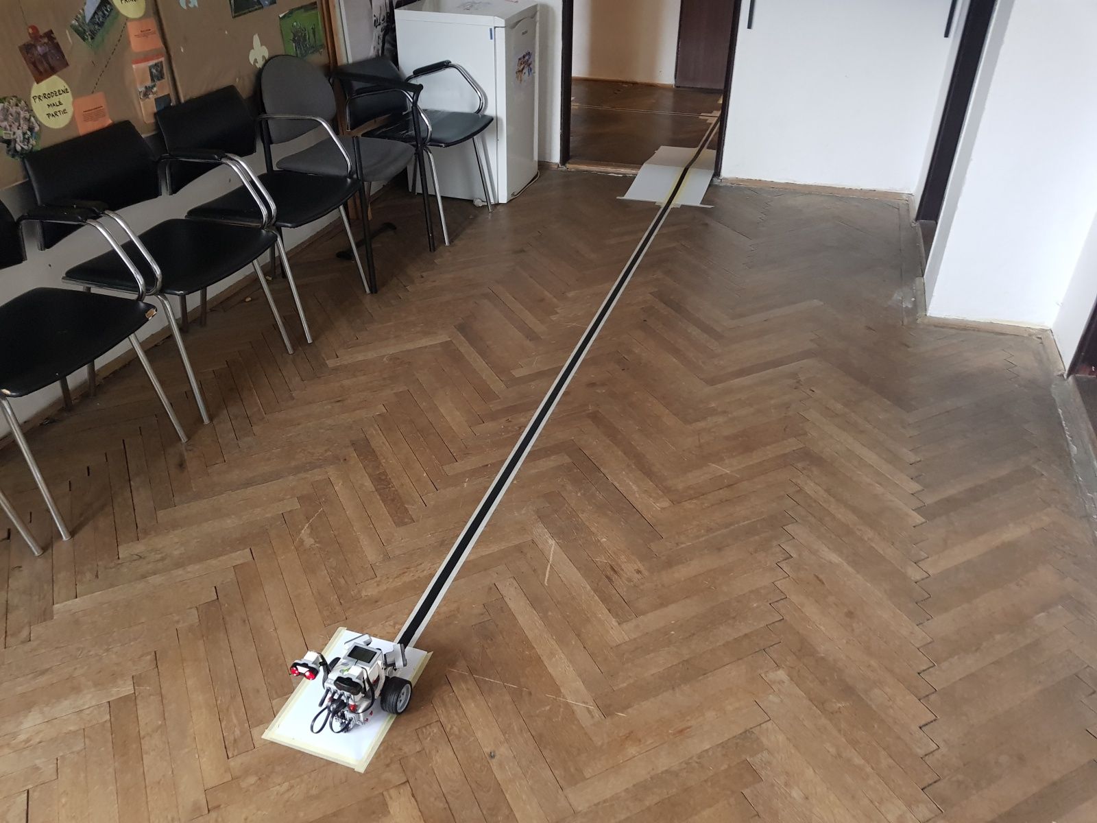 Pôvodne sme chceli použiť pre navádzanie v priestore dva ultrazvukové NXT snímače, ale nepodarilo sa nám vytvoriť funkčné riešenie, preto sme zvolili navádzanie pomocou dvoch optických snímačov a čiary vyznačenej na podlahe, tak ako v prípade úlohy dva v tomto zadaní. Pri skúškach doma toto riešenie išlo dobre, ale v klubovni zlyhalo kvôli prahom, s ktorými sme pri návrhu neuvažovali. Pri prechode cez prah dverí sa menila vzdialenosť snímača od podkladu, čo viedlo k zmene množstva odrazeného svetla a chybnému vyhodnocovaniu. Počas skúšky v klubovni sme už nedokázali nájsť také nastavenia, ktoré by vyhovovali všetkým okolnostiam a spoľahlivo navádzali robota od začiatku až po vybraté miesto.
