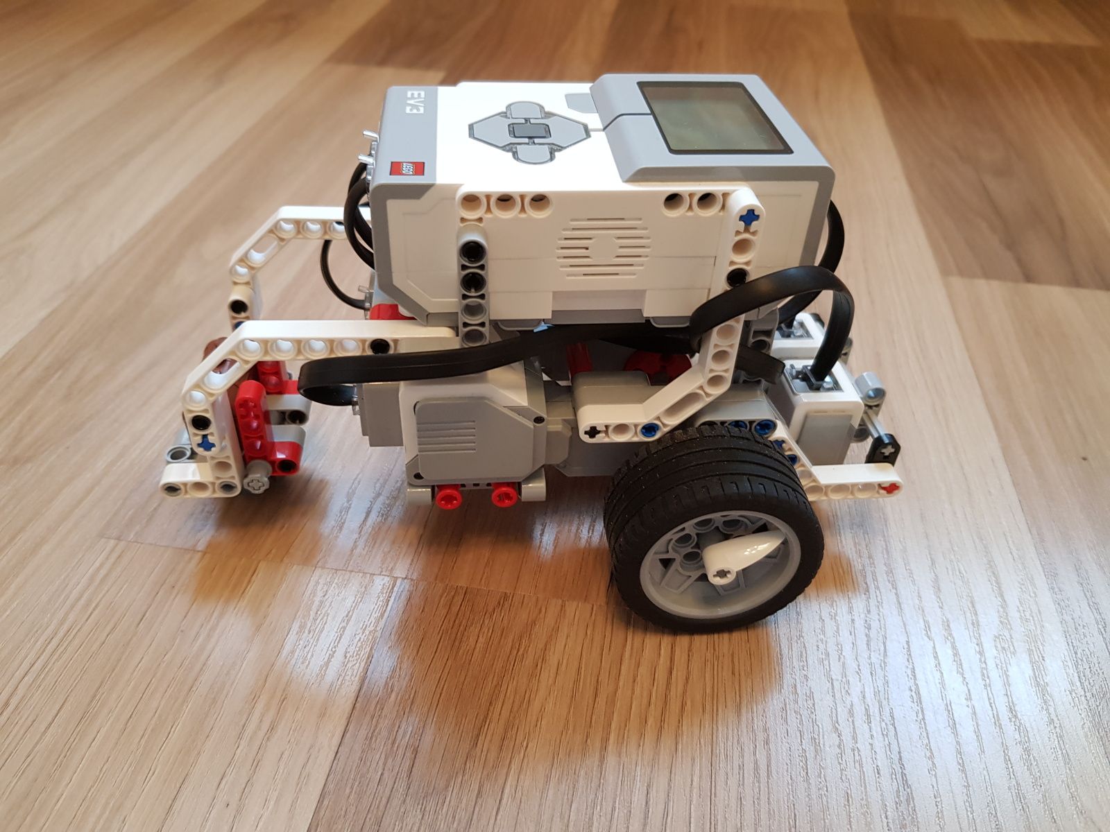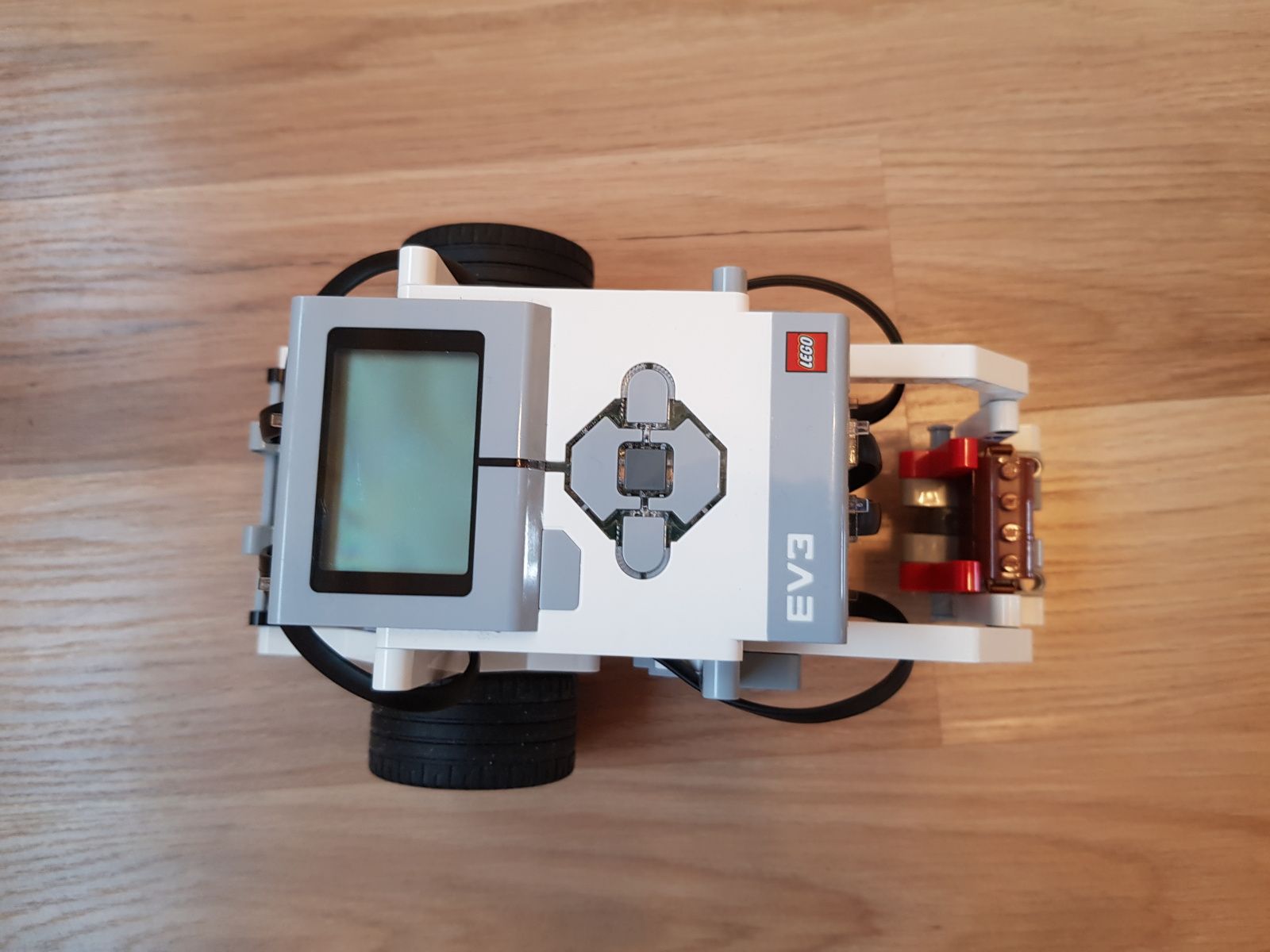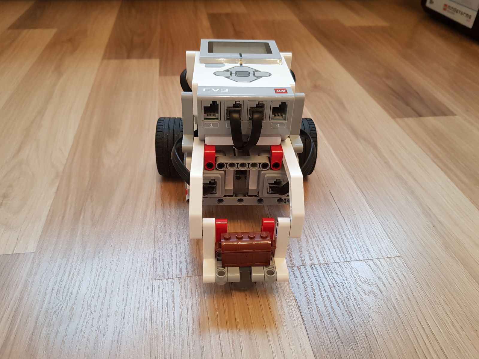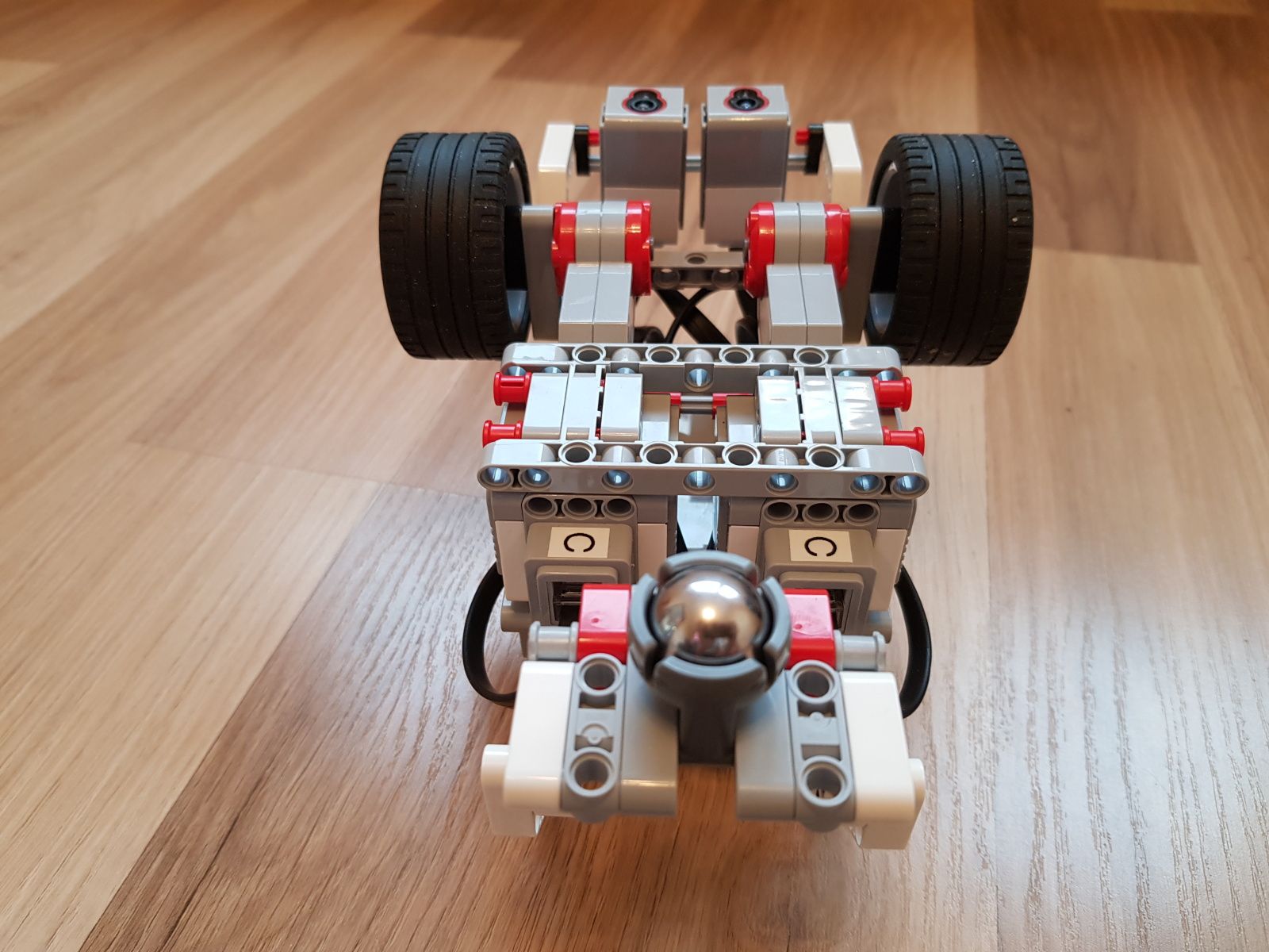 Robot tvorí jedna riadiaca jednotka EV3, dva veľké motory EV3 pre pohyb, dva optické senzory pre sledovanie odrazeného svetla od čiary a podložky. Vzadu je malý priestor pre uloženie pokladu.