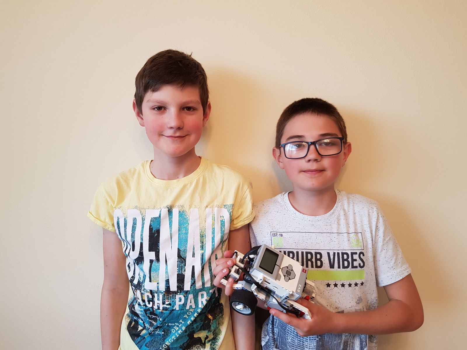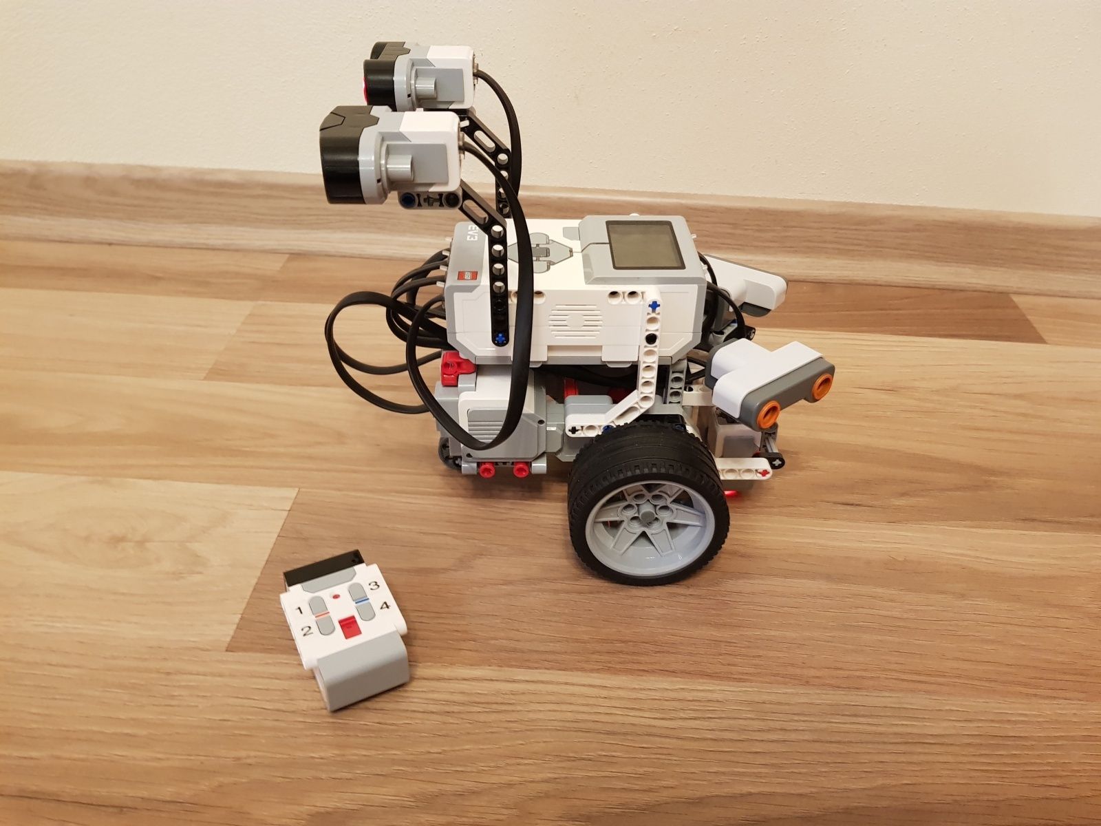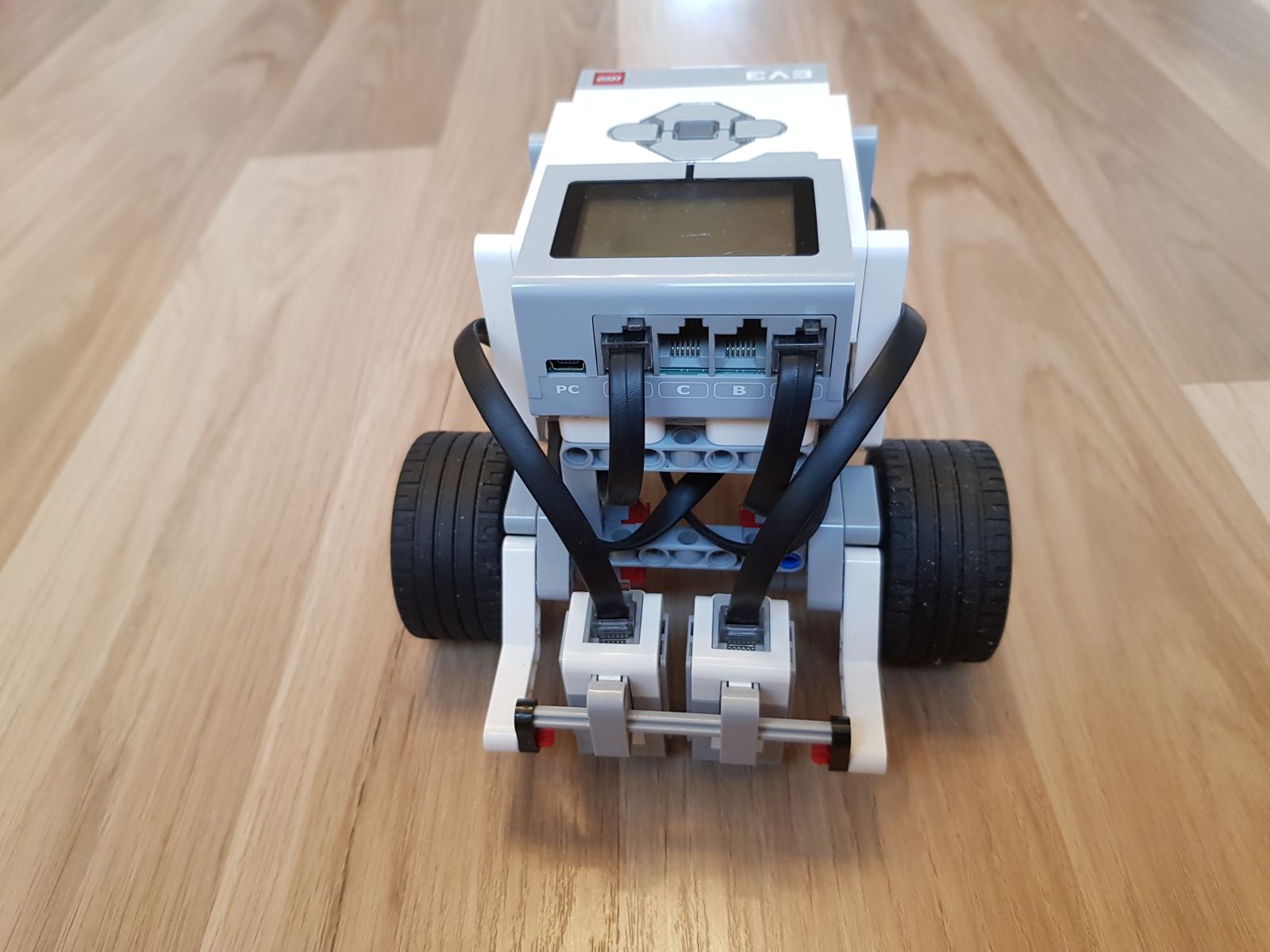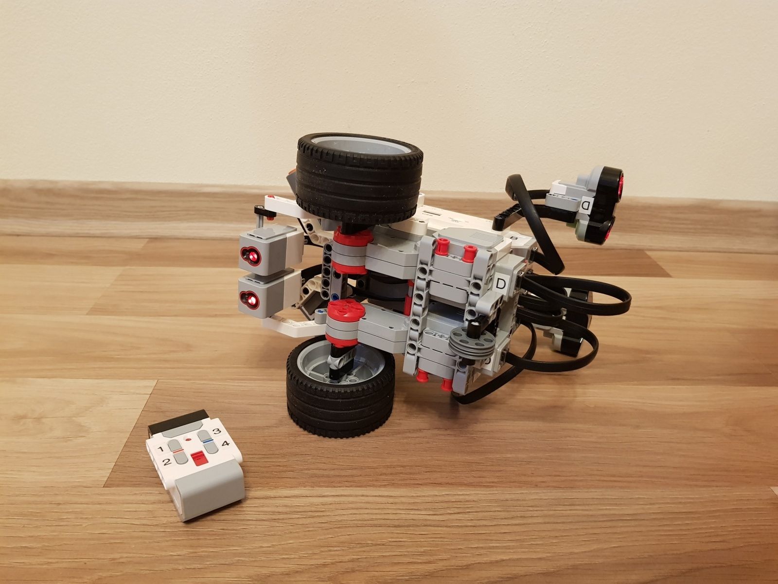 Robot tvorí jedna riadiaca jednotka EV3, dva veľké motory EV3 pre pohyb, dva optické senzory pre sledovanie odrazeného svetla od čiary a podložky. Vzadu je malý priestor pre uloženie pokladu.