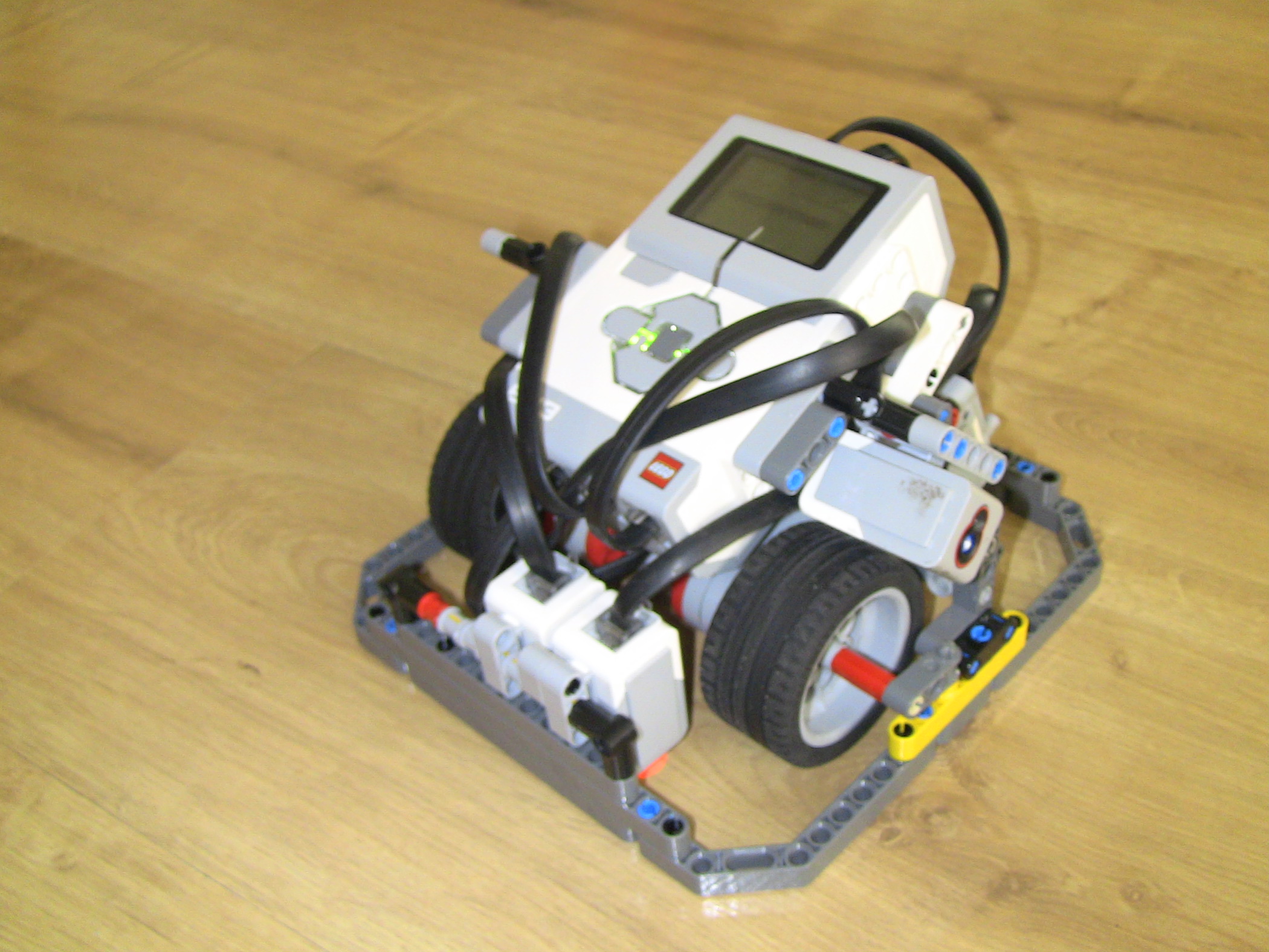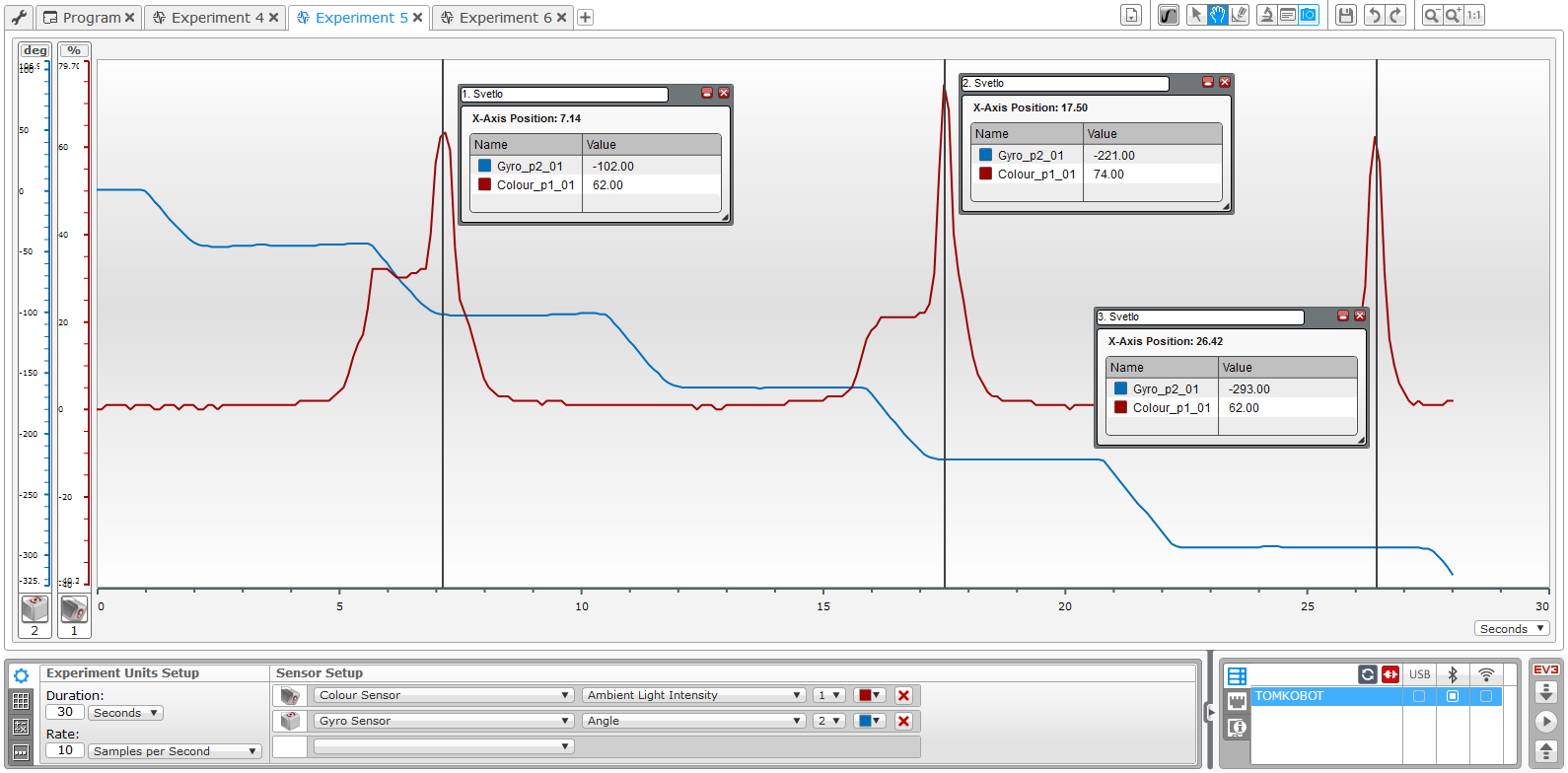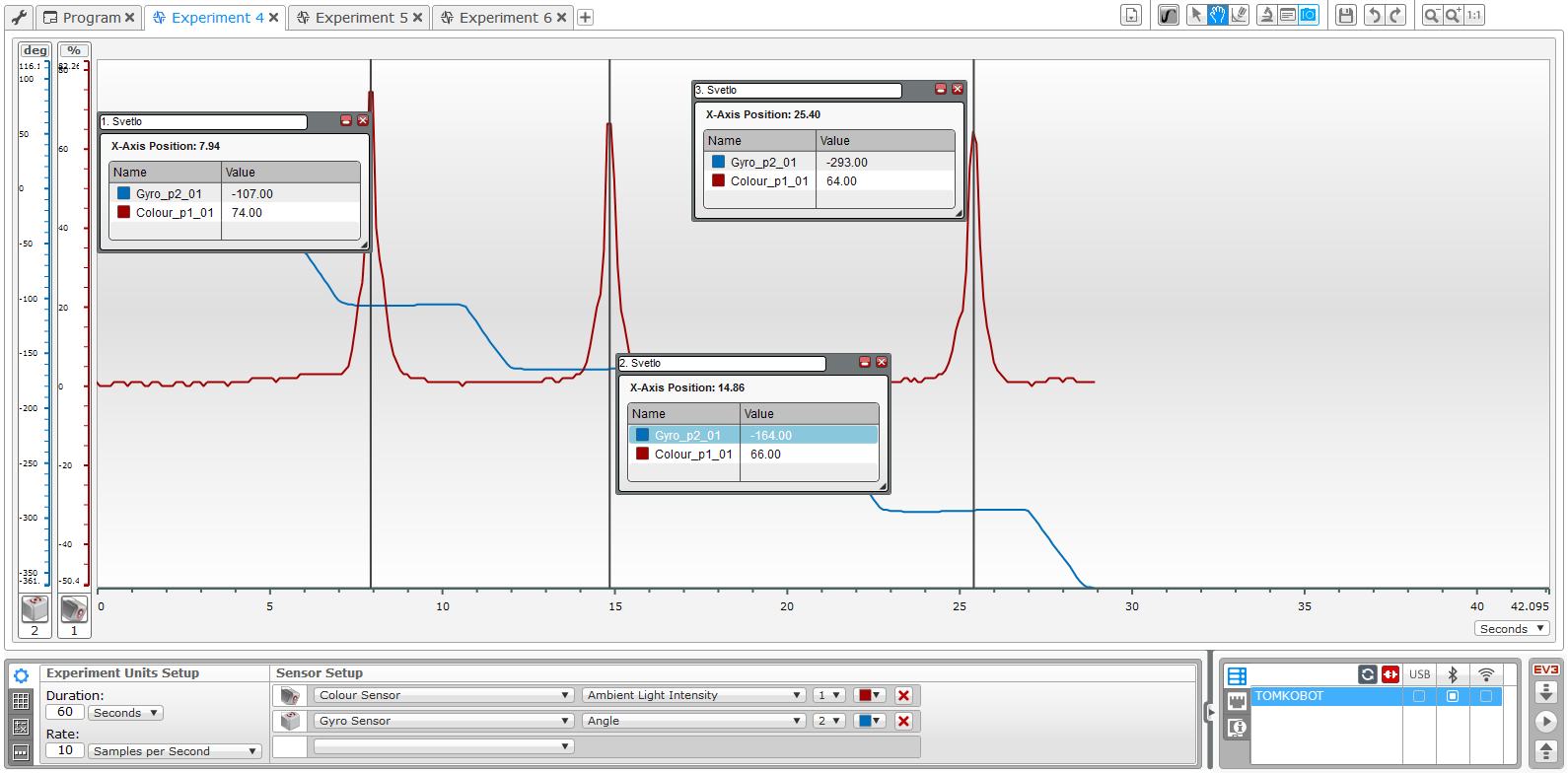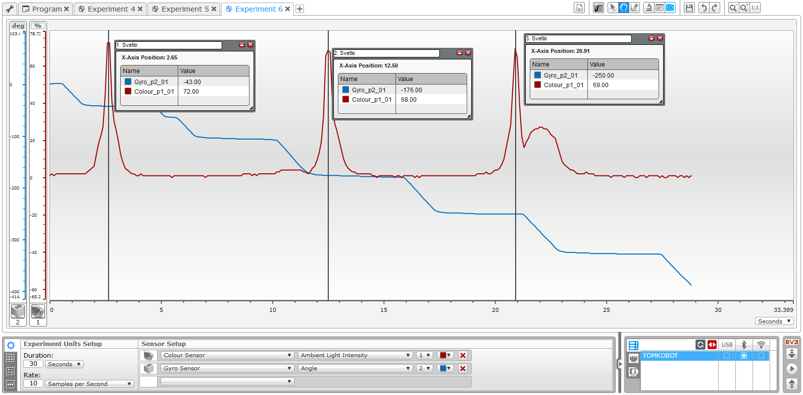 Robot približne sleduje čiaru dvoma senzormi a pritom zaznamenáva údaje z Gyro senzora a farebného senzora na boku