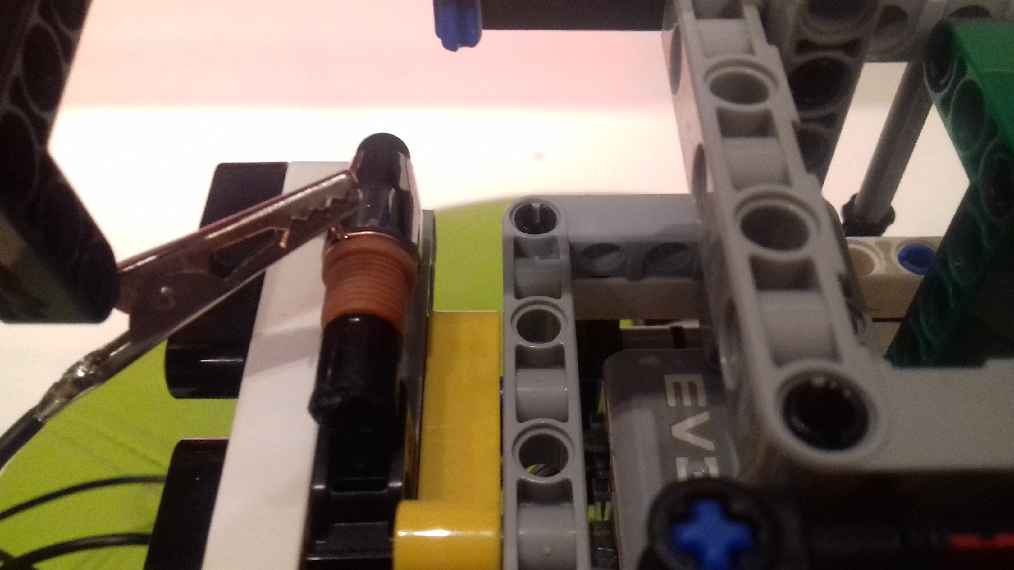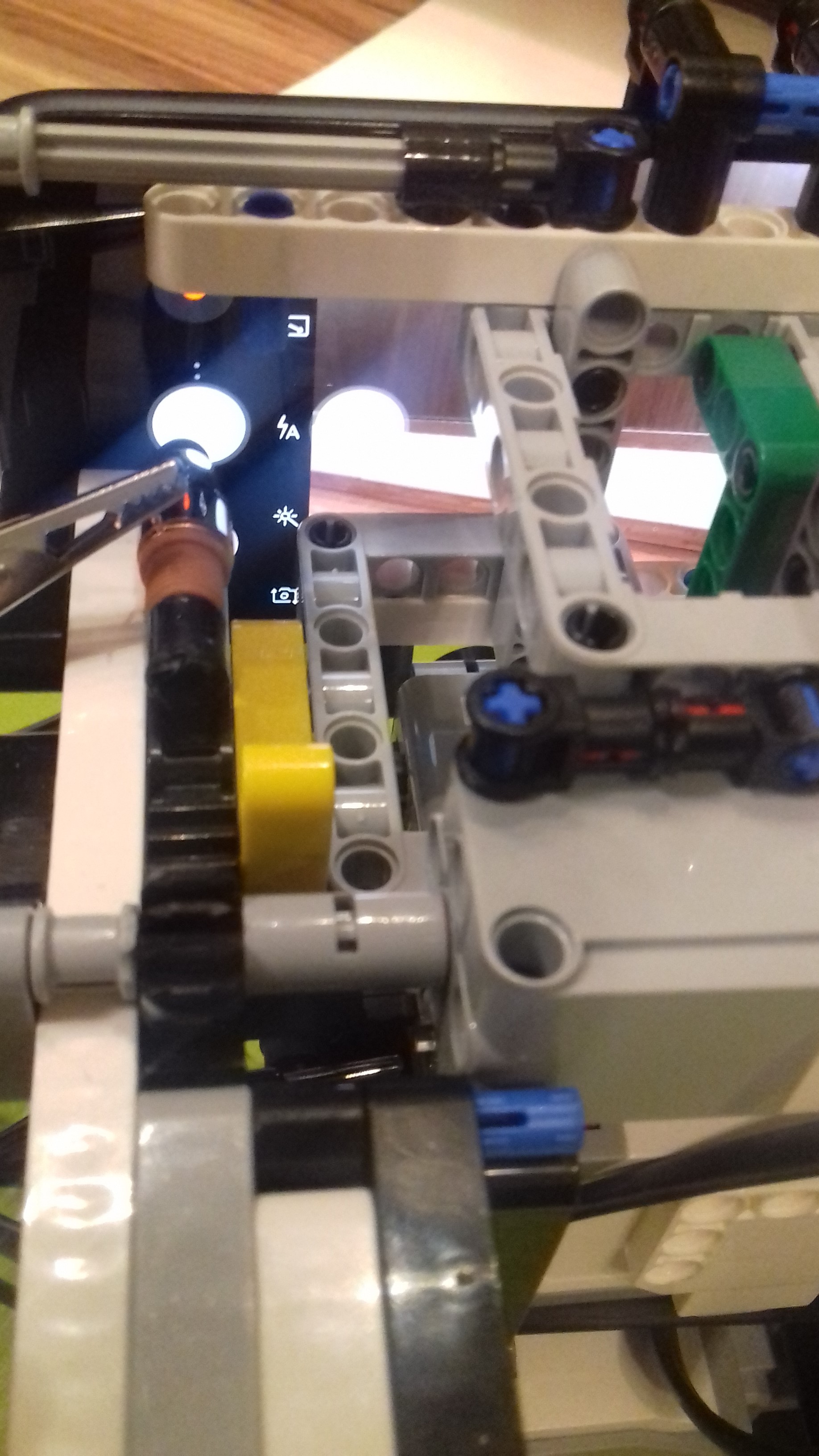 Popis fotiaceho mechanizmu: Na medium motor sme pripevnili malé ozubené koleso, ktoré svojim otáčaním posúva ozubenú tyč. Na jej konci sme pripevnili dotykovú koncovku z pera, ktorá presne zapadla do pravouhlej lego súčiastky. Držiak telefónu je jednoduchá konštrukcia v tvare U, ktorá má voľné miesto na fotoaparát aj na jeho spustenie. Proti vypadnutiu mobilu sme na boku pripevnili záklapku v tvare L.