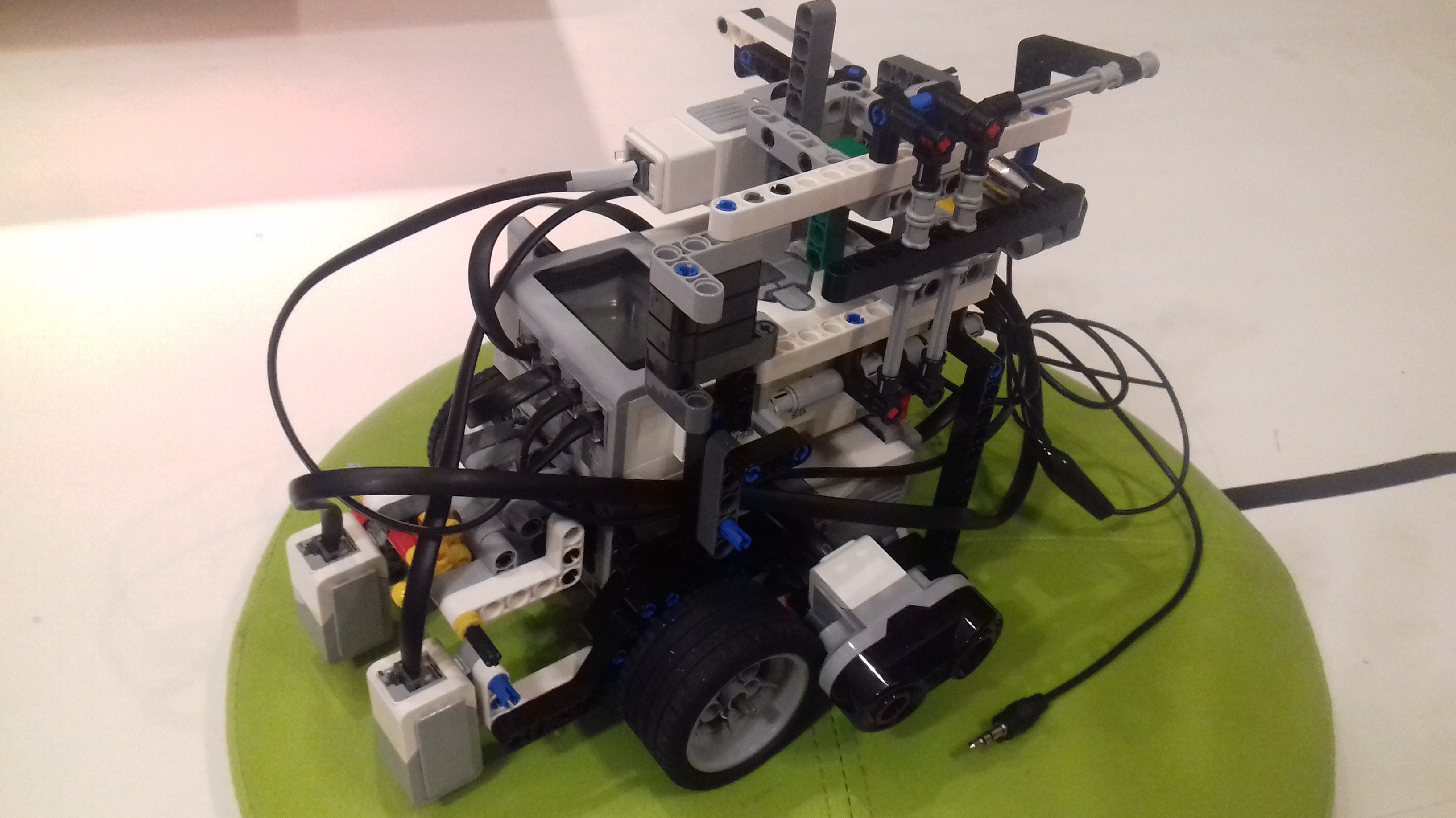 POPIS ROBOTA: Náš robot je základný robot, ku ktorému sme pripojili 3 senzory, jeden medium motor a 2 large motory, ktoré používame na pohyb. Na pohyb po čiare a zastavovanie sme použili 2 color senzory a na robenie fotky sme použili 1 medium motor. Na uzemnenie časti ktorá sa posúva pomocou medium motora tak, aby sa dotkla displeju, sme použili audio kábel ktorého zem sme na túto súčiastku pripojili.