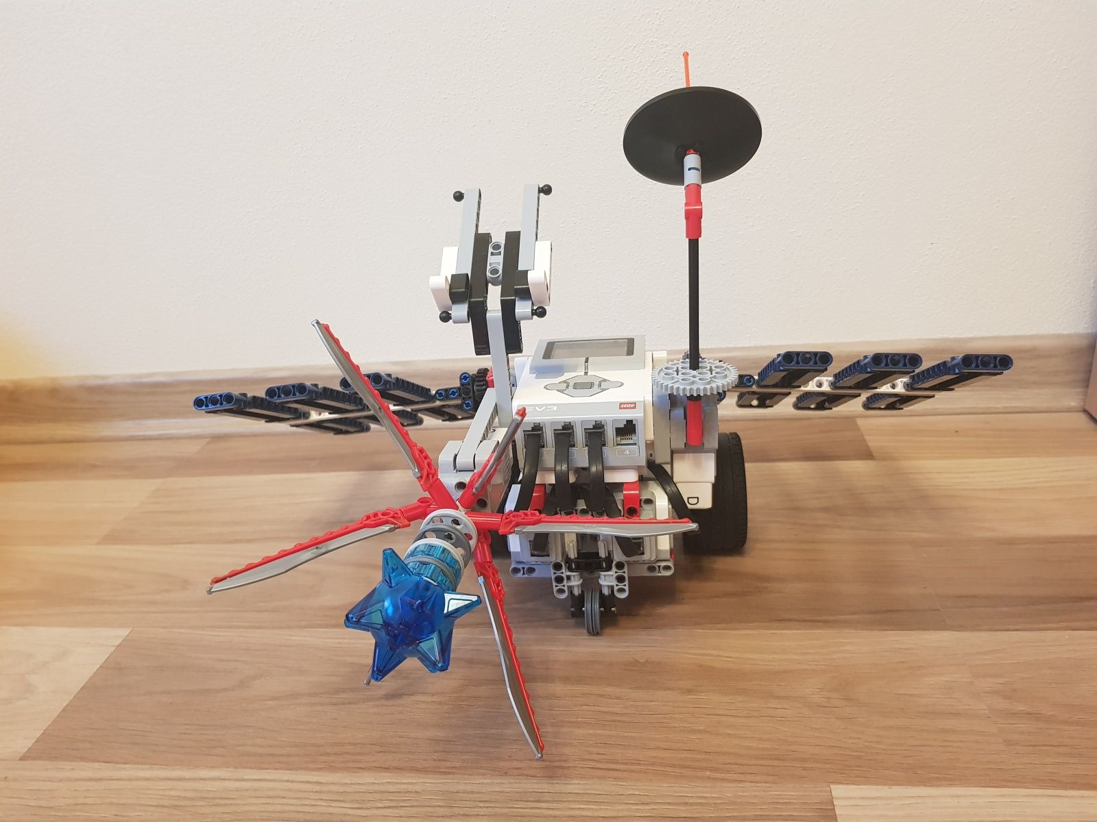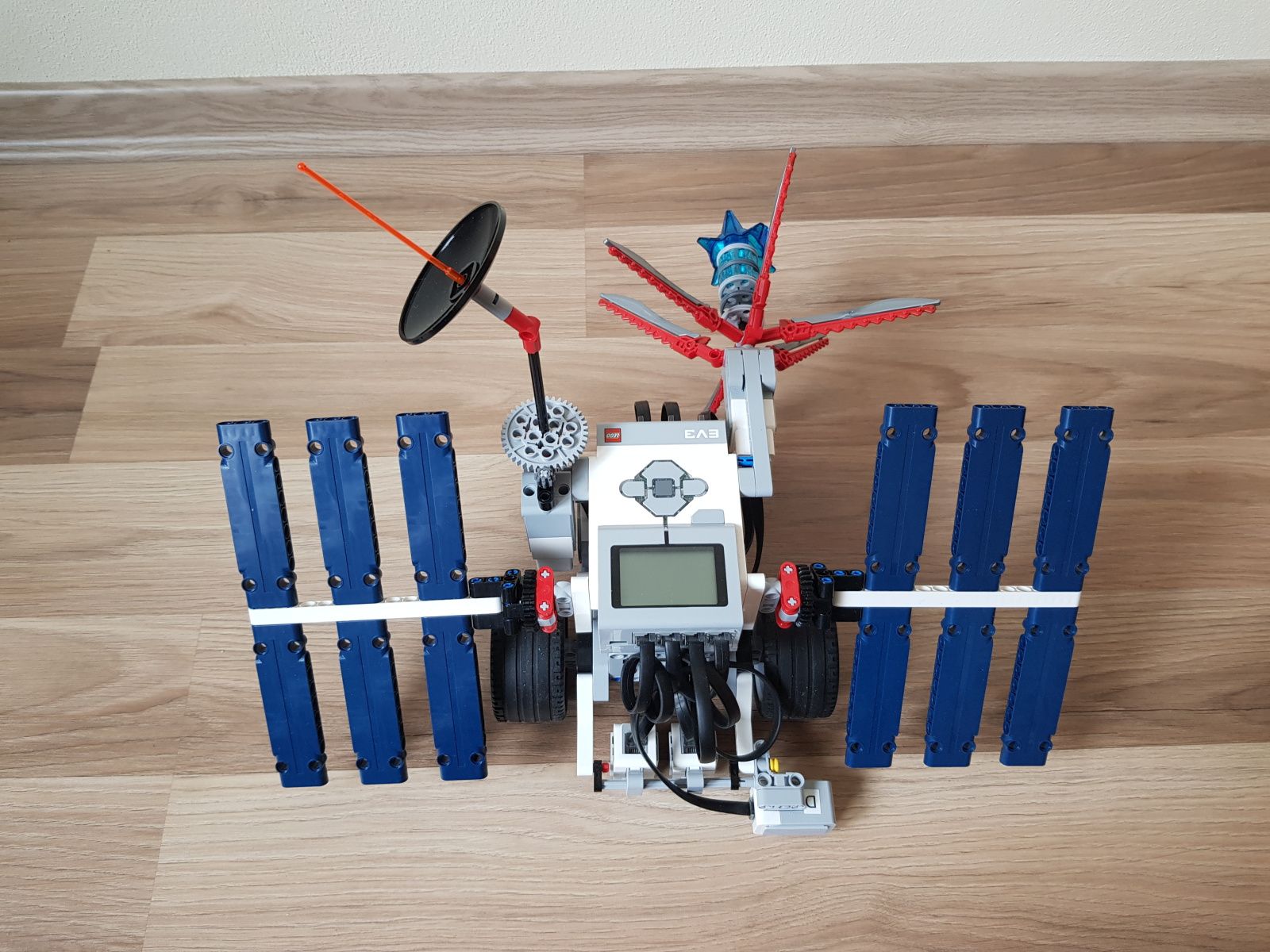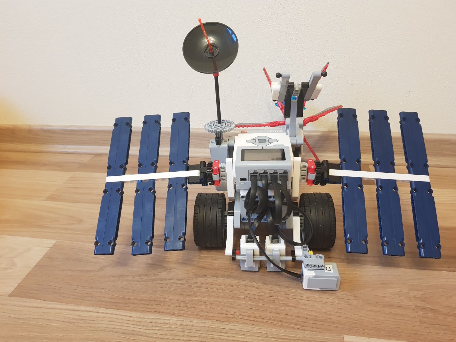 Robot tvorí jedna riadiaca jednotka EV3, dva veľké motory EV3 pre pohyb, dva optické senzory pre sledovanie odrazeného svetla od čiary a jeden optický senzor pre sledovanie rozptýleného svetla vychádzajúceho zo stredu kruhu. Aby robot vyzeral ako sonda, tak sme pridali solárne panely a ďalšie dva stredné motory EV3 pre pohyb satelitnej antény a pohonu.