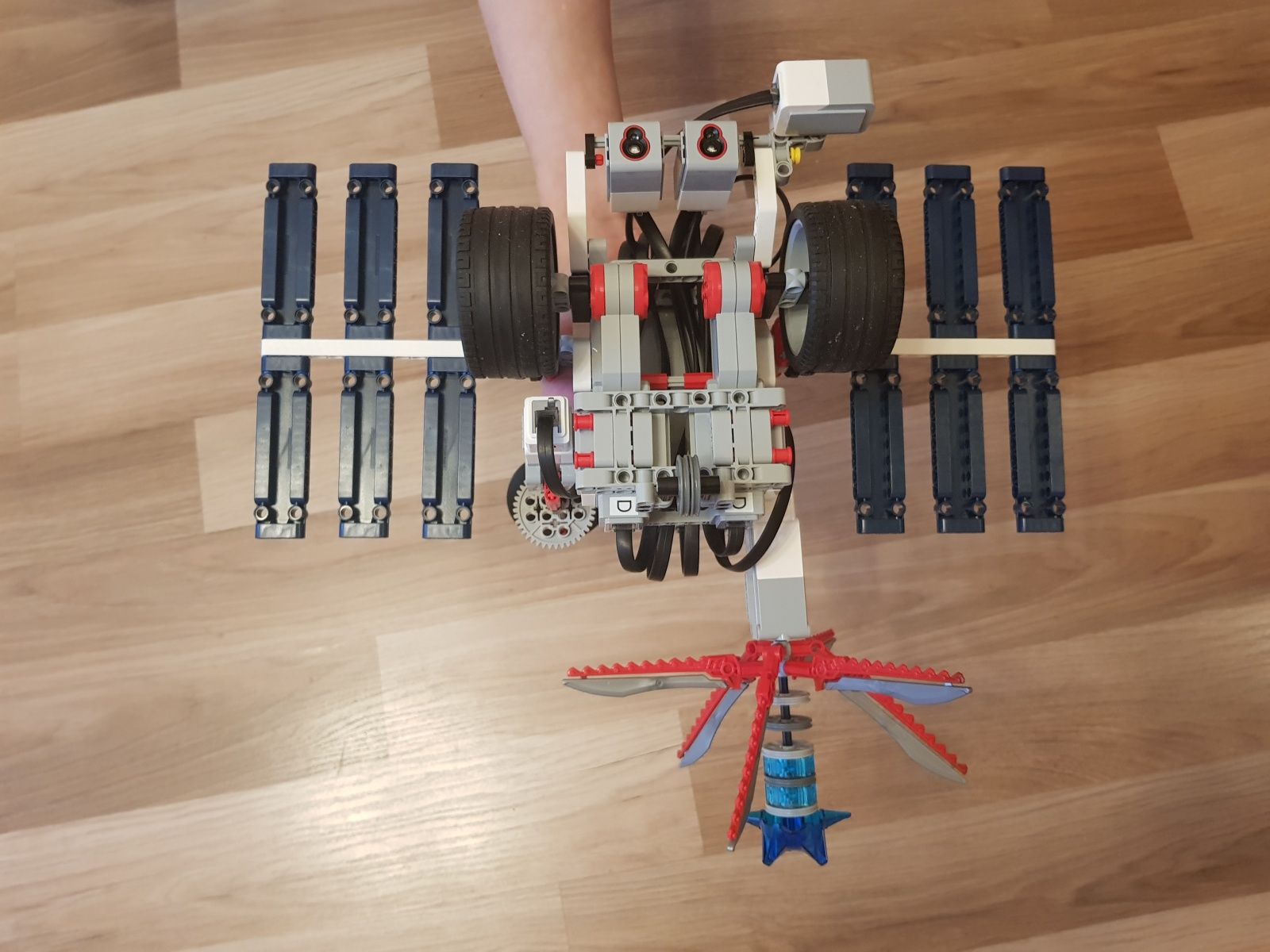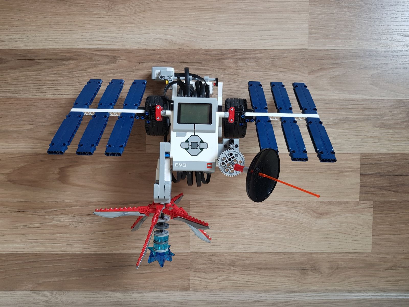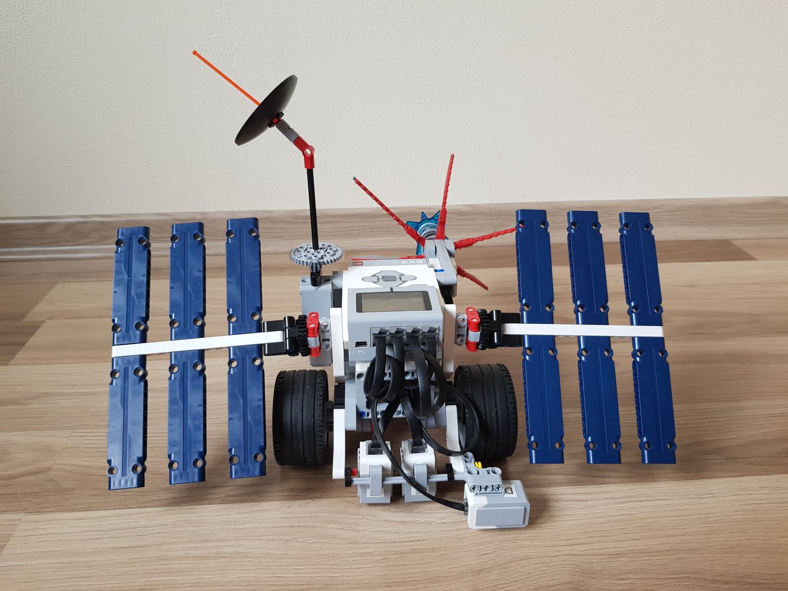 Robot tvorí jedna riadiaca jednotka EV3, dva veľké motory EV3 pre pohyb, dva optické senzory pre sledovanie odrazeného svetla od čiary a jeden optický senzor pre sledovanie rozptýleného svetla vychádzajúceho zo stredu kruhu. Aby robot vyzeral ako sonda, tak sme pridali solárne panely a ďalšie dva stredné motory EV3 pre pohyb satelitnej antény a pohonu.