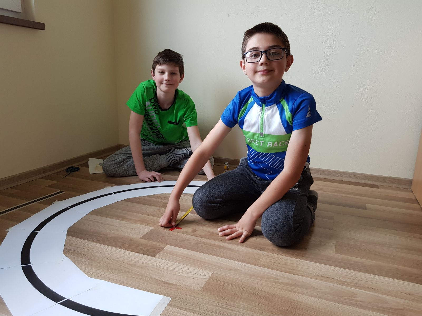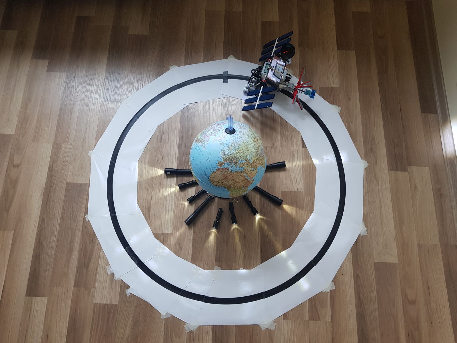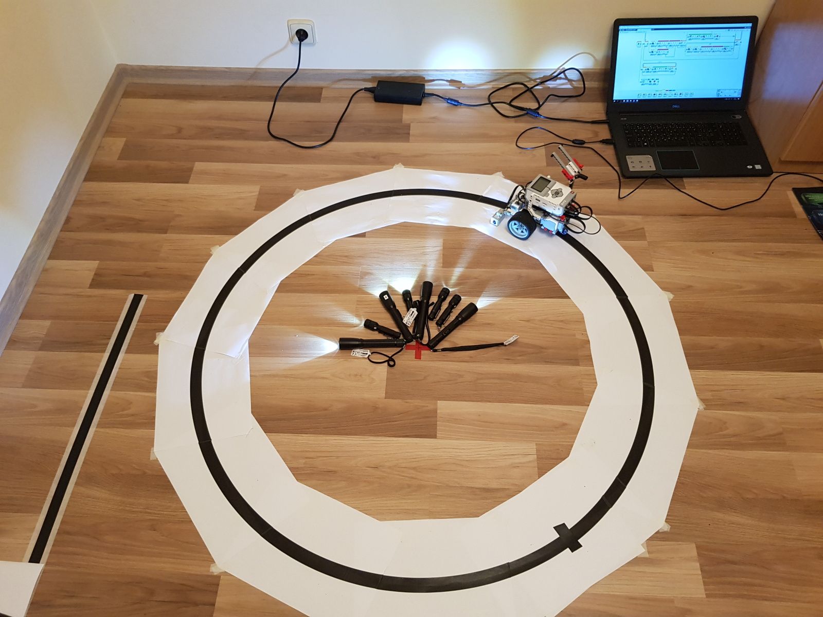 Na podlahu sme vyznačili kružnicu s priemerom 105 cm, ktorá znázorňuje obežnú dráhu. Do stredu kružnice sme umiestnili niekoľko LED bateriek s rôznym nastavením výkonu a šírky lúča. Robot pri pohybe sleduje dvomi svetelnými senzormi čiernu čiaru a pomocou jedného svetelného senzora v režime rozptýleného svetla meria množstvo svetla prichádzajúceho zo stredu kružnice. Rýchlosť pohybu po kružnici sme nastavili tak, aby jeden obeh trval jednu minútu. Namerané údaje sa ukladajú do súboru, zobrazujú na displeji a tiež sa podľa nich reguluje tón zvuku, ktorým je signalizované množstvo dopadajúceho svetla.