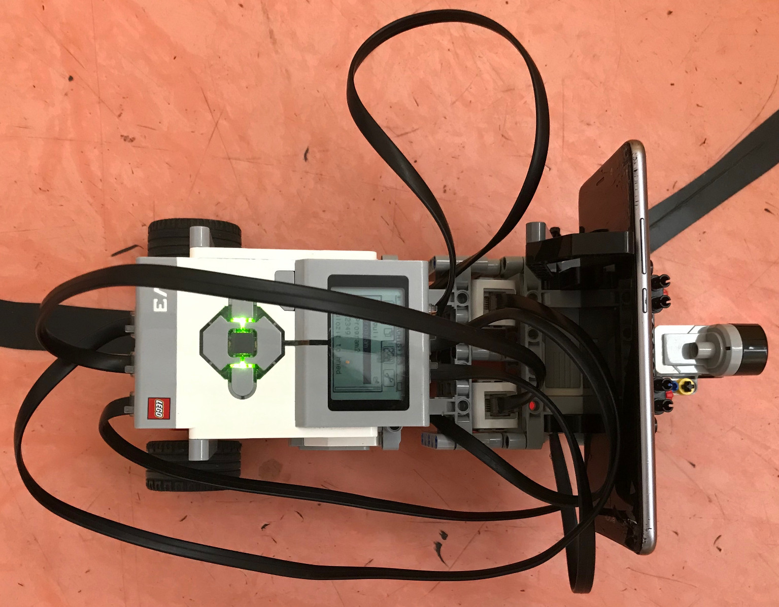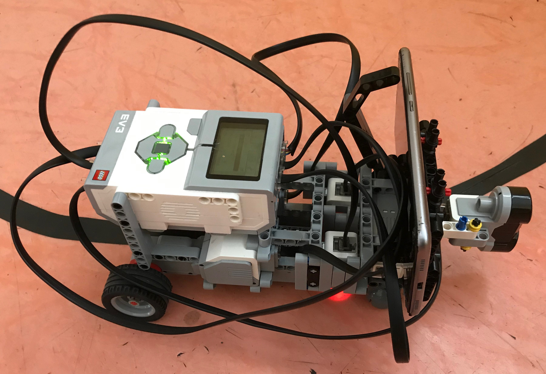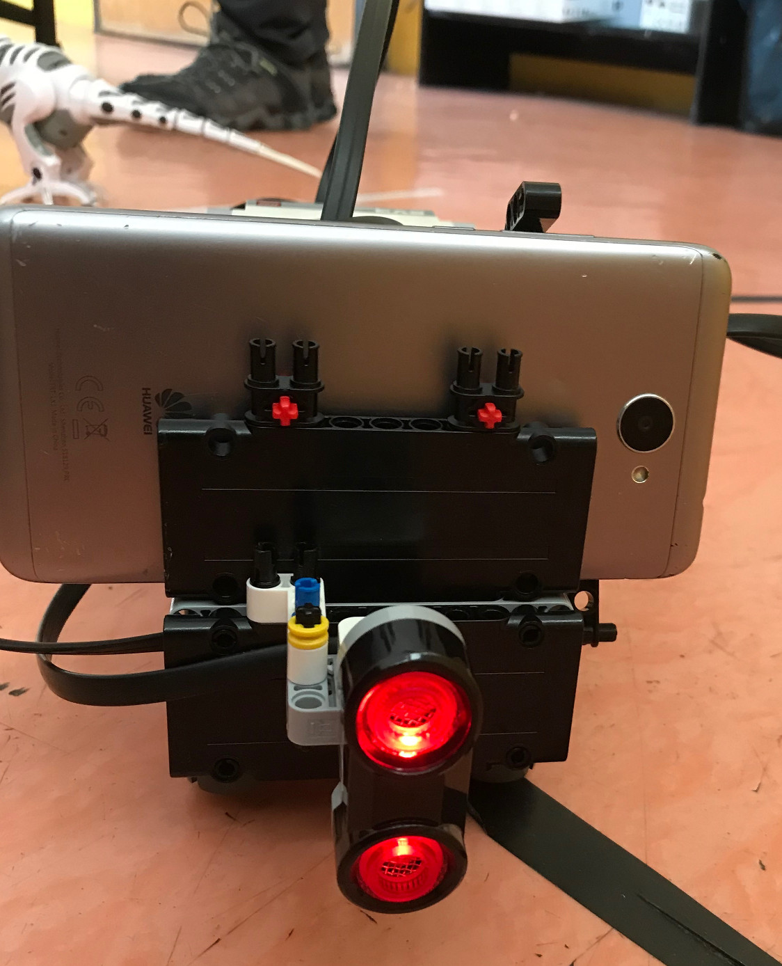 Robot jazdí po čiare a vždy keď zbadá prekážku zastane a spraví fotku.