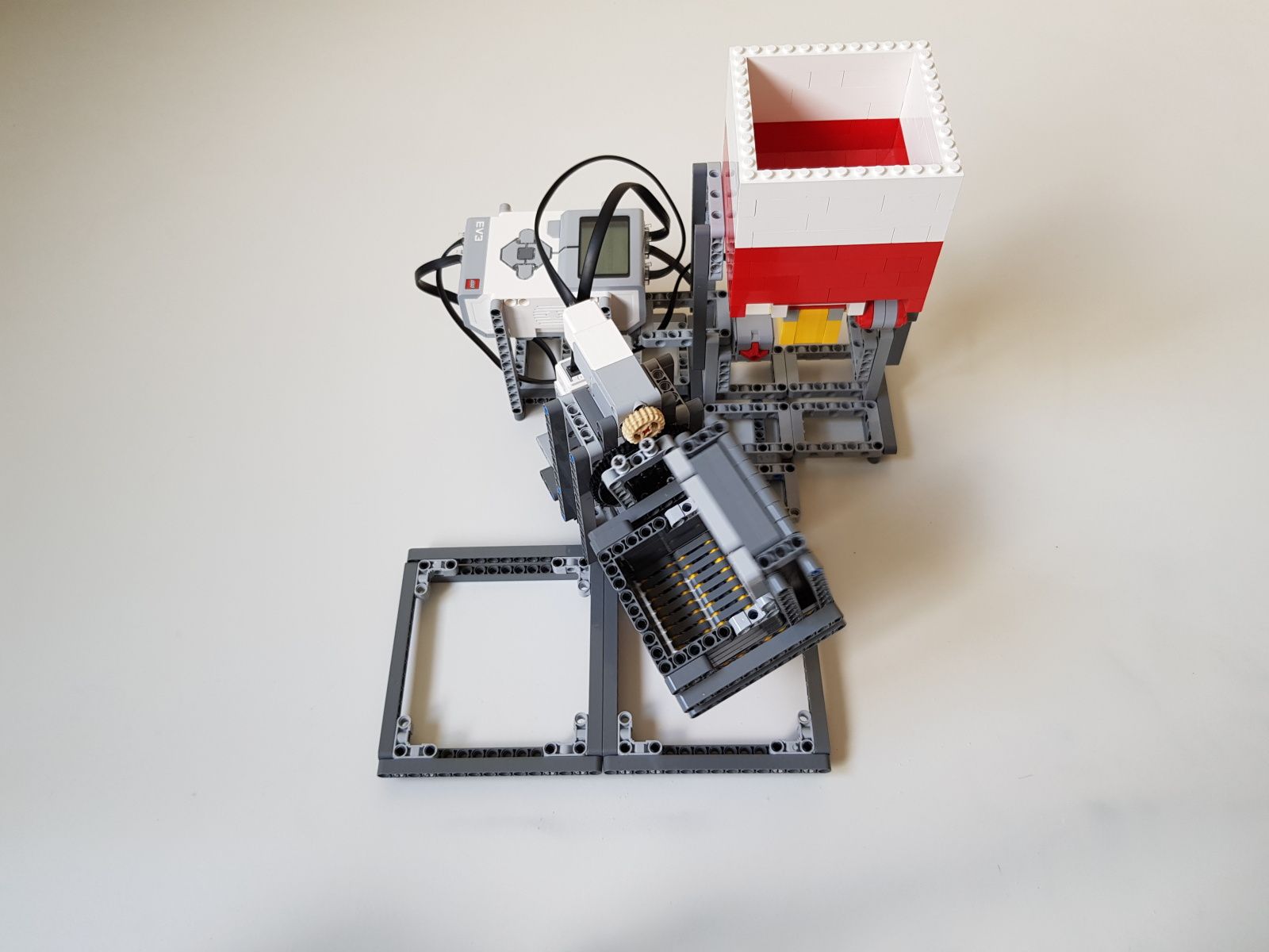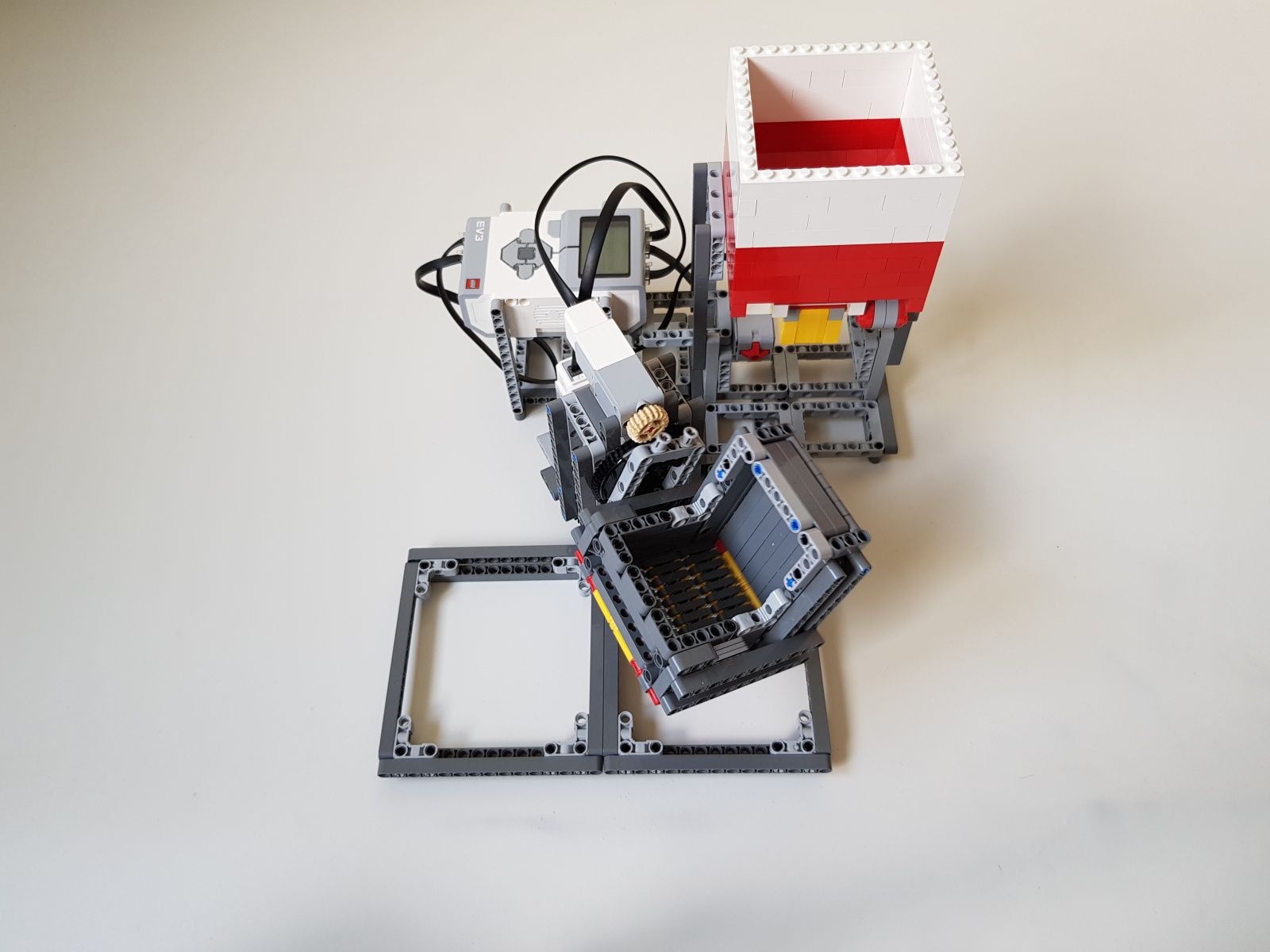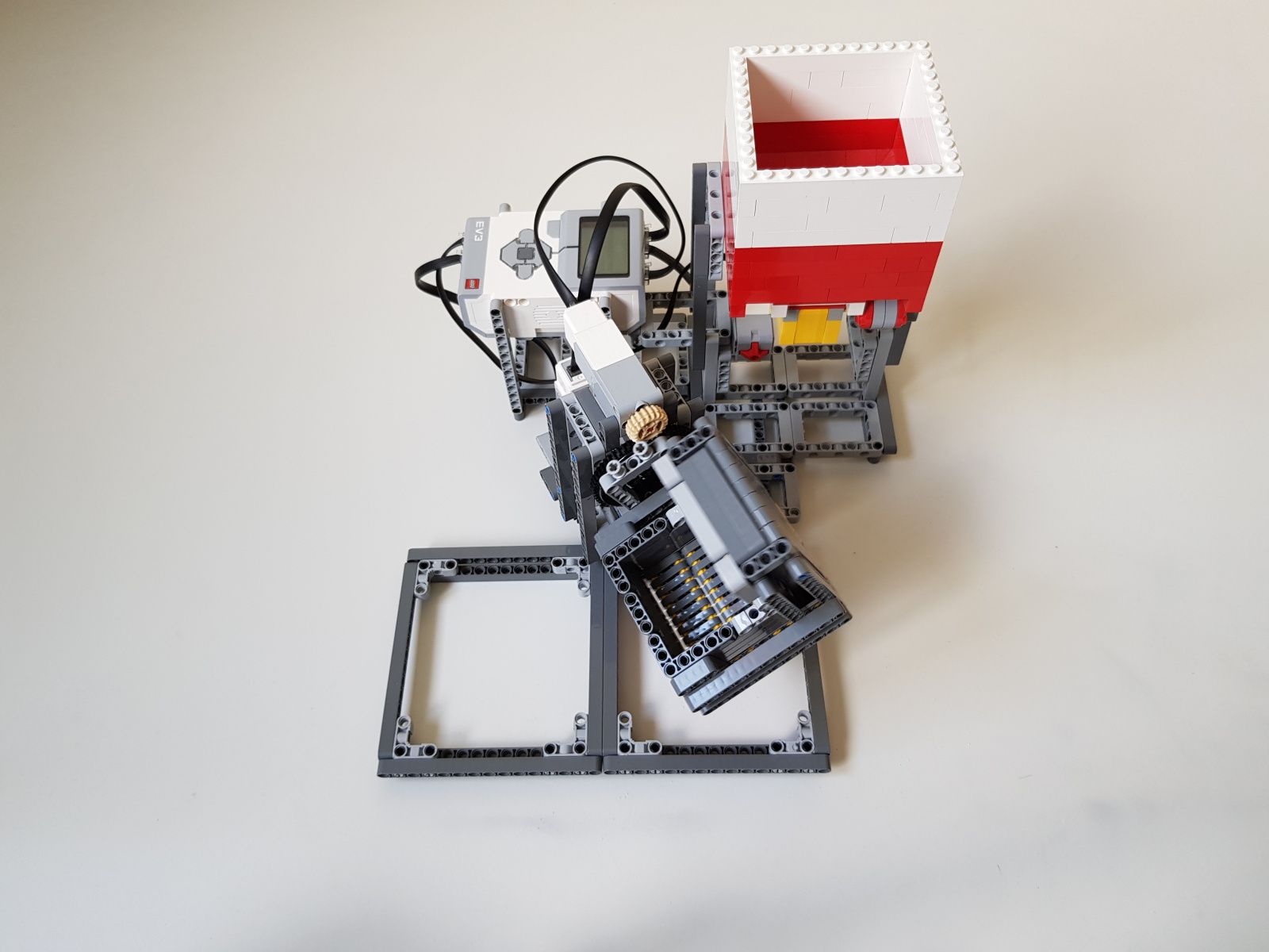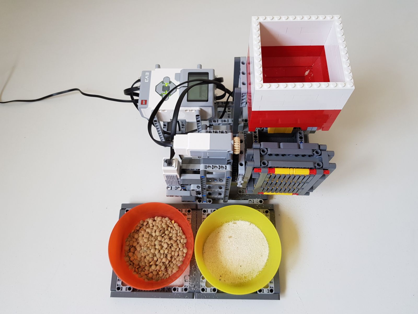 Robot tvorí jedna riadiaca jednotka EV3, násypka zostavená zo súčiastok lego creator, dva stredné motory EV3 pre pohyb triediacej lyžice, jeden veľký motor EV3 pre ovládanie klapky na spodku násypky, jeden optický senzor v režime merania odrazeného svetla pre sledovanie prítomnosti misiek na vytriedenú šošovicu a krupicu a jeden snímač dotyku pre zisťovanie prítomnosti triediacej lyžice pod násypkou.