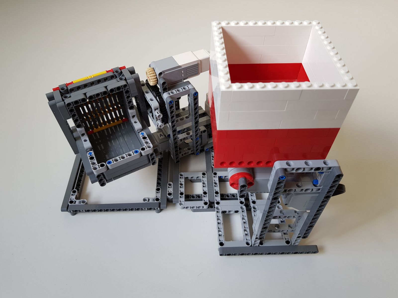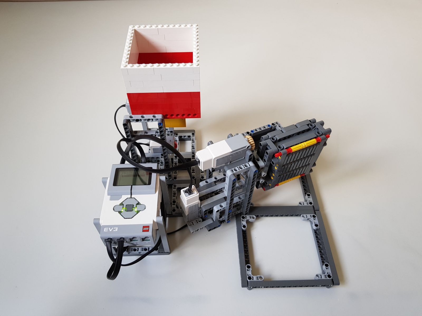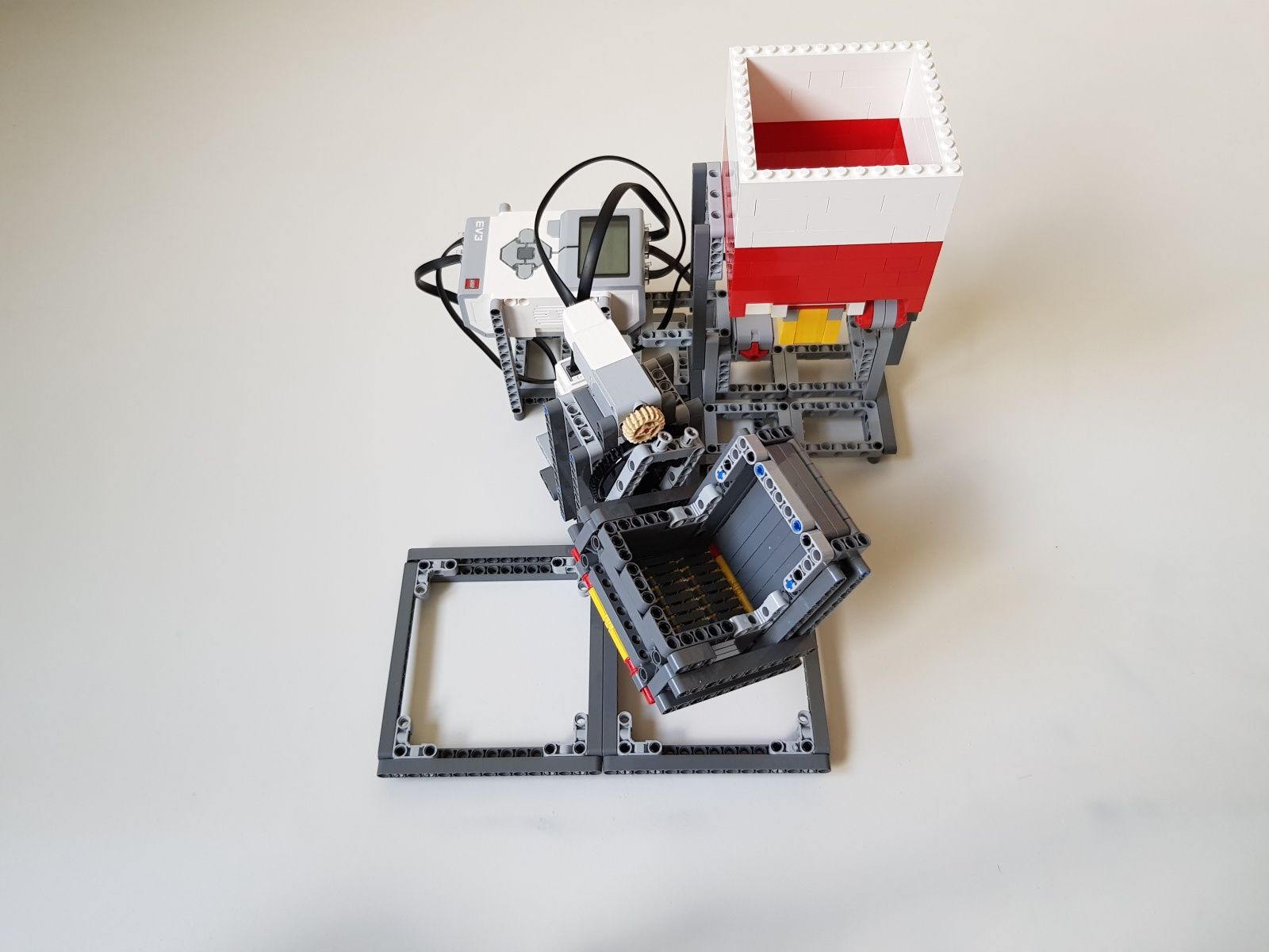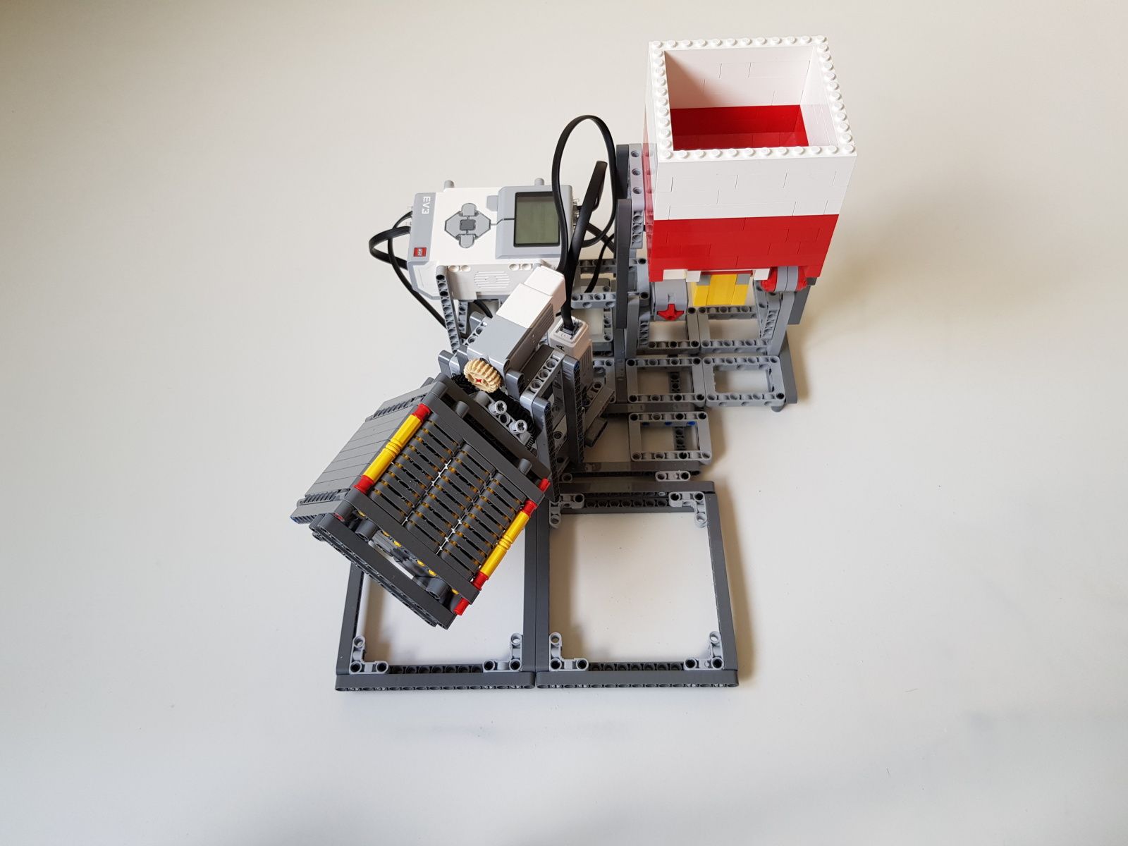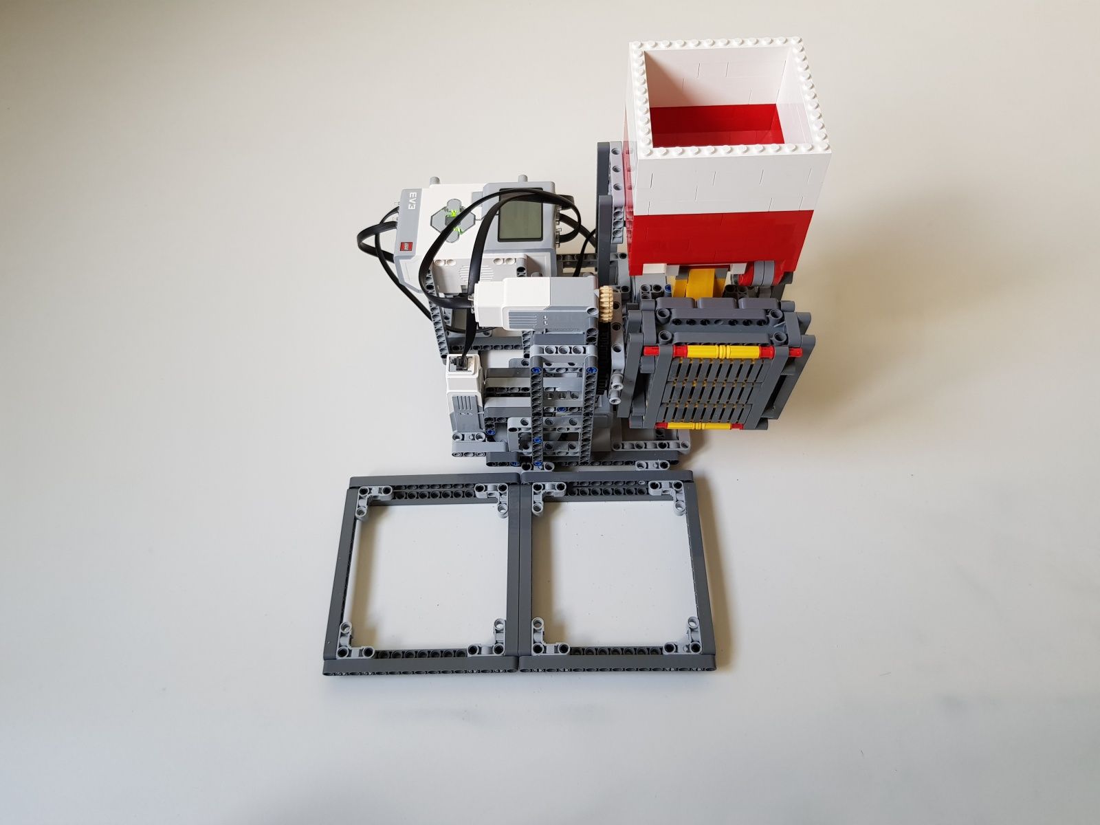 Robot tvorí jedna riadiaca jednotka EV3, násypka zostavená zo súčiastok lego creator, dva stredné motory EV3 pre pohyb triediacej lyžice, jeden veľký motor EV3 pre ovládanie klapky na spodku násypky, jeden optický senzor v režime merania odrazeného svetla pre sledovanie prítomnosti misiek na vytriedenú šošovicu a krupicu a jeden snímač dotyku pre zisťovanie prítomnosti triediacej lyžice pod násypkou.