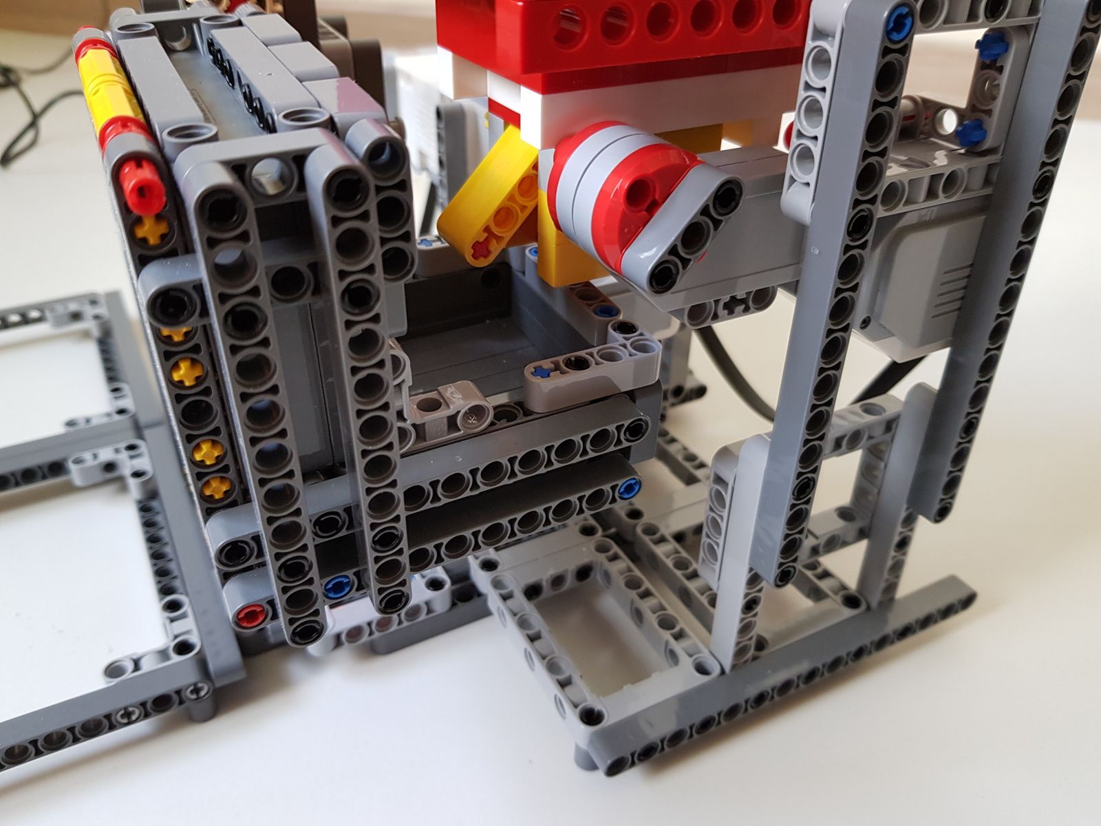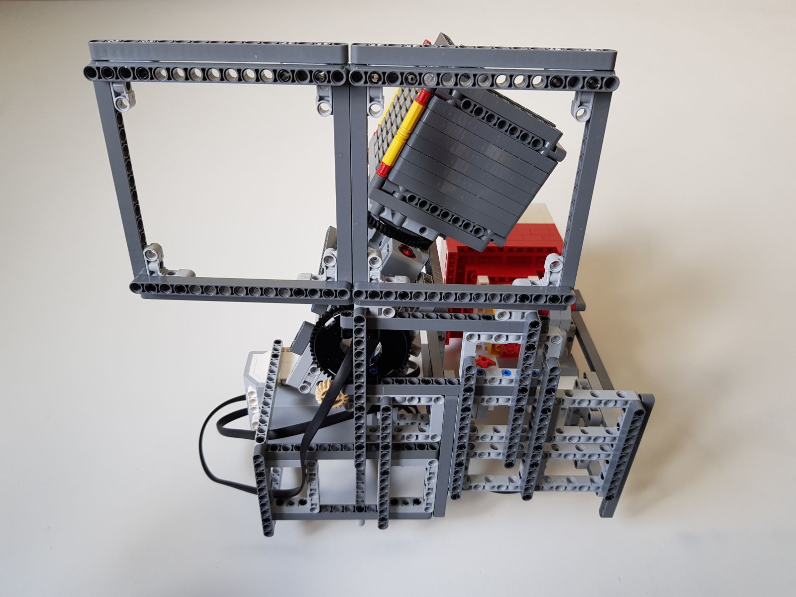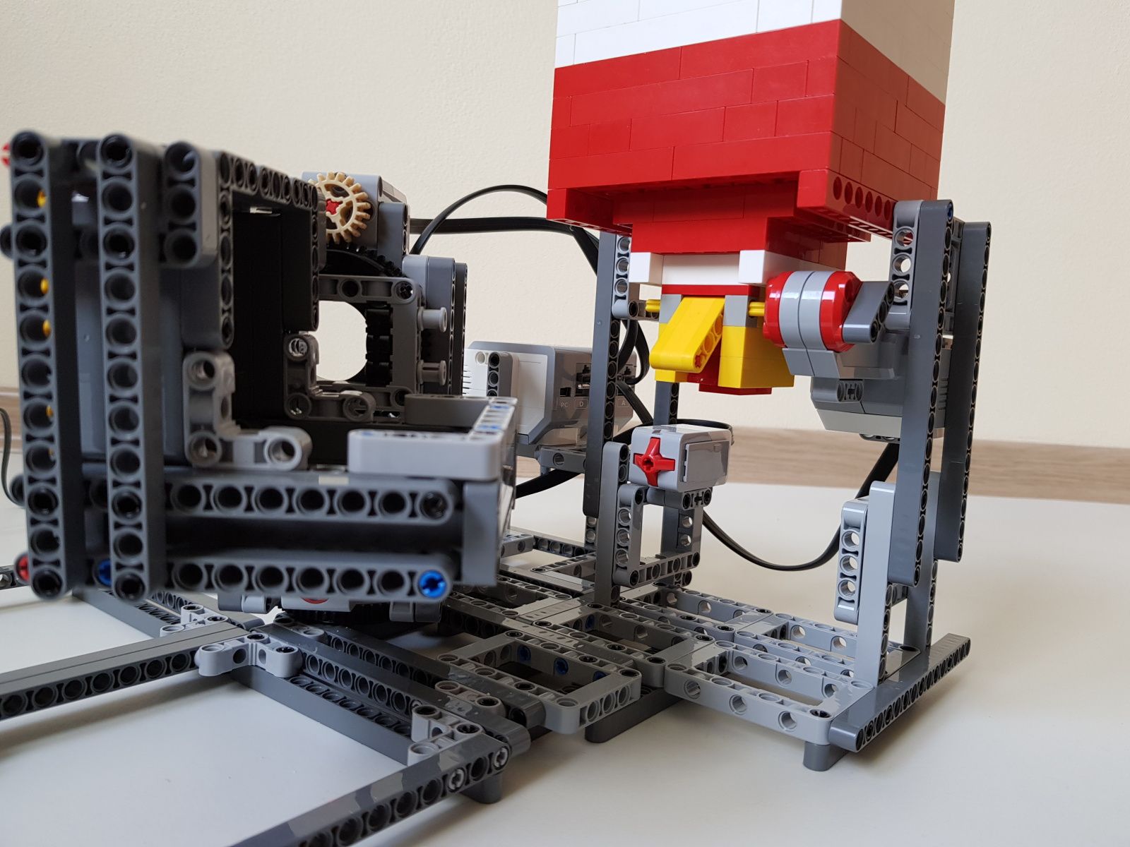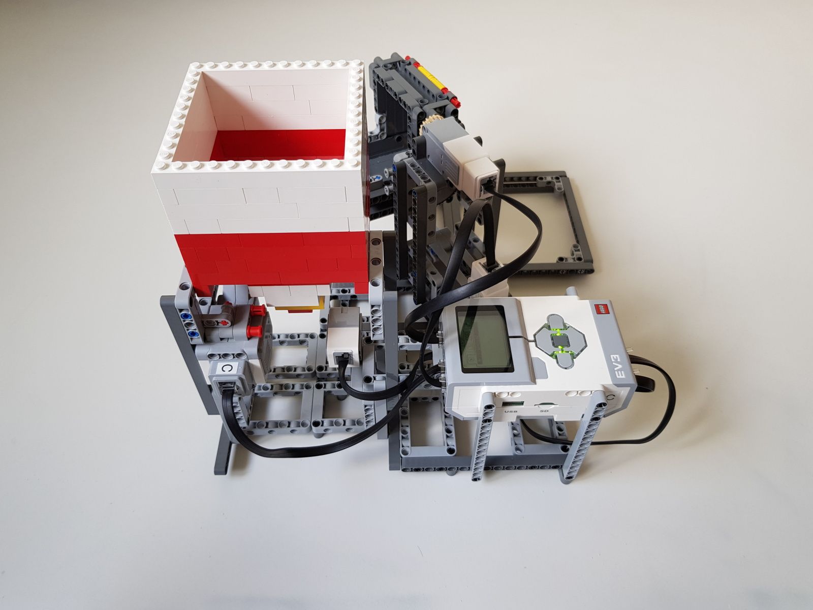 Robot tvorí jedna riadiaca jednotka EV3, násypka zostavená zo súčiastok lego creator, dva stredné motory EV3 pre pohyb triediacej lyžice, jeden veľký motor EV3 pre ovládanie klapky na spodku násypky, jeden optický senzor v režime merania odrazeného svetla pre sledovanie prítomnosti misiek na vytriedenú šošovicu a krupicu a jeden snímač dotyku pre zisťovanie prítomnosti triediacej lyžice pod násypkou.
