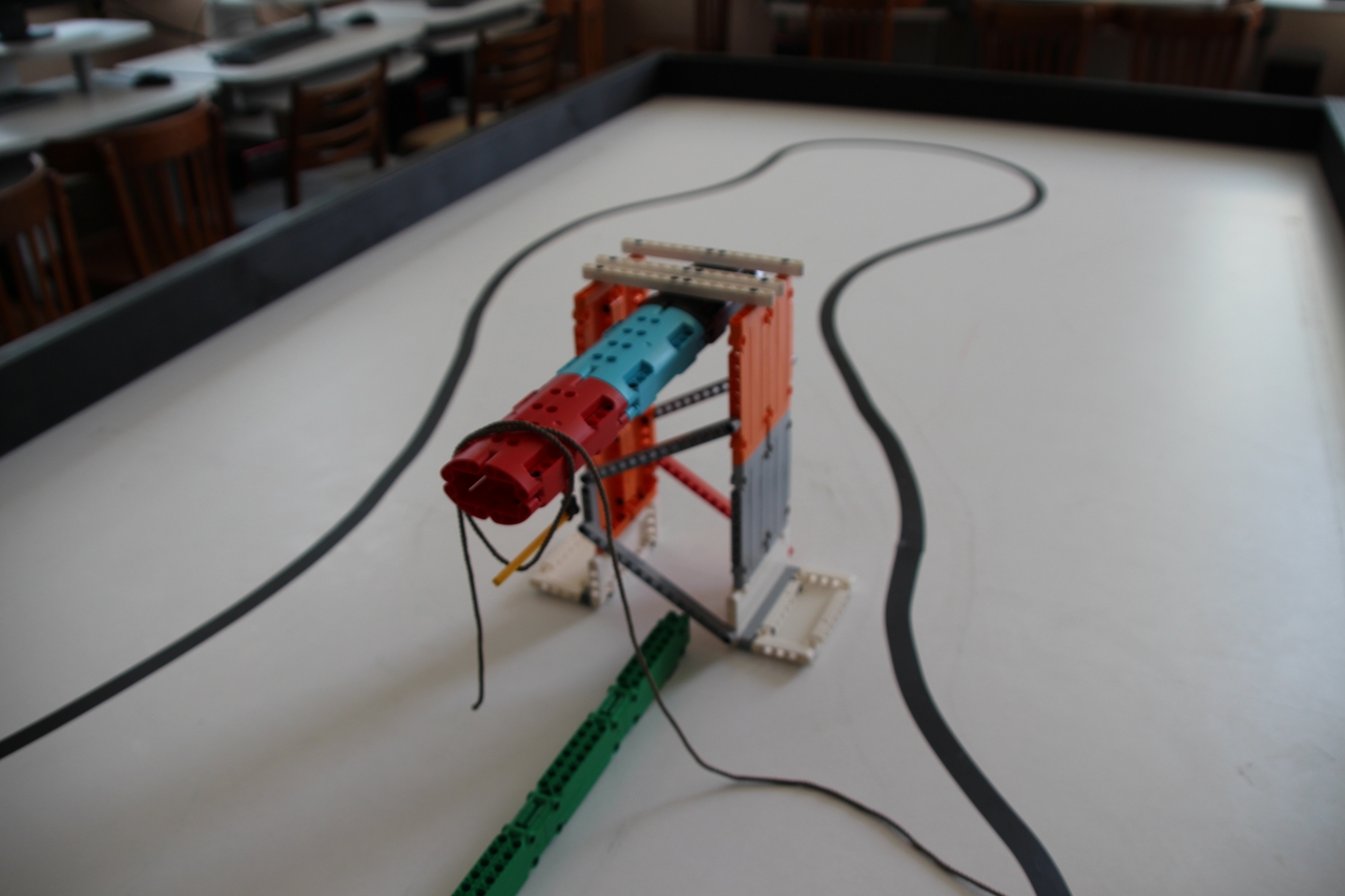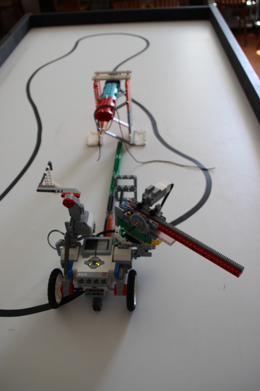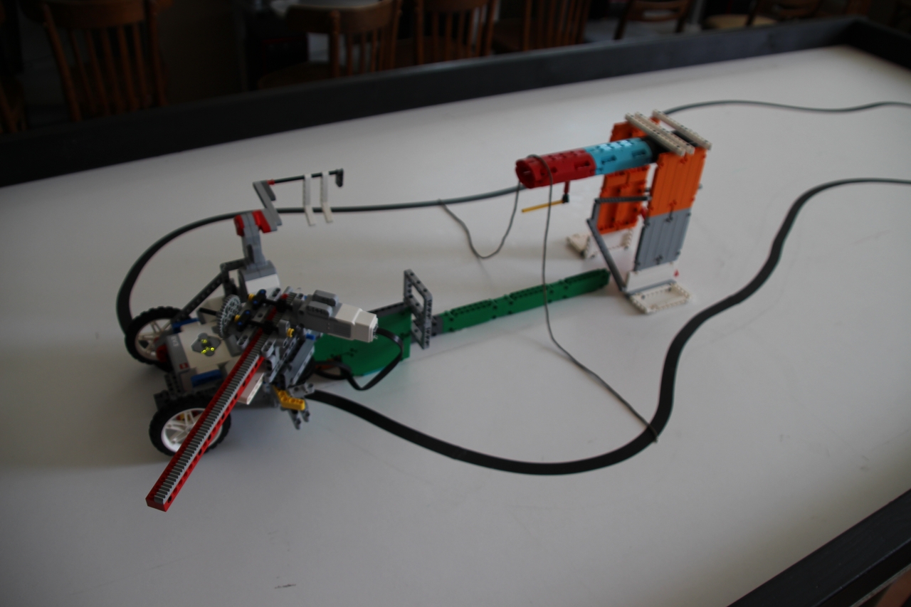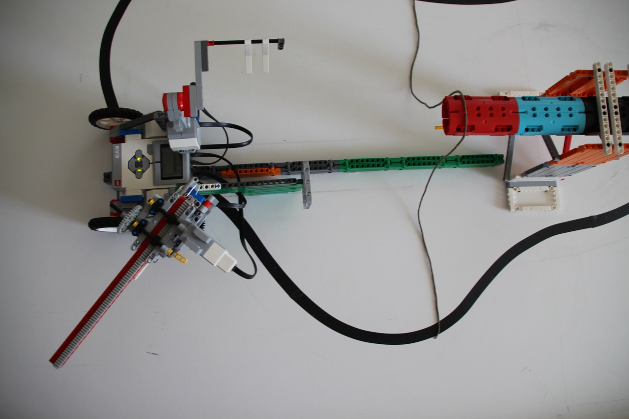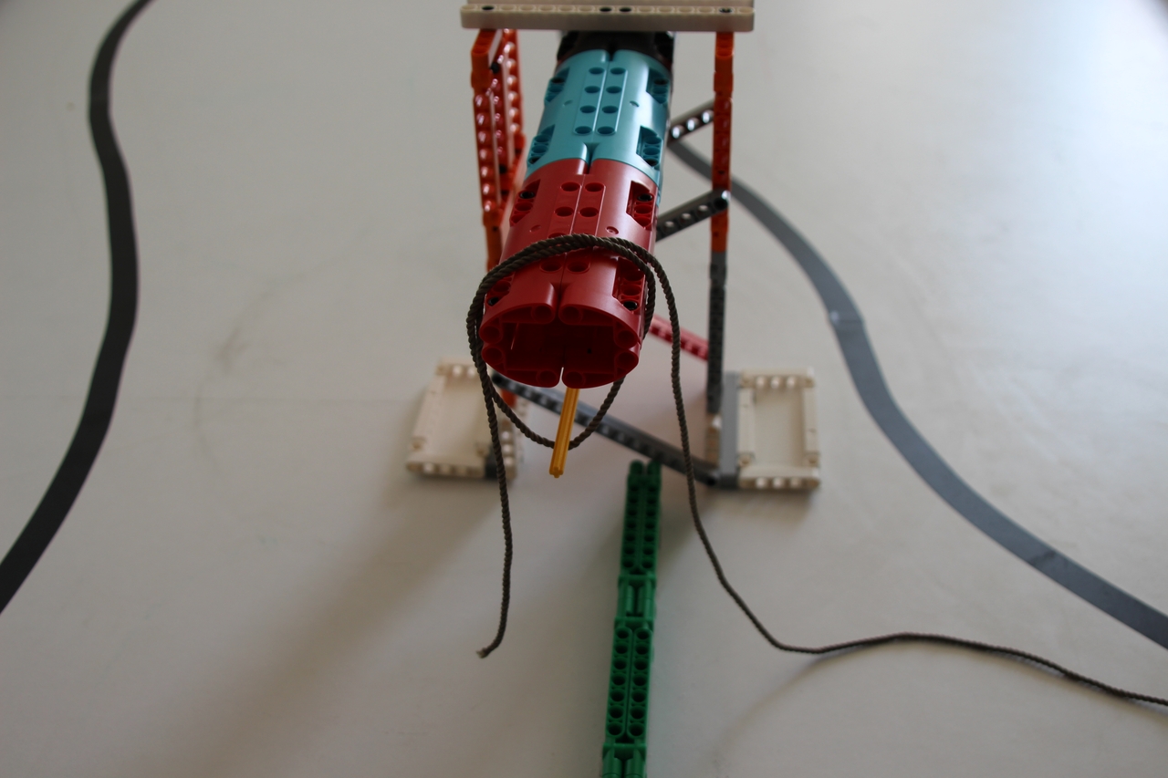 1. Na držiaku je prevesená šnúrka. Robot vyštartuje, svojou pravou stranou mierne odtlačí pravú polovicu šnúrky.