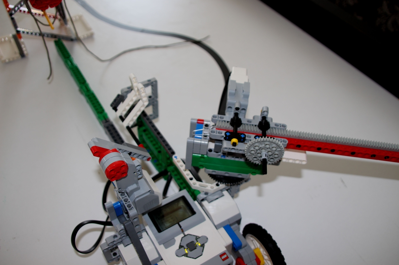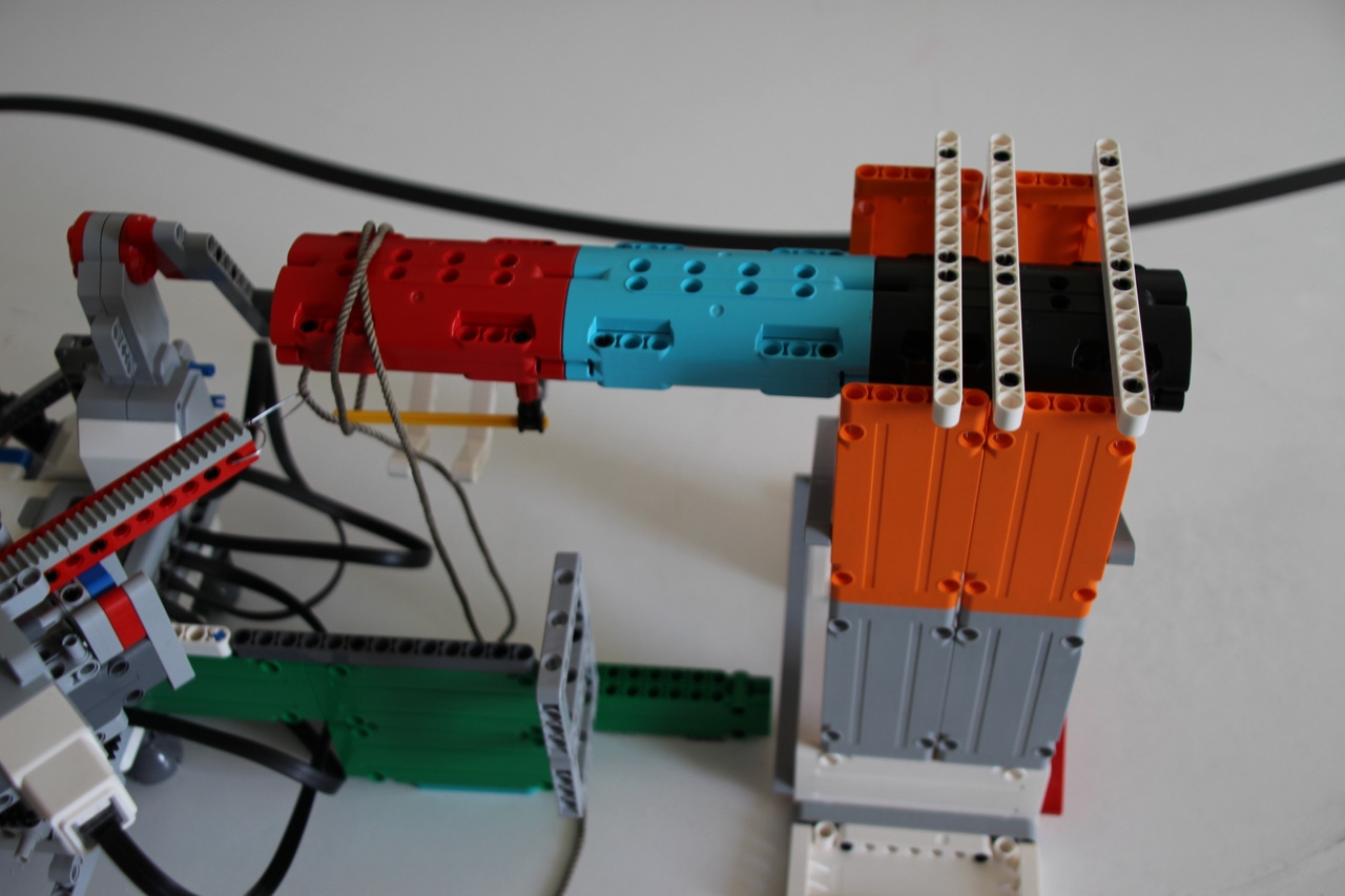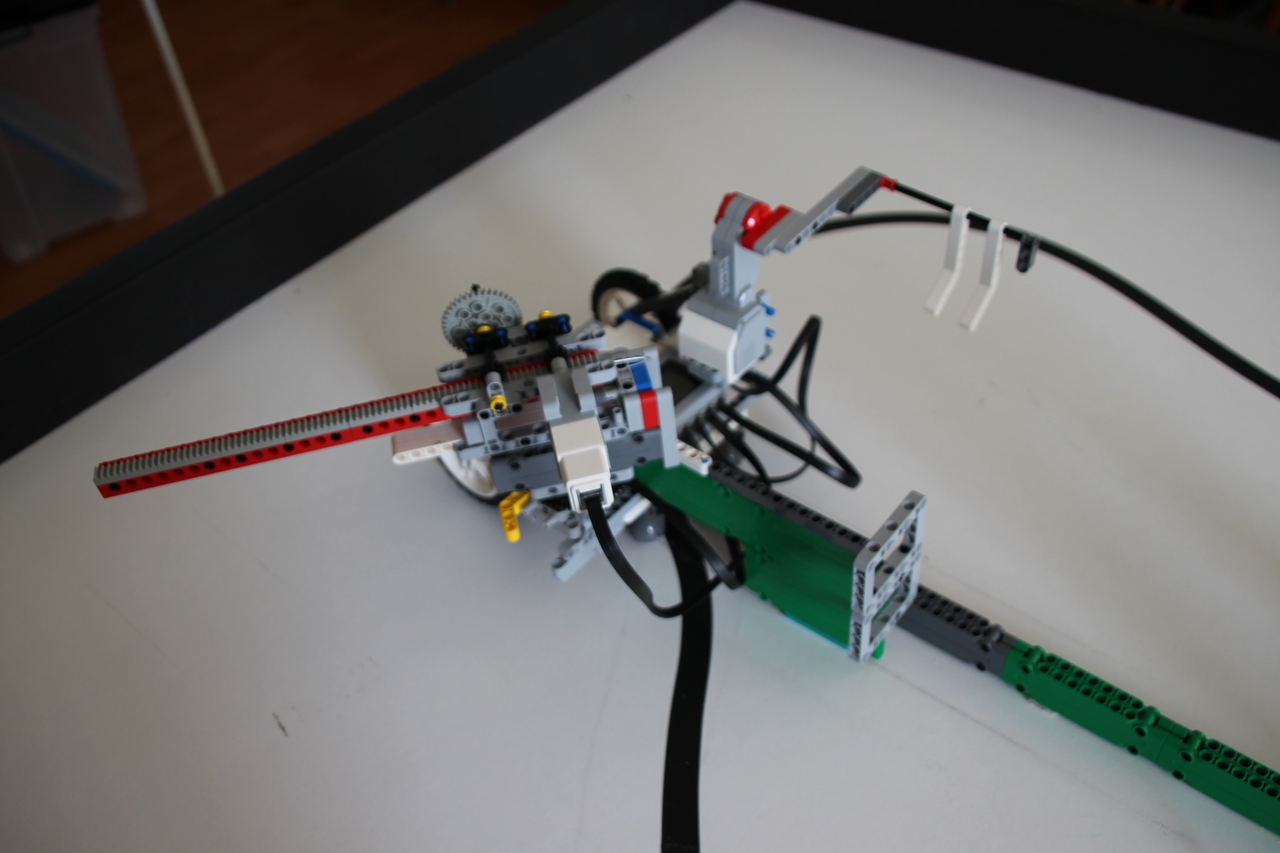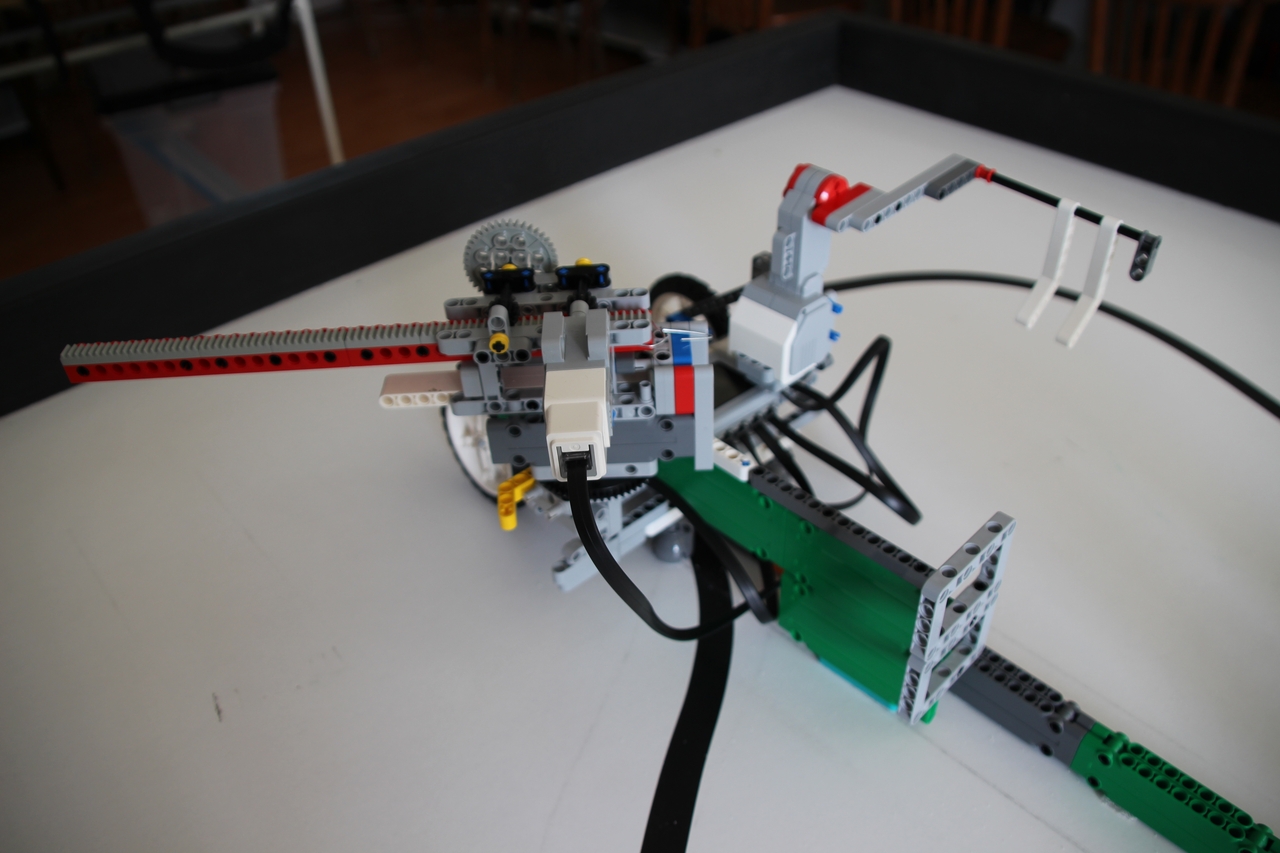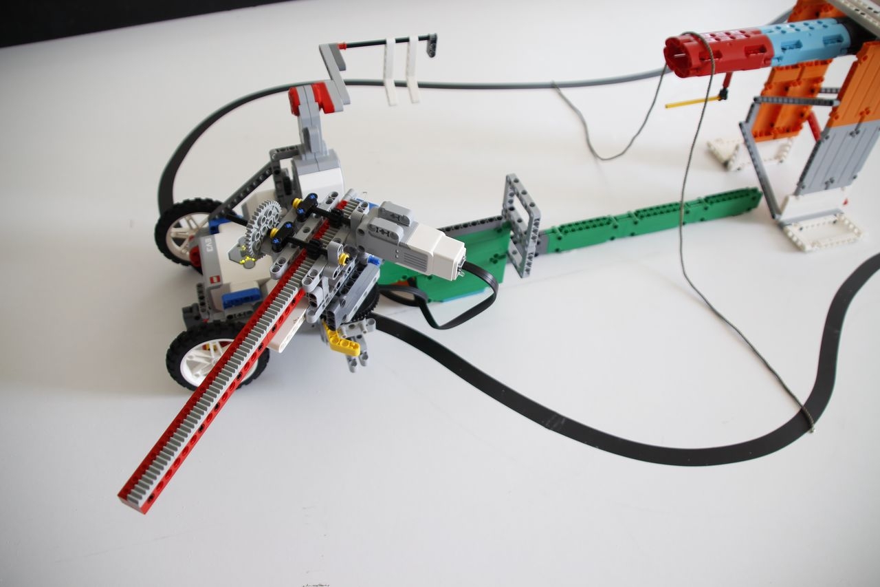 Náš robot na vytvorenie uzla obsahuje 3 veľké motory a jeden stredný motor. 2 veľké motory slúžia na pohyb - robot sa pomocou veľkých kolies pohybuje po koľajnici.