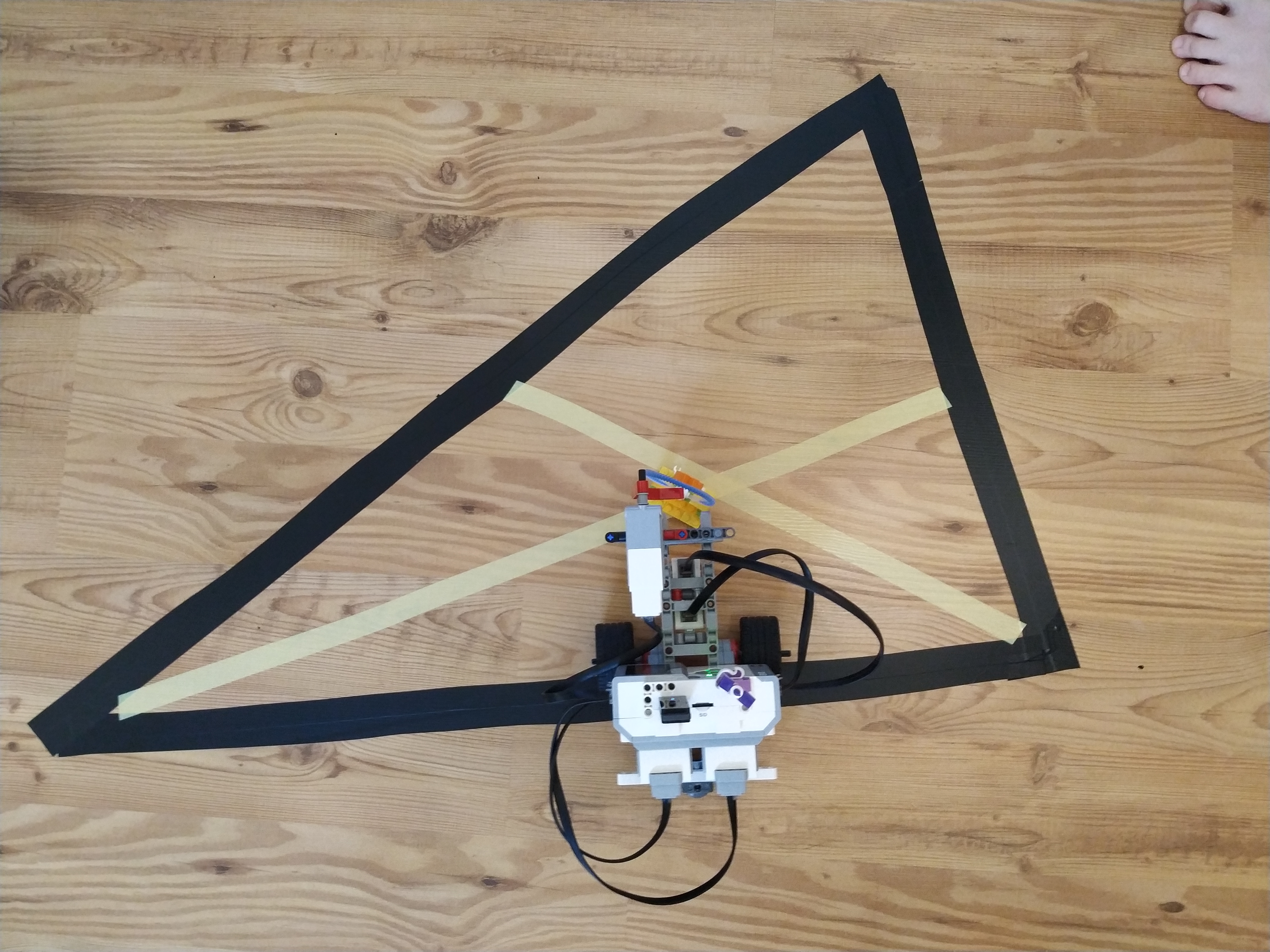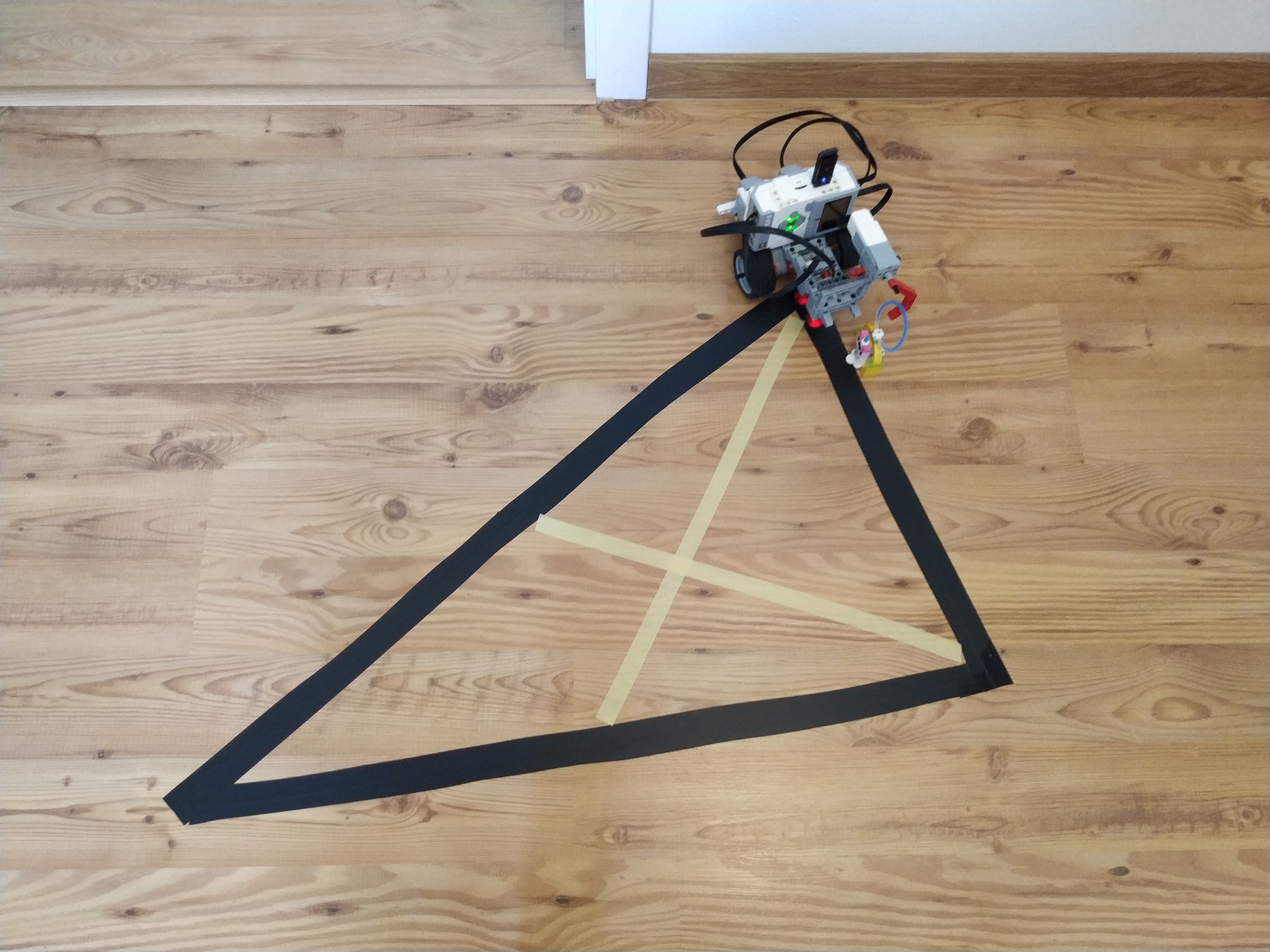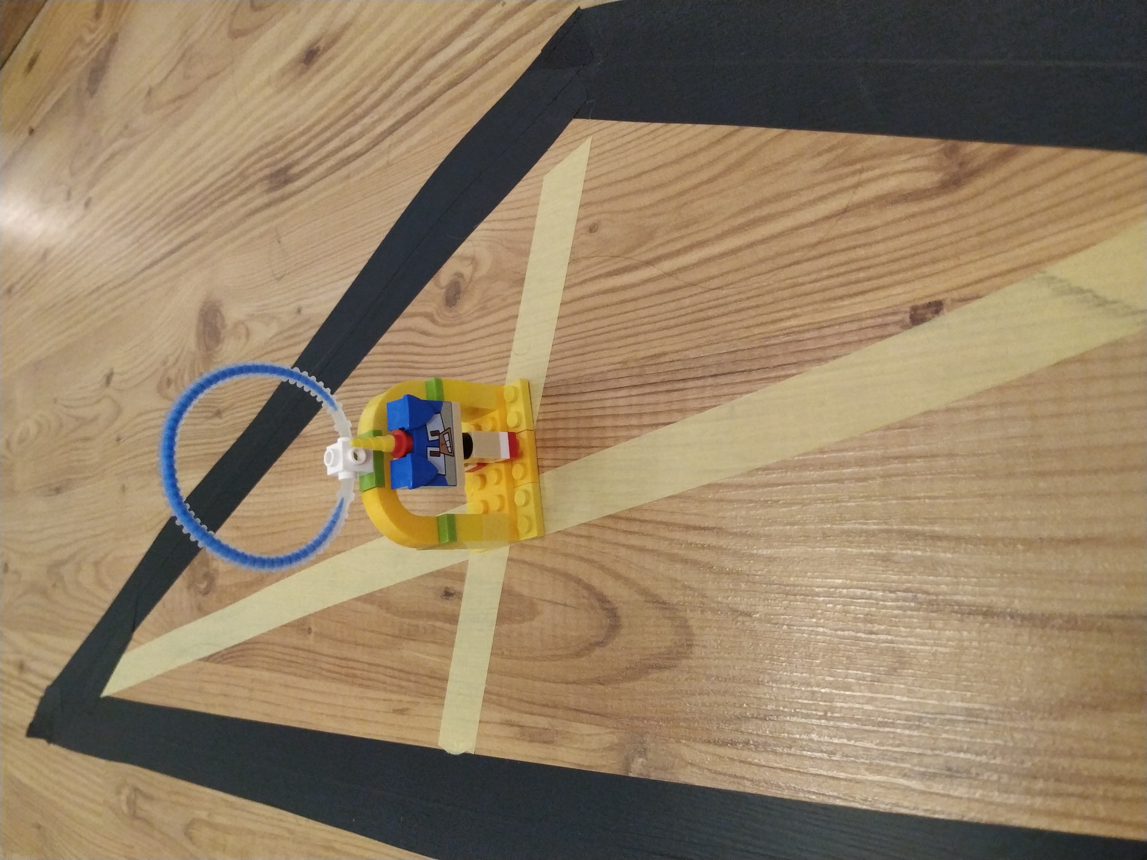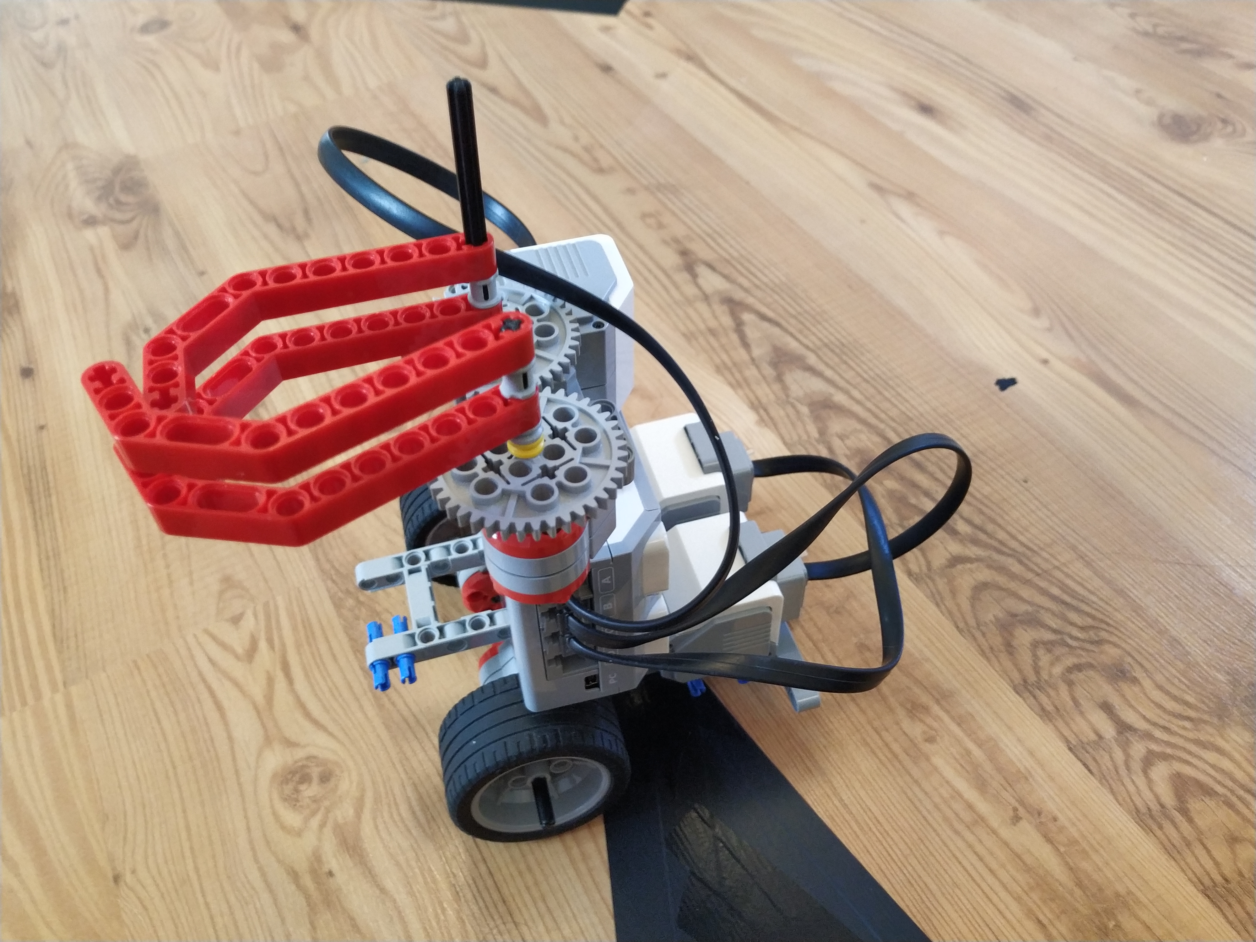 Robot ma 2 large servo motory na pohyb kolies a lego kovovu gulicku ako pomocne koleso. Na podvozku ma lego mindstorms ev3 kocku a roboticku ruku ktora chyta stuzku. Robot ma stuzku zavesene na oske ktora je podopreta dvoma lego stlpami.
