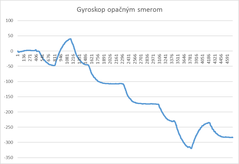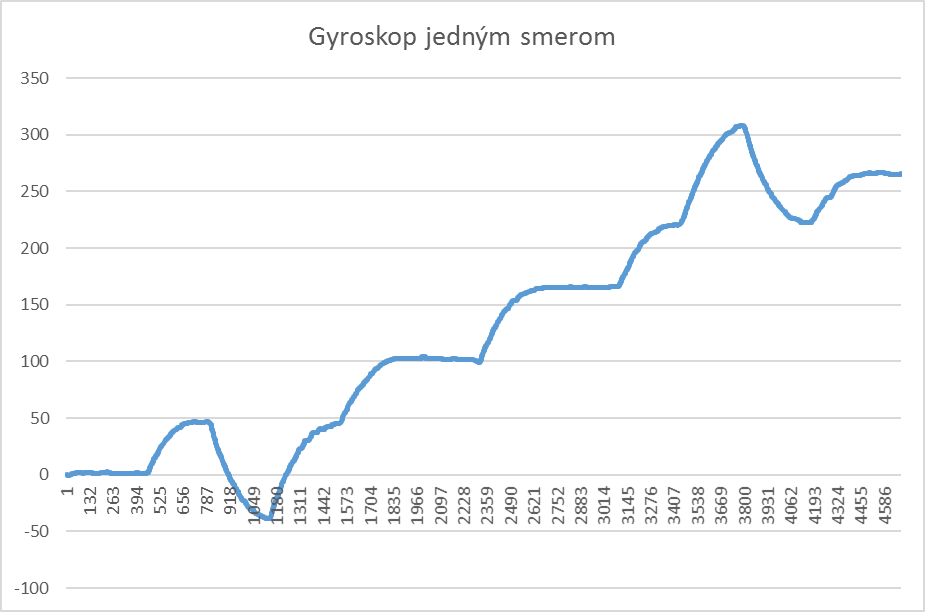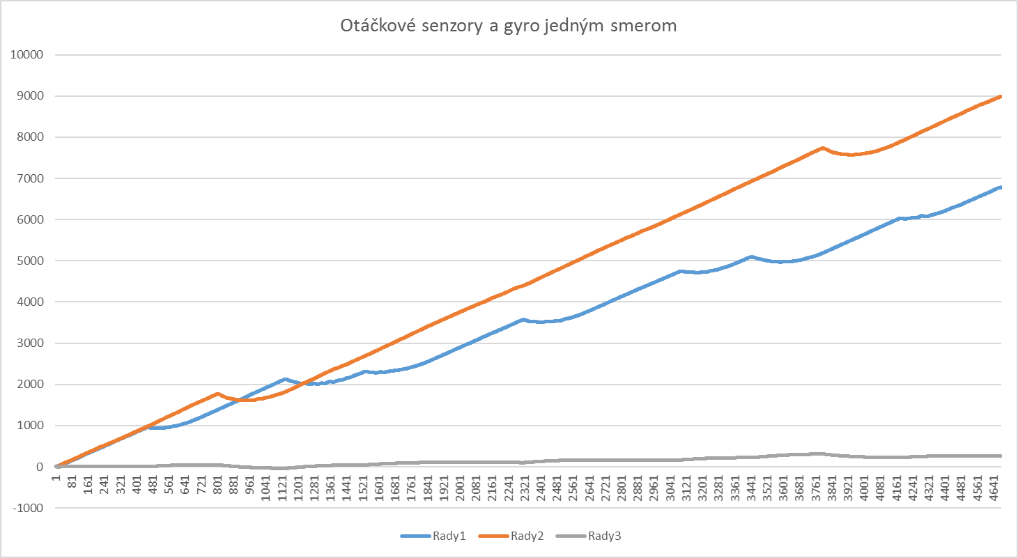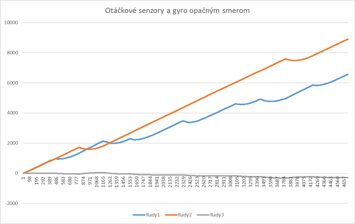 Na začiatku sme vytvorili program, ktorý zaznamenával hodnoty z otáčkových senzorov a z gyroskopu - záznamy sú priložené na grafoch - všetky tri spolu a potom gyroskop zvlášť.