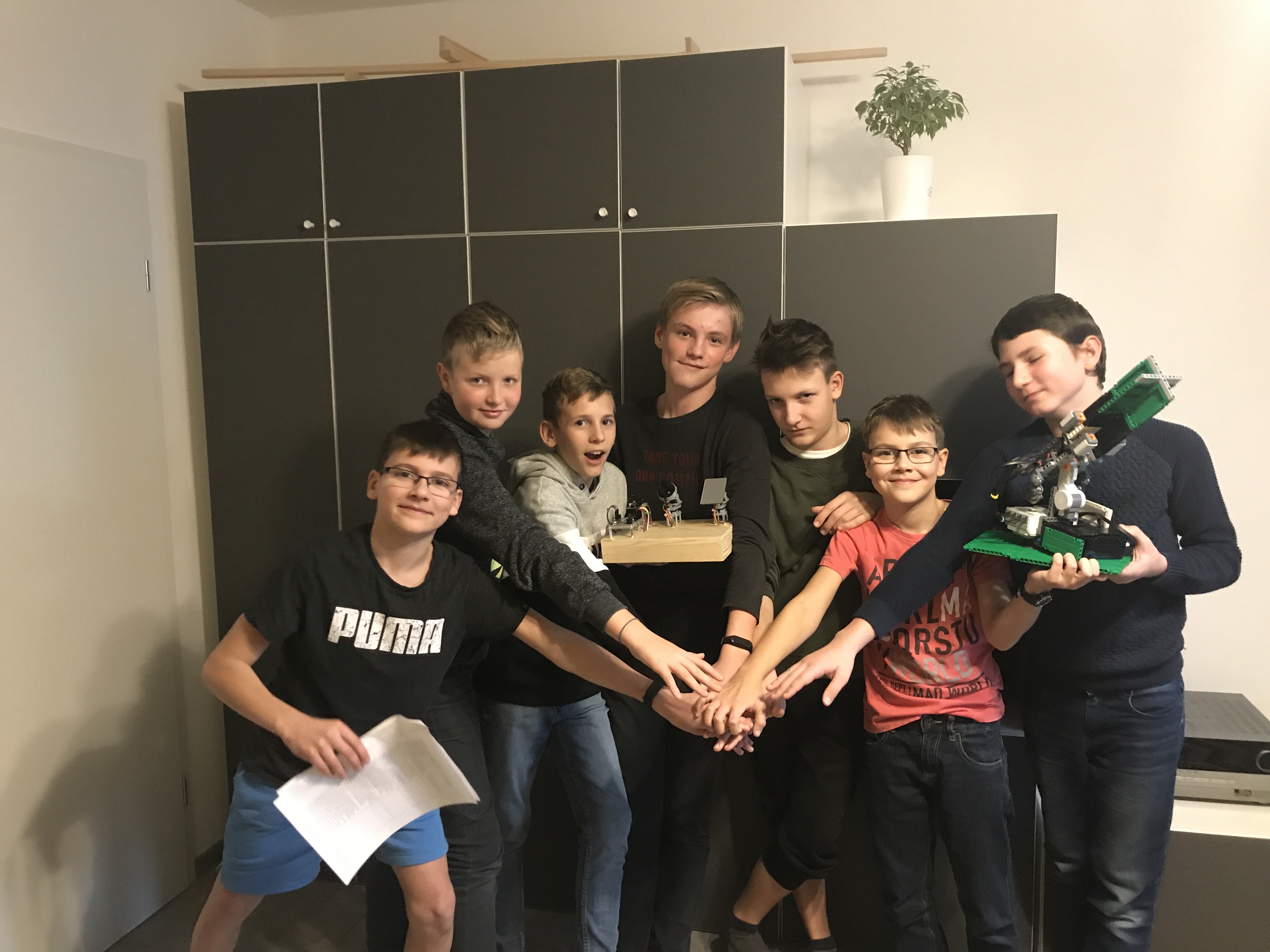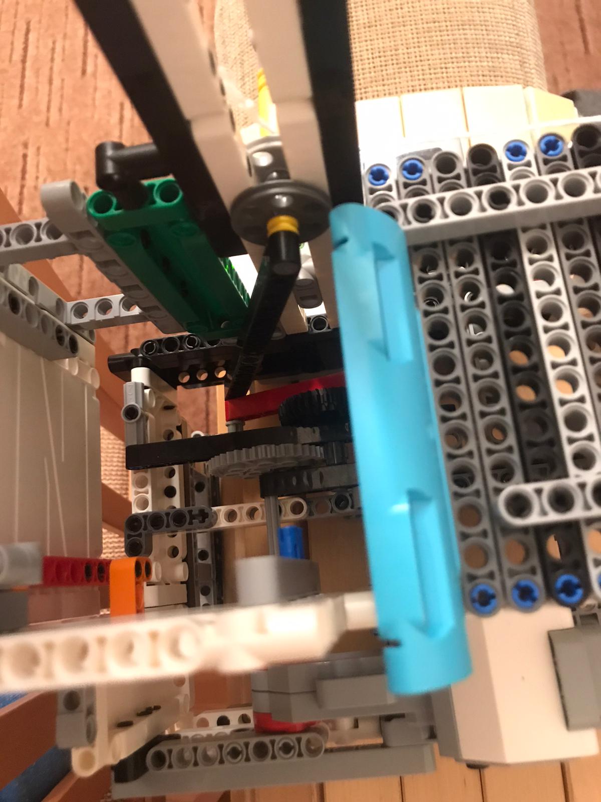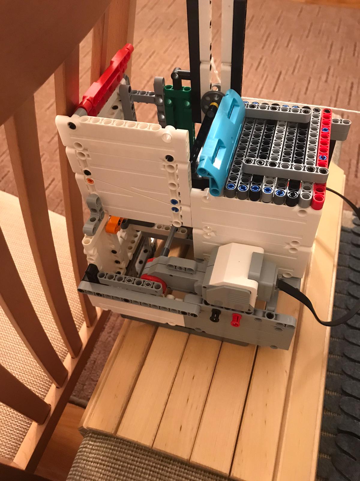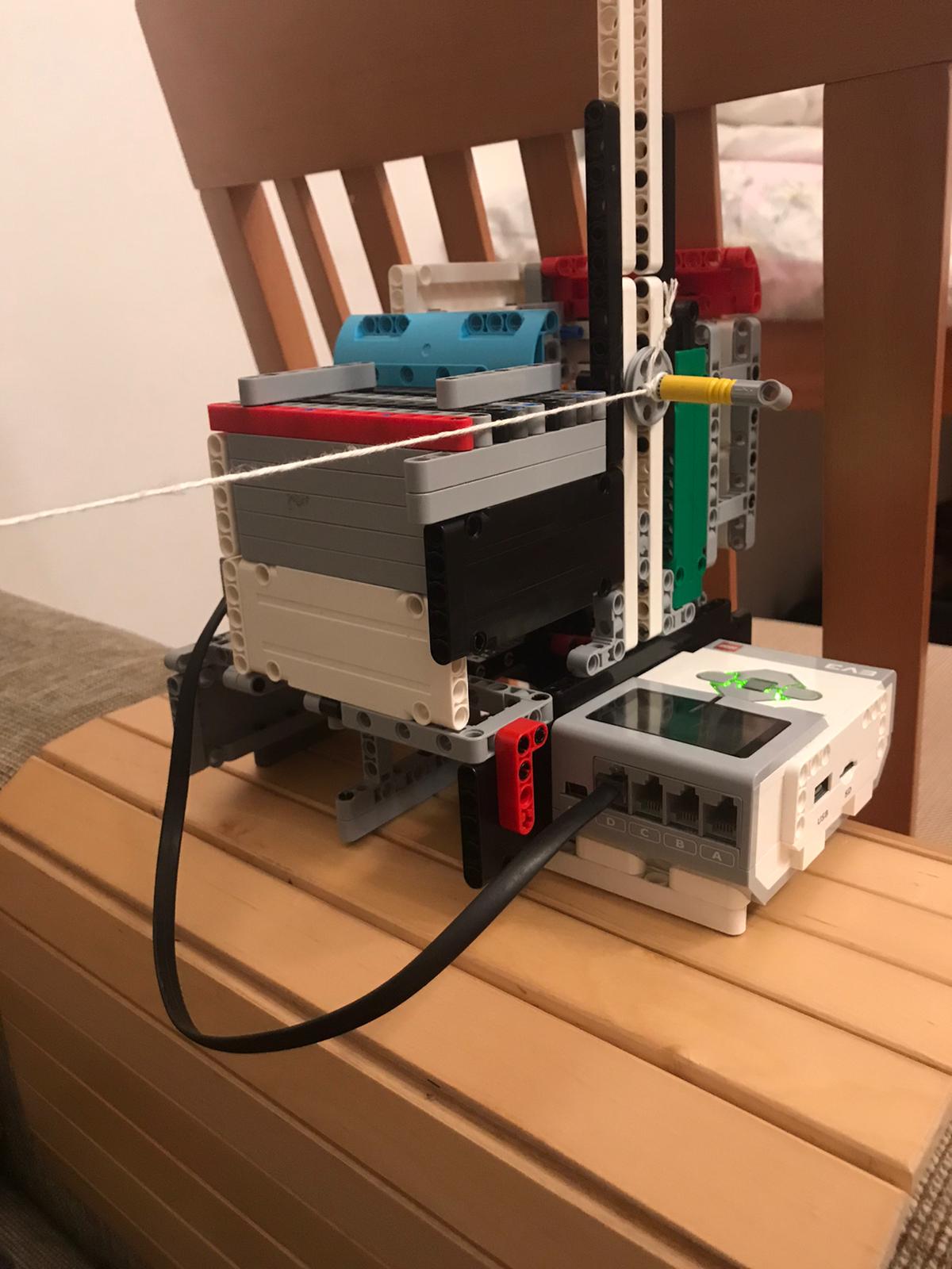 Robota sme úpstavili na štýl šiacieho stroja a obstavali sme ho panelmi. Je sprevodovaný, aby išiel rýchhlejšie. Do vodiacej lišty, sme dali pohyblivého jazdca obstavali ho koliskami aby chodil hore a dole po svojej osi. Sám má "koliesko" aby sa nešúchala tyčka po tyčke. Namiesto závažia je lanko priviazané k radiátoru z určitou vôľou.