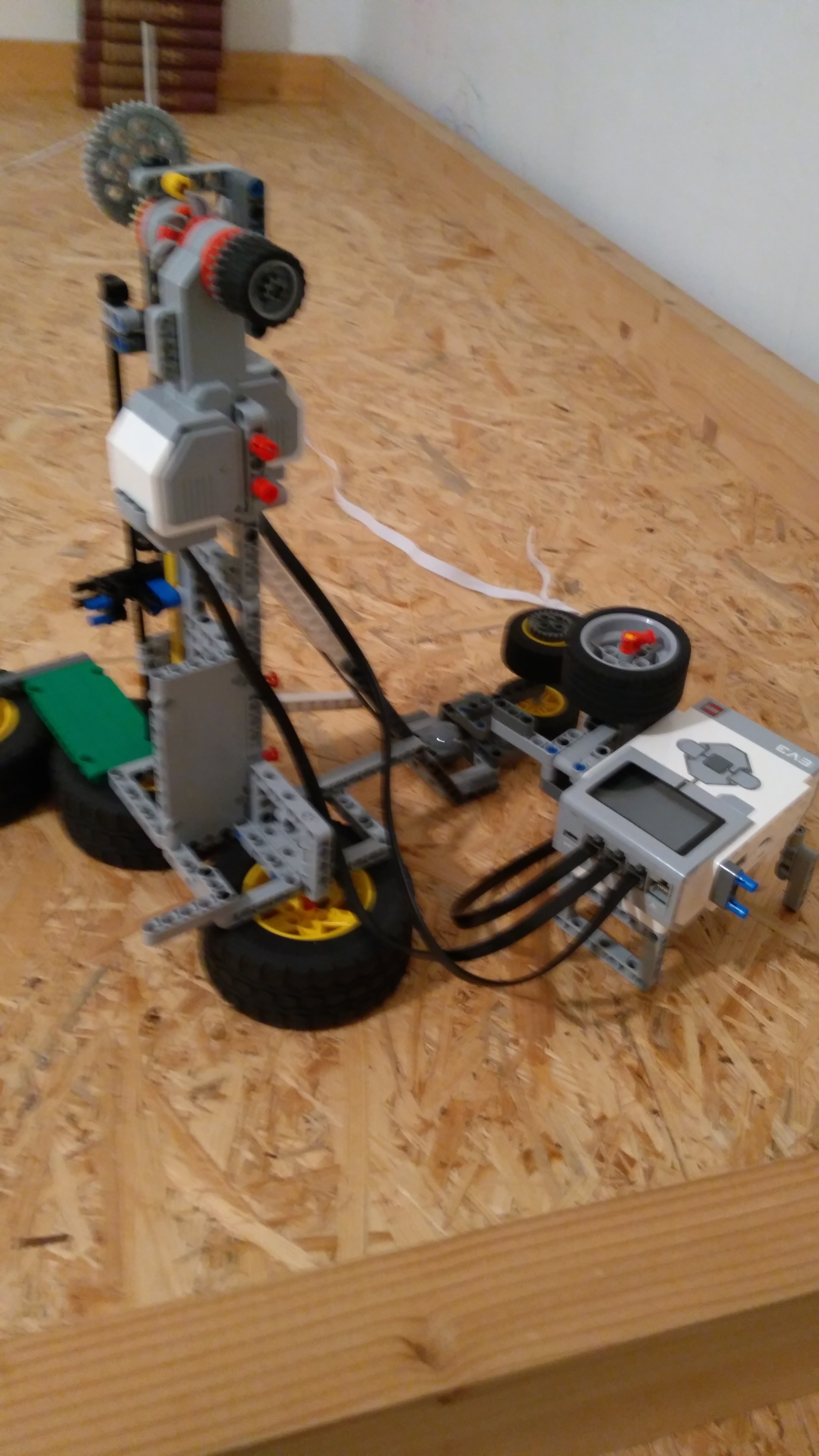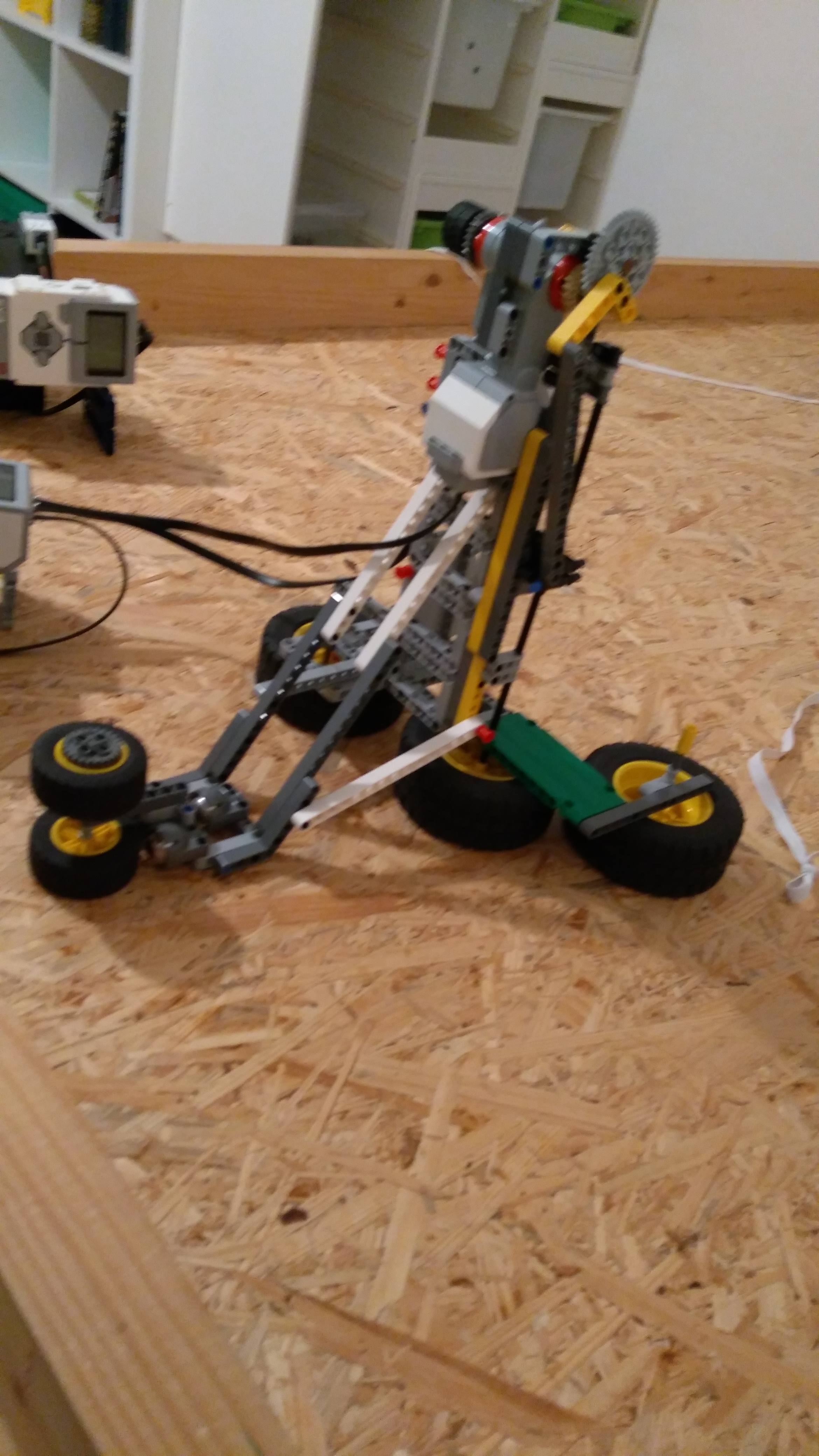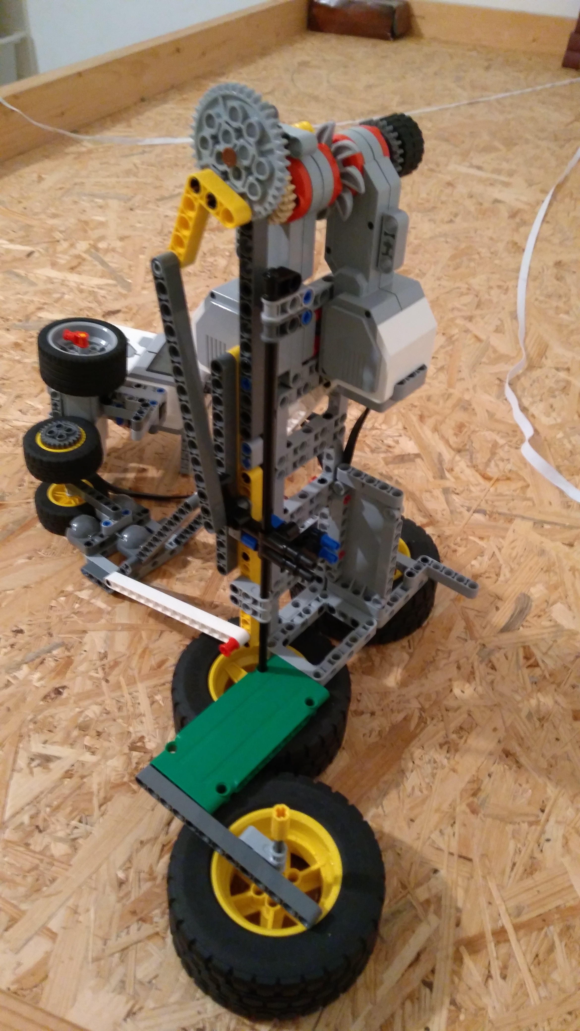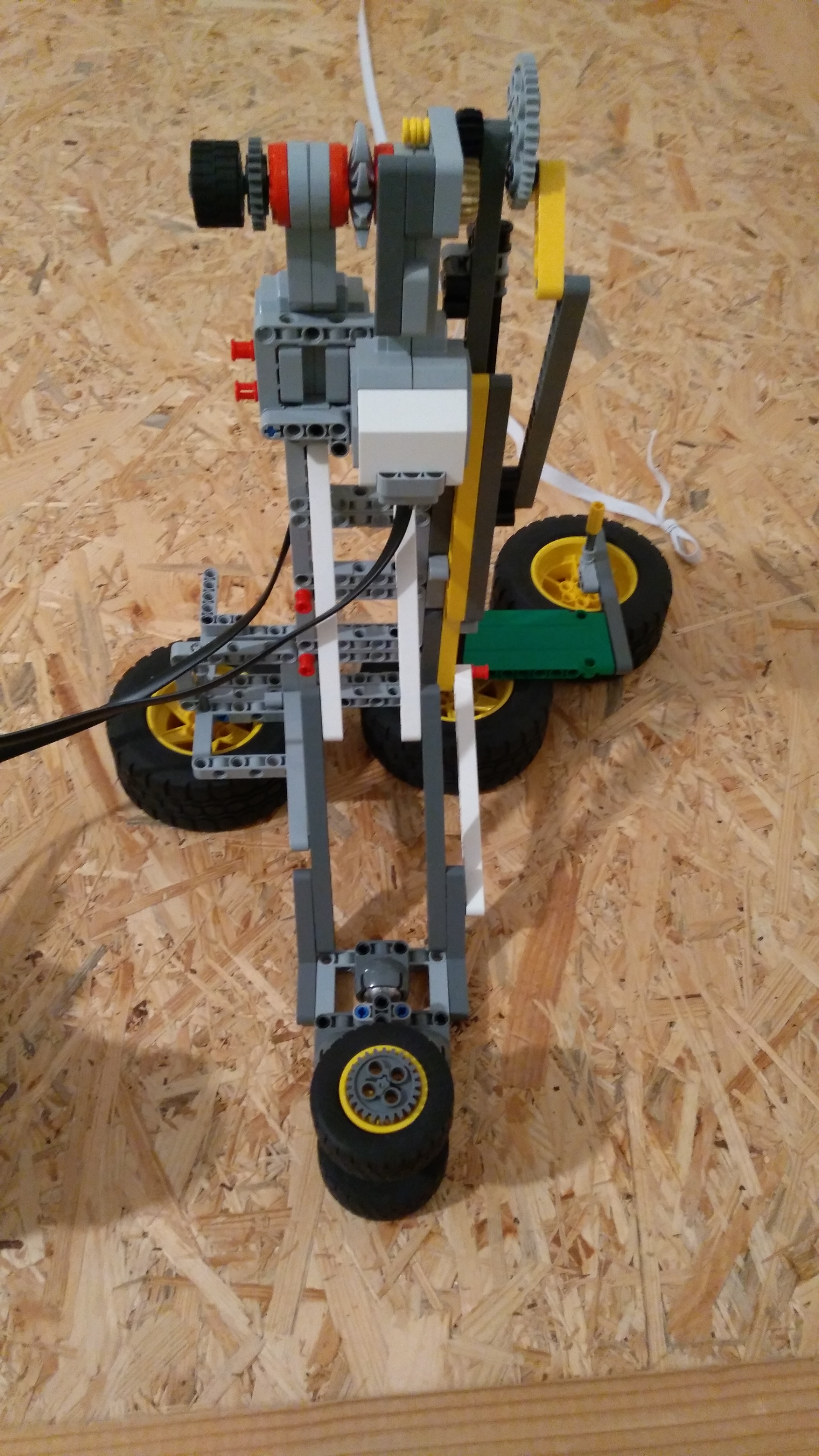 Najprv sme museli vymyslieť prevod rotačného na kmitavý pohyb. Ten sme spravili tak, že sme na motor pripevnili najväčšie ozubené koleso, predĺžili sme ho aby sme mohli mať väčší kmit. Na najväčšiu LEGO tyčku sme pripevnili „jazdca“ prepojili sme ho s ozubeným kolesom a prevod rotačného pohybu na kmitavý bol hotový. Na kocku sme pripevnili motor na regulovanie rýchlosti, s prevodu rotačného pohybu sme spravili vežu, prirobili podstavu a robot bol hotový.
