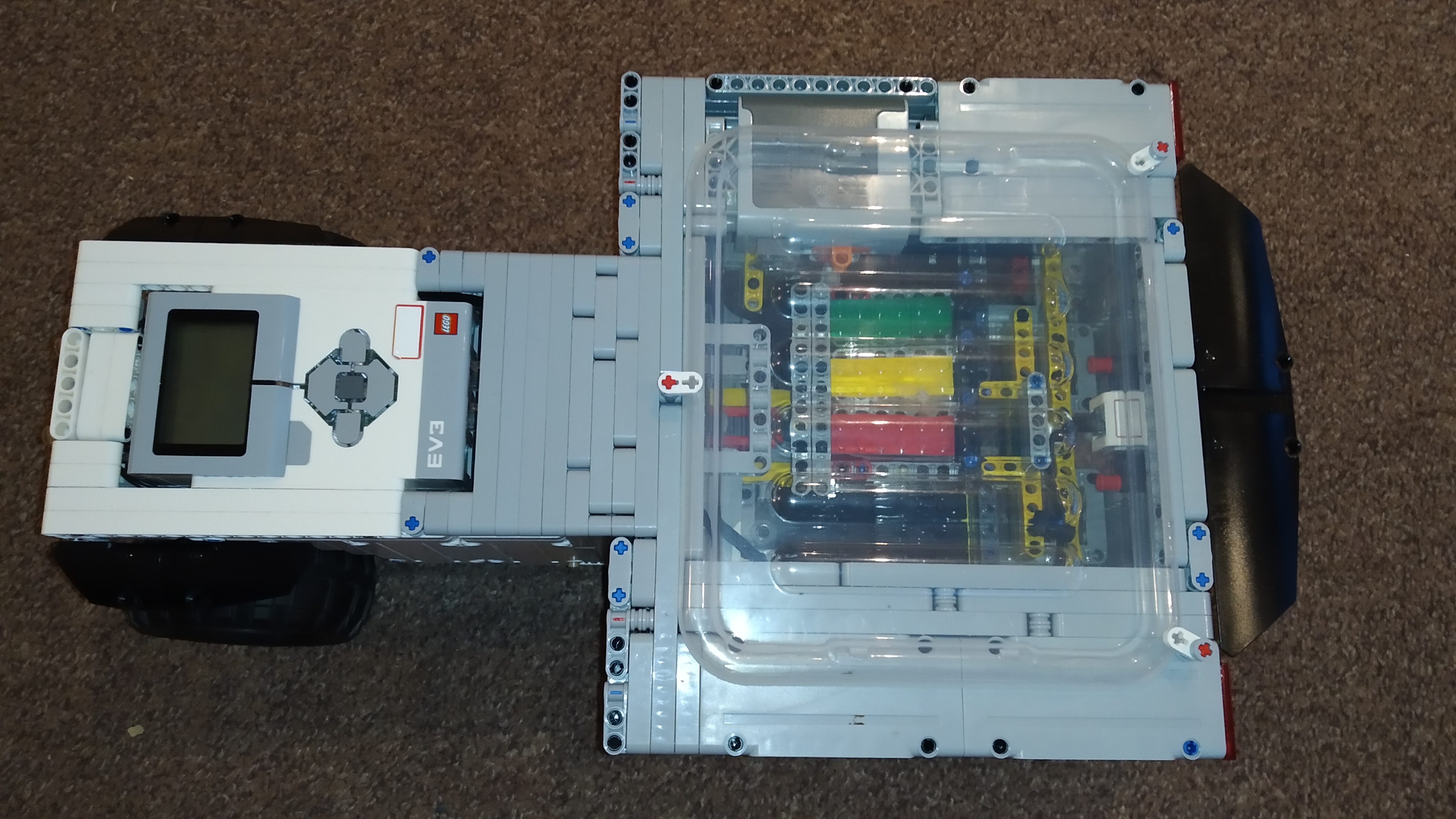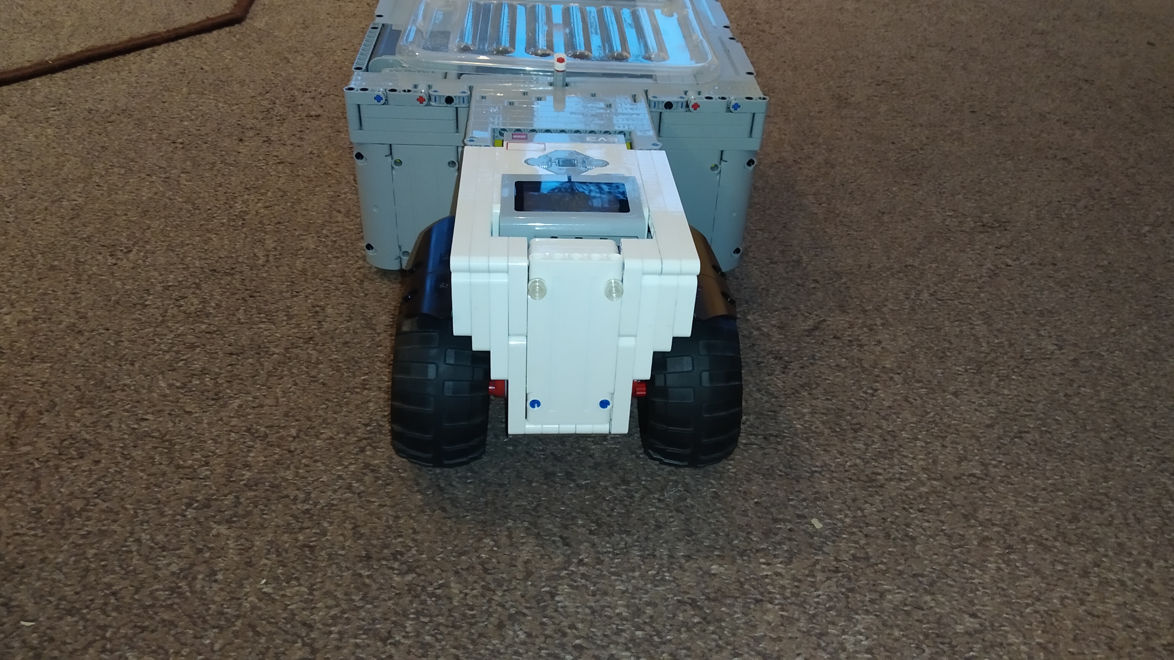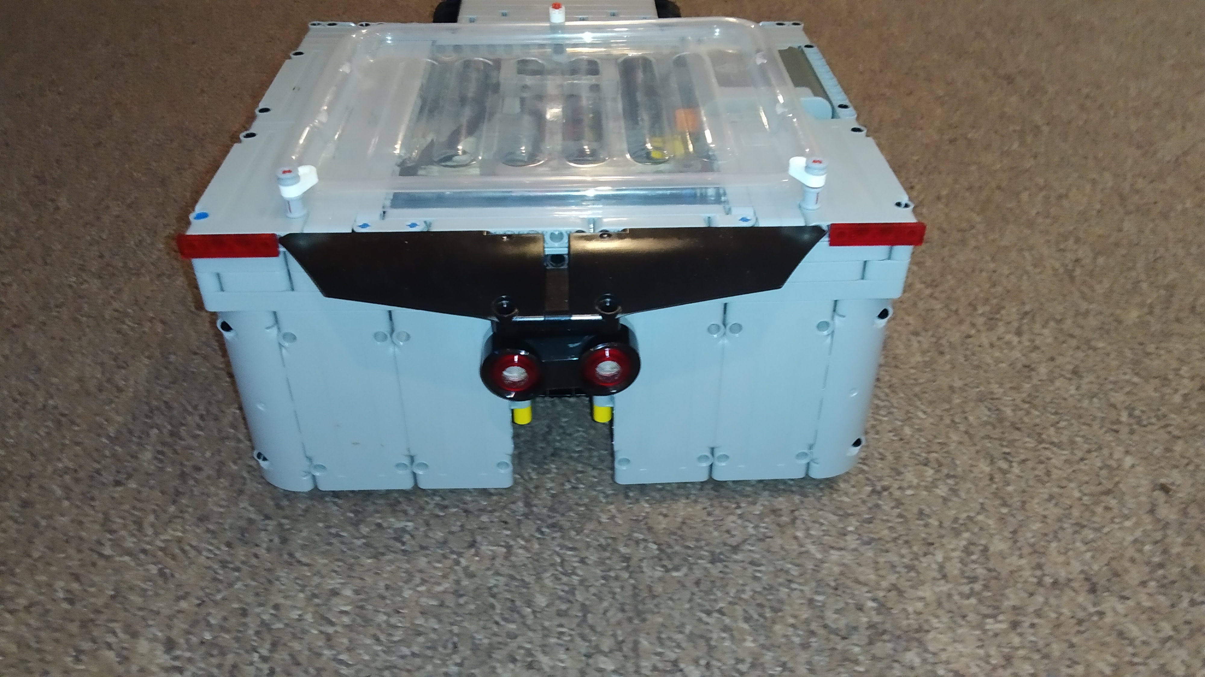 Robot má aj predné svetlá s použitím boxu na batérie a svetiel Power Functions, ako zadné svetlá slúži ultrazvukový snímač (je teda len na okrasu). Navrchu robota je umiestnený priehľadný plastový kryt (došli nám bledosivé diely a nechceli sme mať dieru v streche