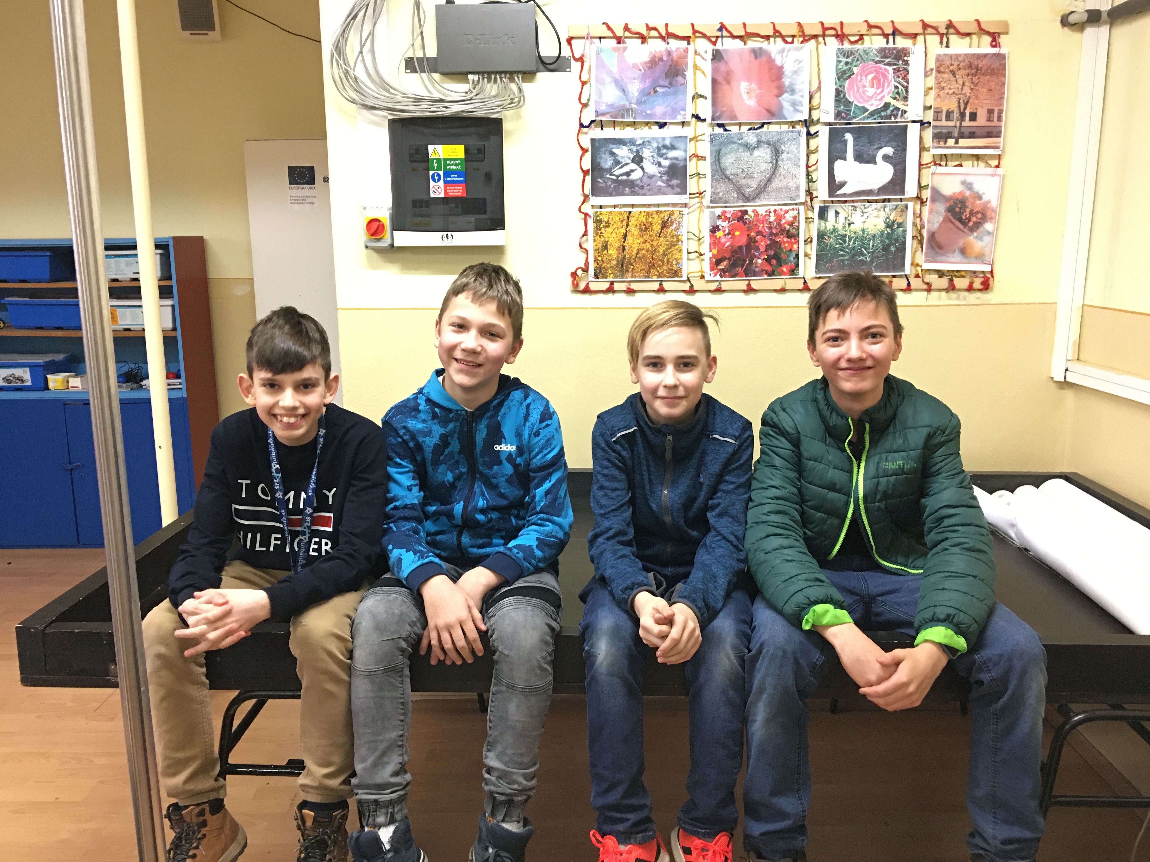 Pozn. vedúceho tímu: Chalani začali s robotikou v polovici Novembra 2019 a na fotografii nie sú všetci členovia tímu, celkovo ich je sedem. Na hodine, keď dokončovali zadanie, neboli prítomní všetci.