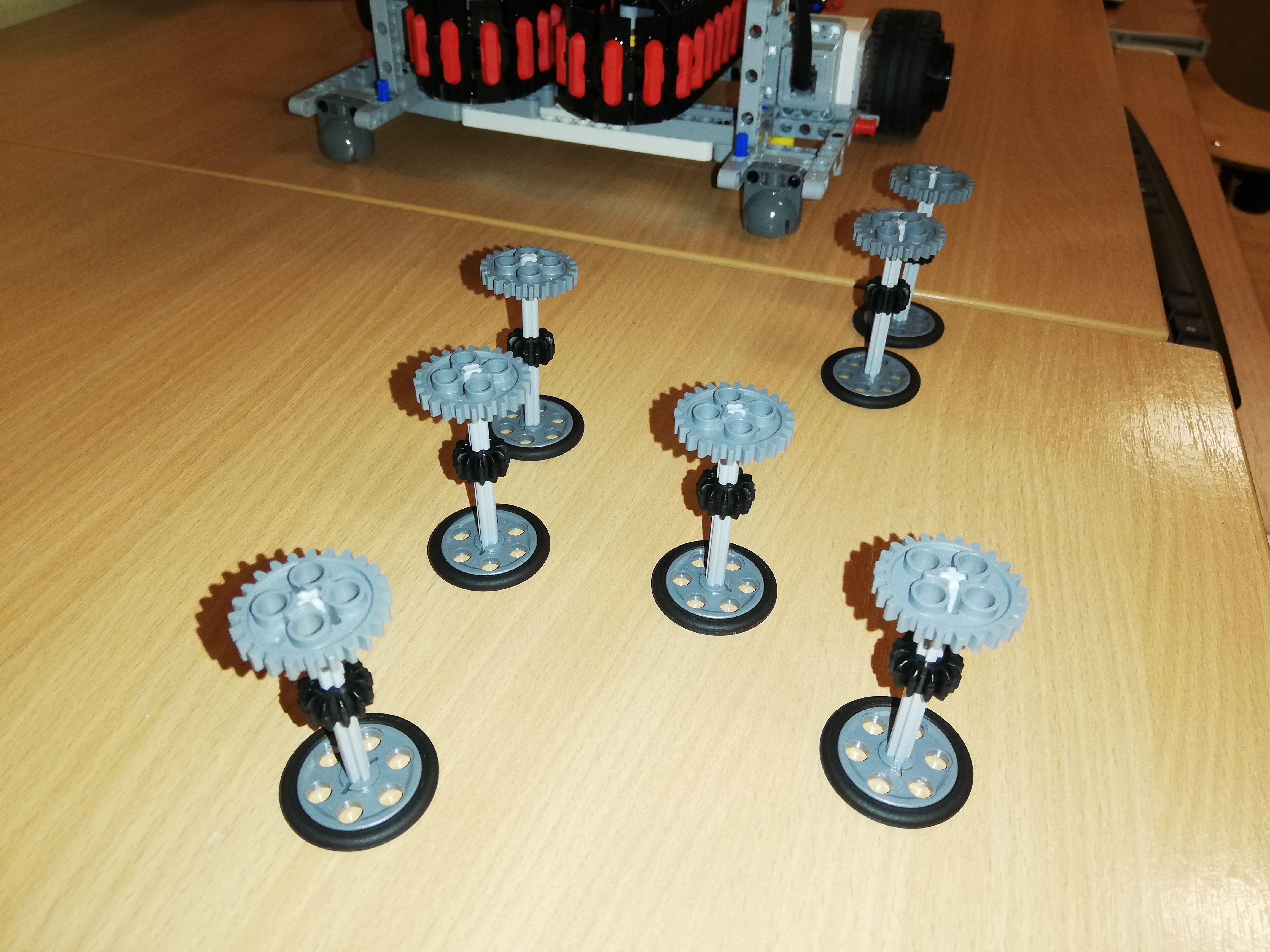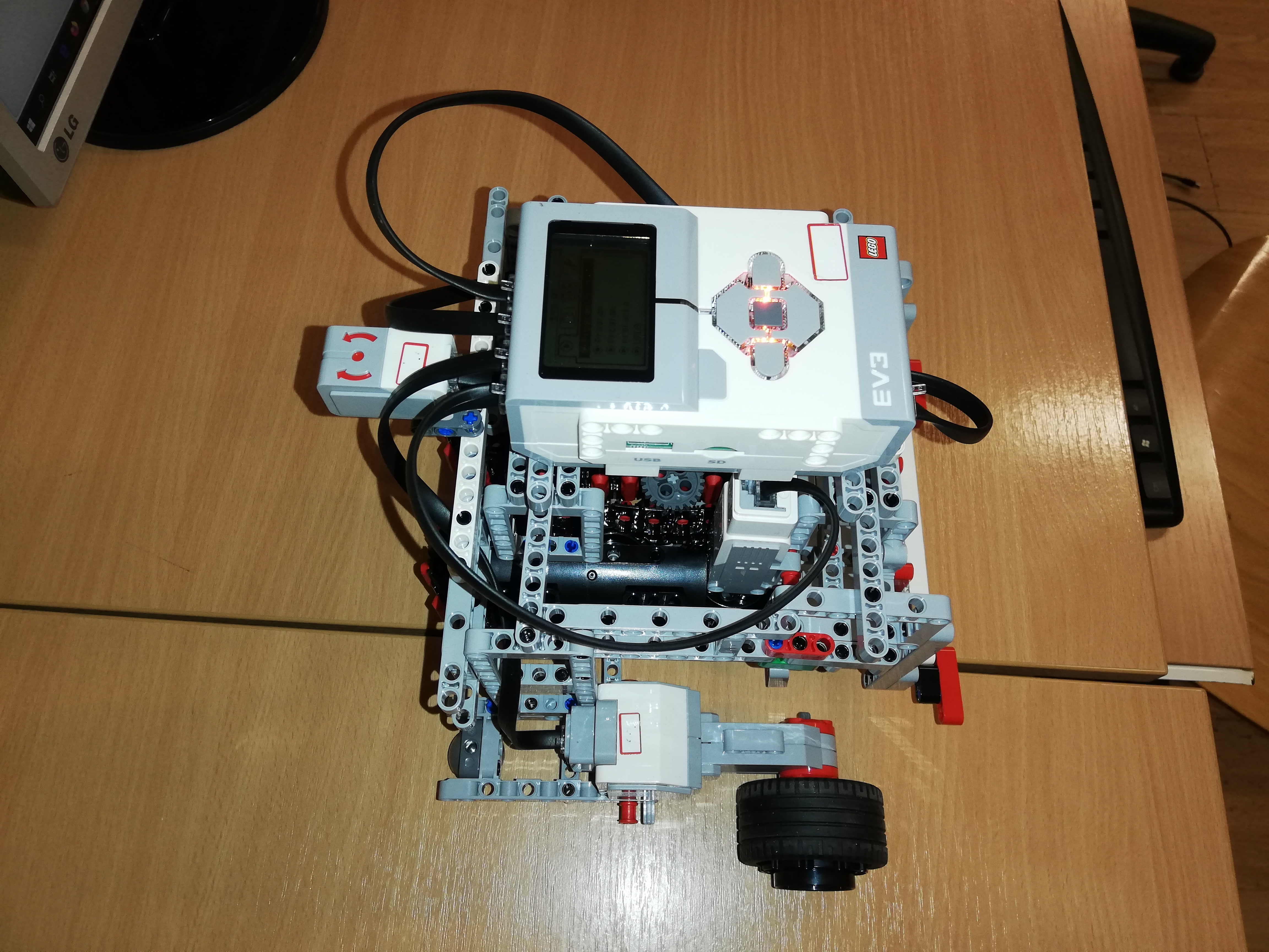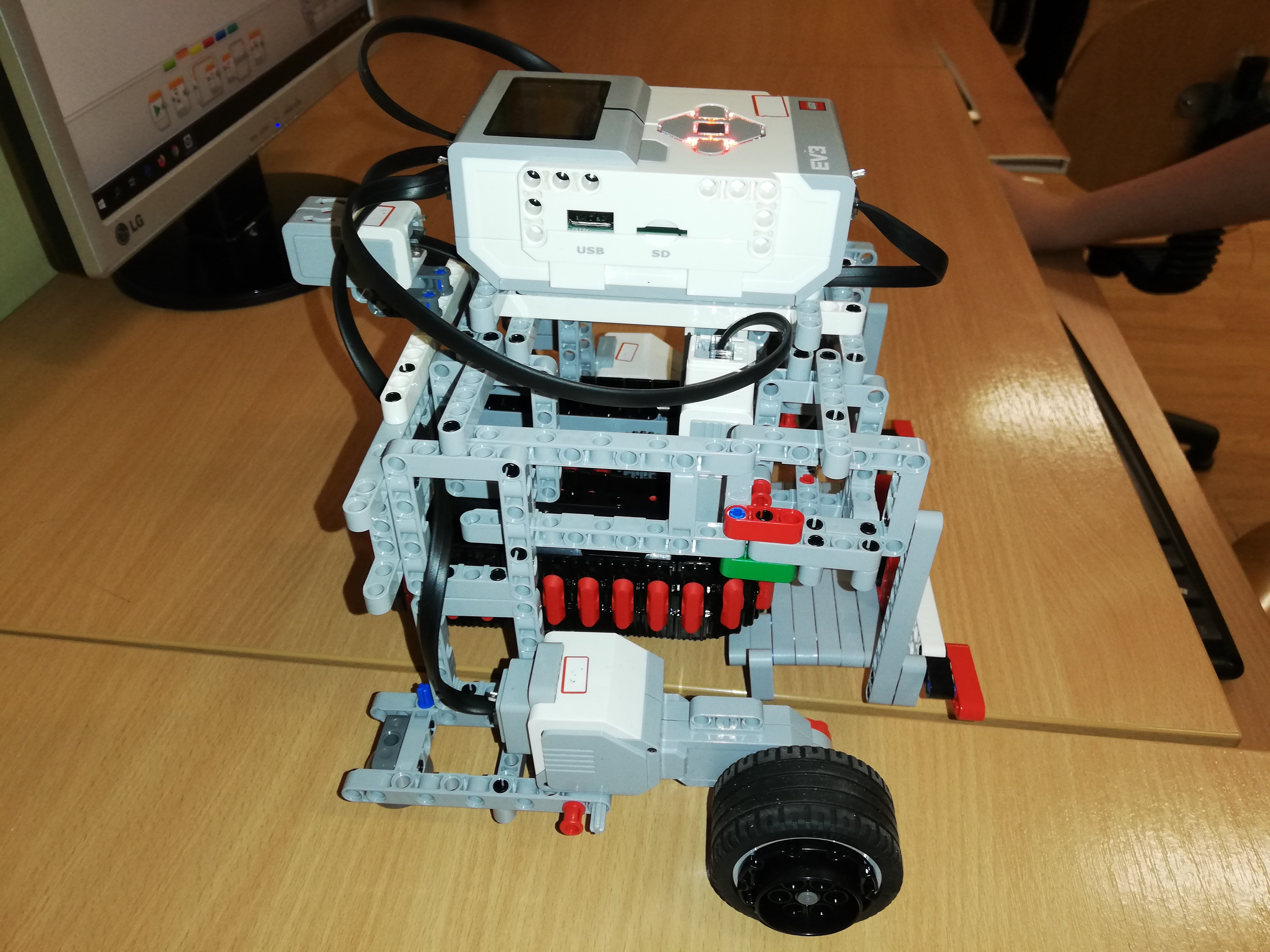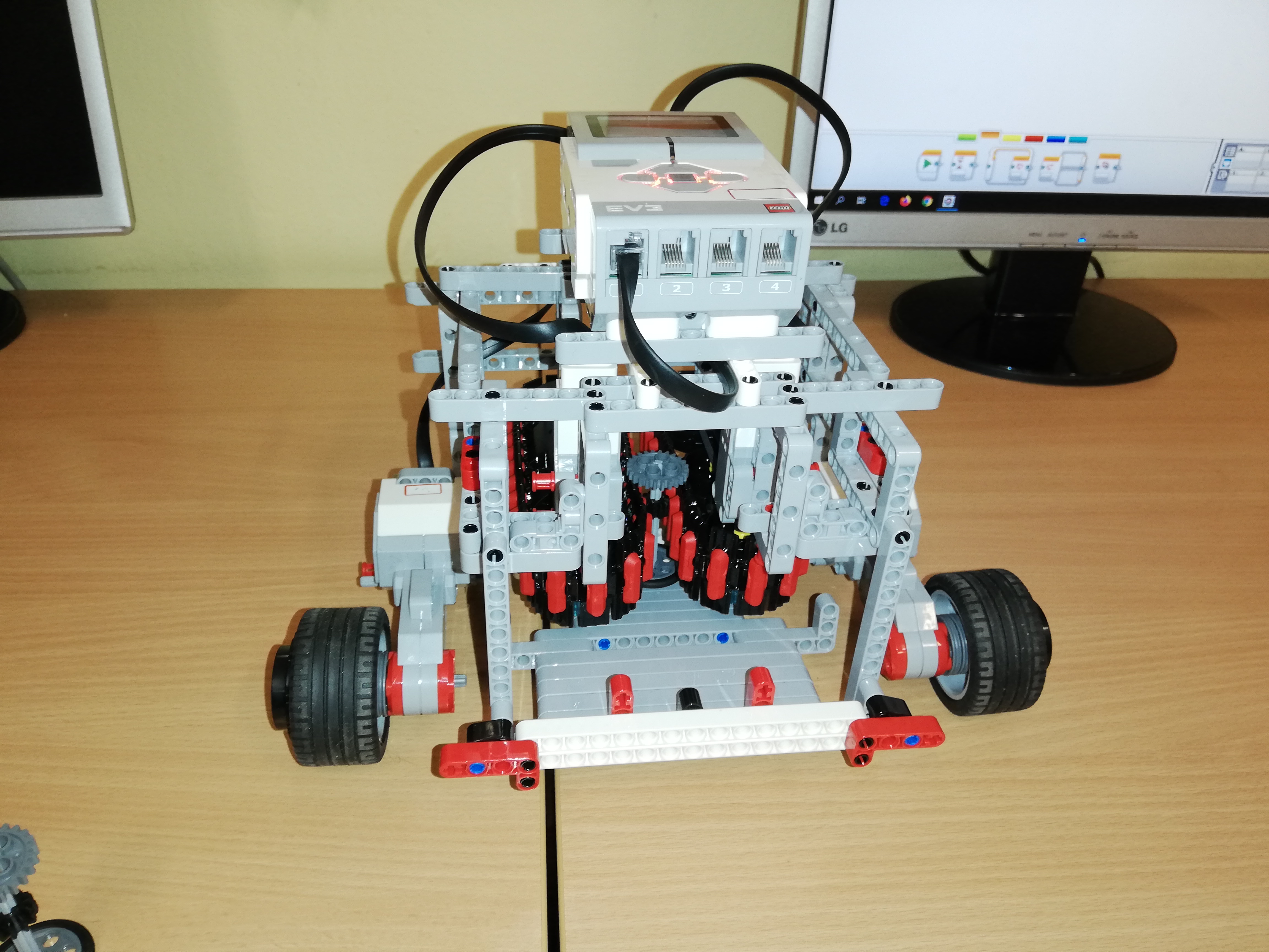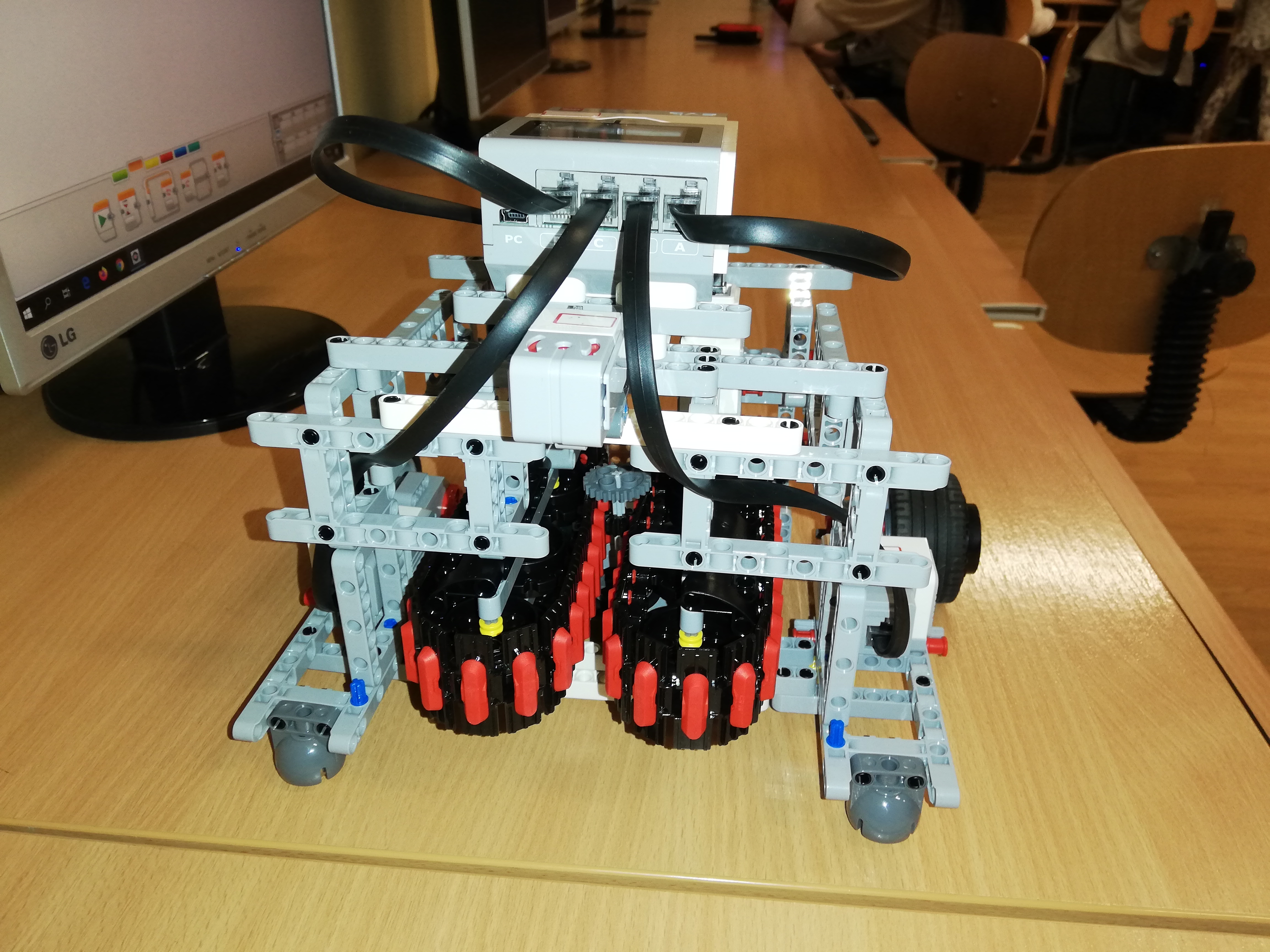 Konštrukcia: Na kostole je veľa roboty, asi tak ako na našom robotovi S konštrukciou robota sme nemali až taký problém. Na stavbu sme použili 2 veľké motory a 2 stredné motory. Celé sme to riešili tak, že strednými motormi, ktoré sa točia opačne, sme si vyrobili akoby posuvné pásy, do ktorých sme naukladali 8 stromov. Snažili sme sa o to, aby stromy sme naukladali do zásobníka vzadu, ale potom sme tie stromy nevedeli ako posunúť do tých pásov. Kocku sme umiestnili nahor celej konštrukcie a na ňu sme napojili po obidvoch stranách dole 2 veľké motory ako kolesá nášho sadiaceho stroja. Stromy sme nakoniec vymysleli tak ako na fotke. Dole je širšie koliesko, aby malo čo najväčšiu podstavu. Tým sme chceli docieliť to, aby po spadnutí stálo pevnejšie, čo sa nie vždy napokon podarilo. Vysoké je dvakrát toľko aký je priemer kolieska. V strede tyčky je čierne ozubené koliesko, ktoré sa zasekáva v tých posuvných pásoch. Program: S programom sme mali väčší problém, keďže sme v tom začiatočníci. Na vysádzanie sme použili 8 stromov. Chceli sme sadiť stromy do poľa 2x4, čiže v dvoch radoch po 4 stromy. Program sa začína tým, že sa pohnú pásy len o 0,1 otáčky, čím spadne prvý strom, potom sa pohne robot o 2 otáčky dopredu. Tento cyklus sa opakuje 4 krát. Potom sme sa snažili otočiť robota o 180 stupňov, aby išiel akoby do druhého radu a vysadil ďalšie 4 stromy. Teda ten istý cyklus sa zase opakuje. Úlohu sme celkom nesplnili, ale na začiatku sme mysleli, že sa ani nezapojíme a potom už nebol čas vylepšovať nedostatky a dotiahnuť program dokonca. Chcelo by to ešte sa pohrať s presnou otáčkou, aby sa robot otočil presne do druhého radu a asi aj predĺžiť pásy, aby sa tam zmestilo viac stromov, aby ostali po vypustení stáť. sovicky
