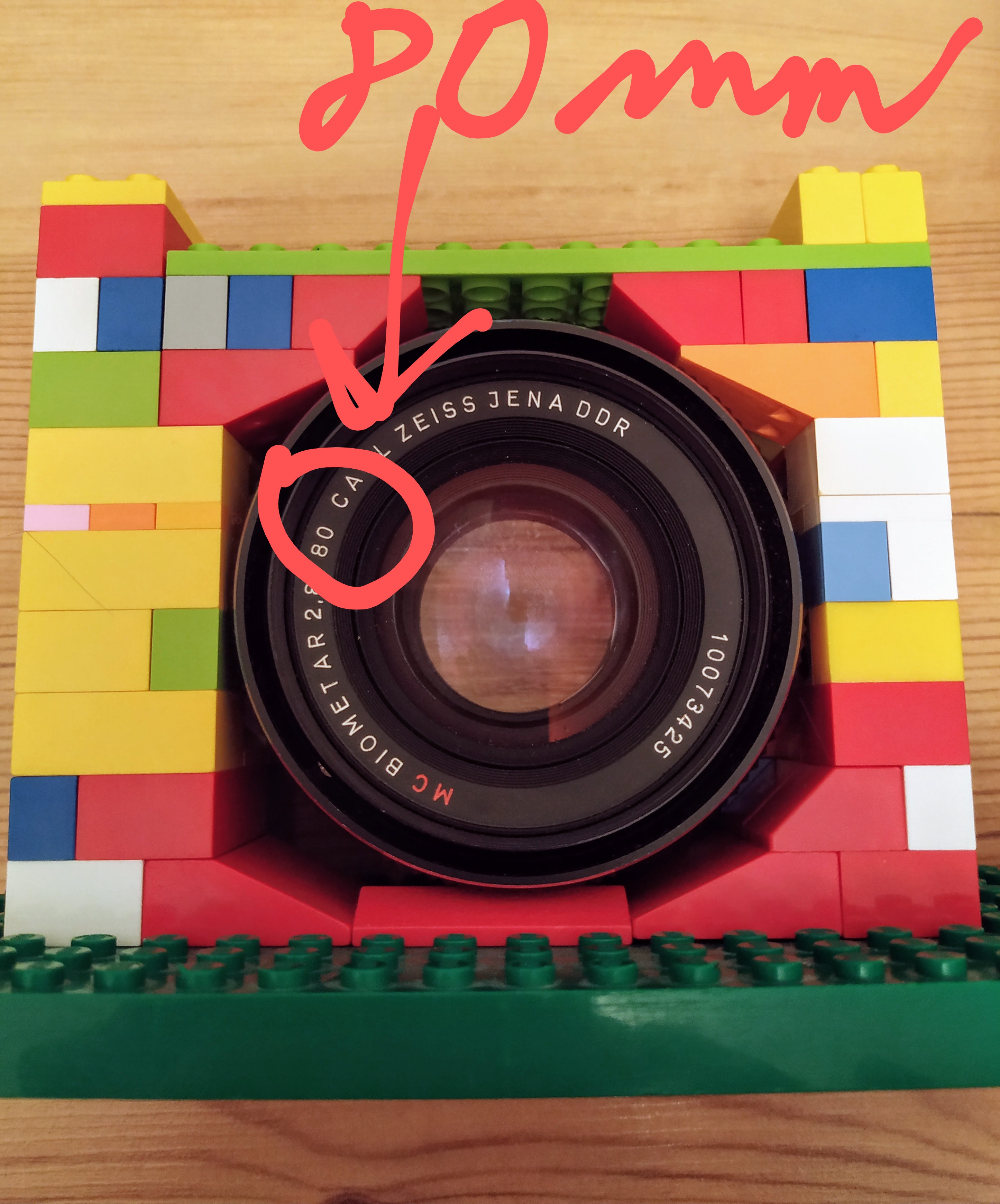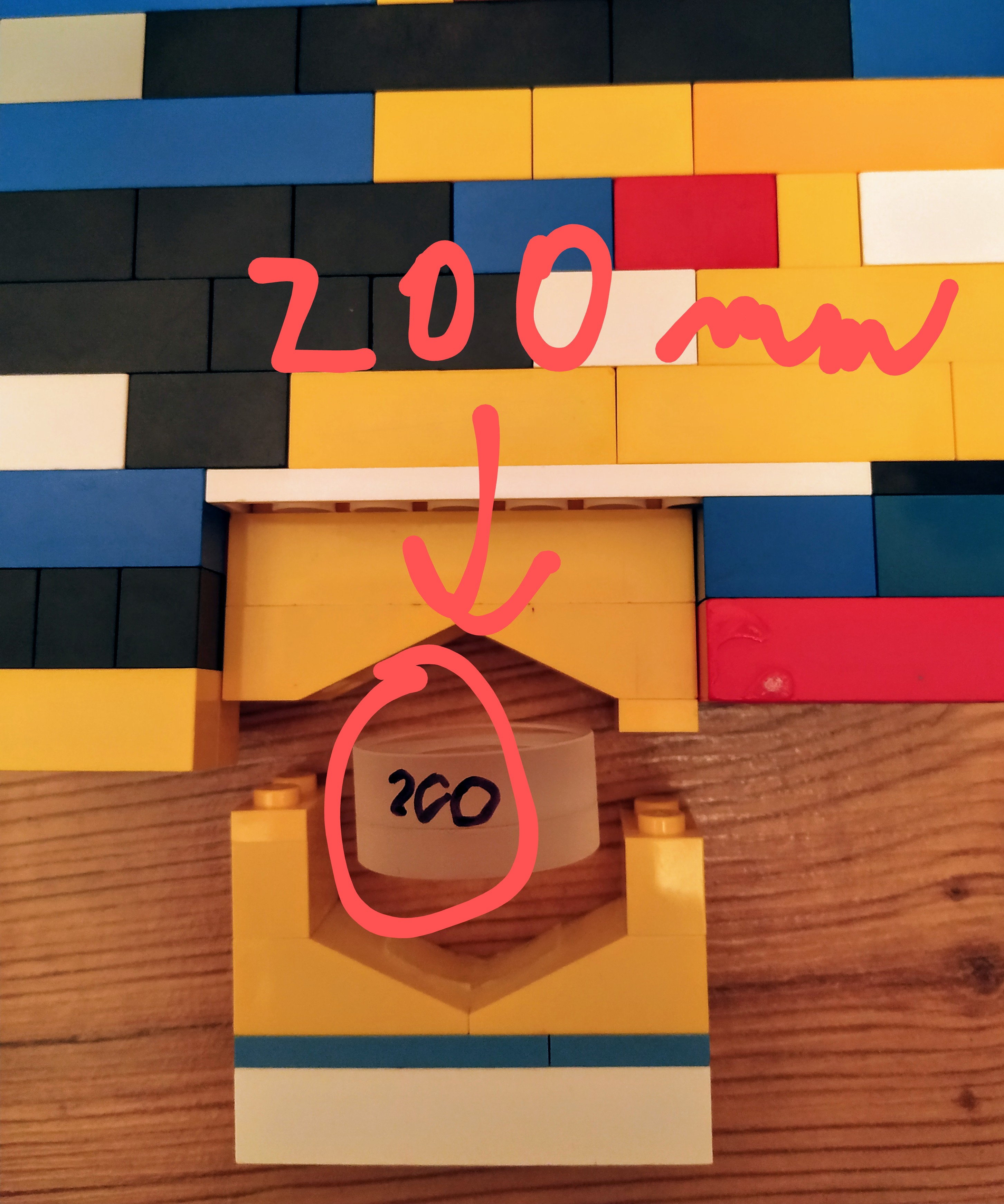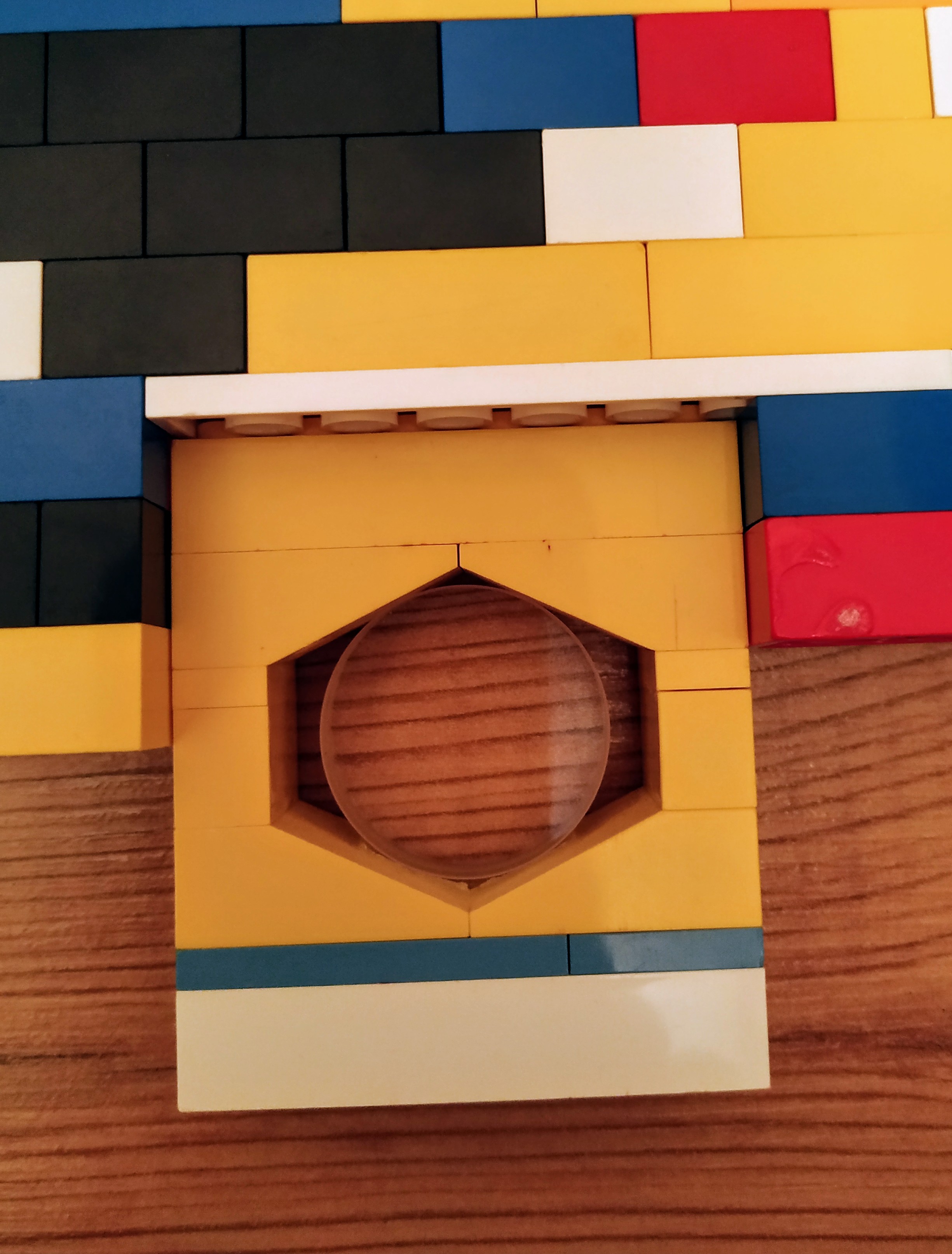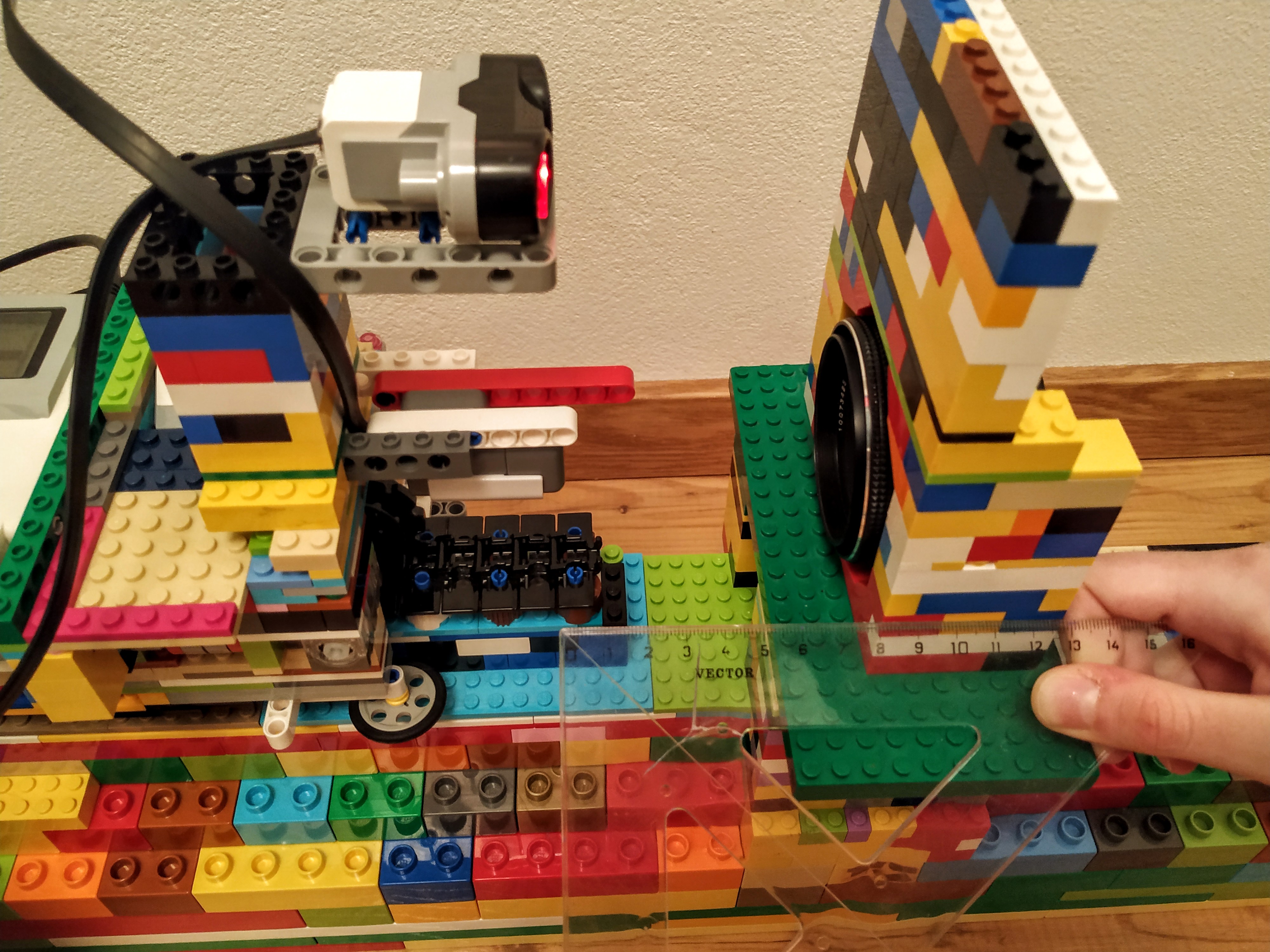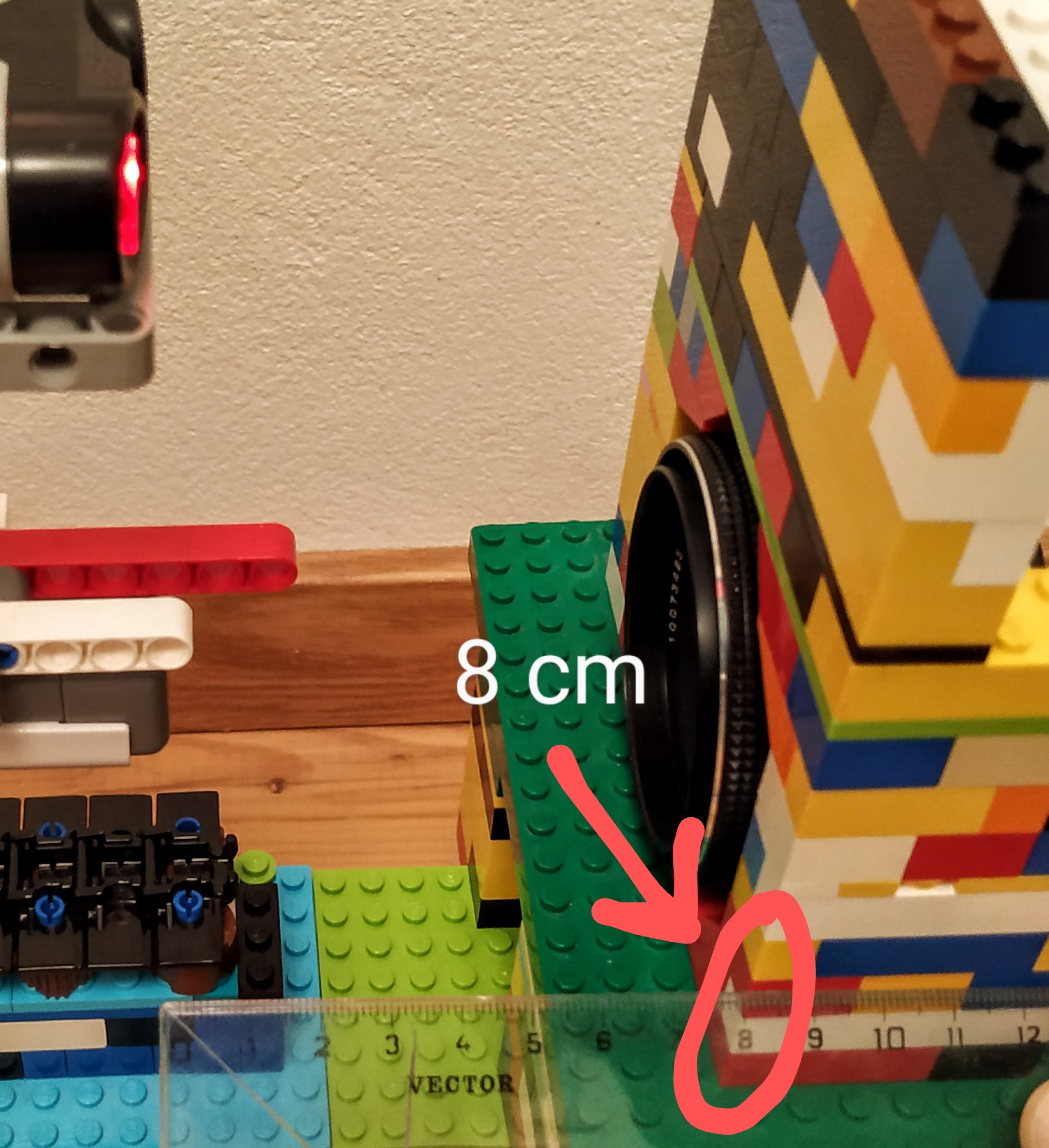 V strede je umiestnená šošovka tak, aby jej optická os prechádzala (približne - s tým sa vysporiadáva program) cez Light senzor. Na vrchu šošovky je stena z lego kociek, aby sa signál ultrazvukového senzora mal od čoho odraziť.